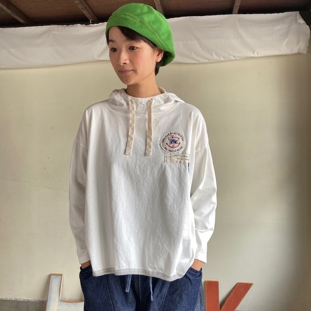 ◇ブランドについて・・ 作品ごとに愛情がこもった丁寧なモノづくりをされるカジュアルブランドです。レディース中心ですが、一部のシリーズはユニセックスで展開しておりますので男性やメンズっぽいデザイン・サイズ感が好きな女性も取り入れやすいです。また素材にこだわっているというだけではなく、着た時のシルエットや肌当たりにも細やかな配慮がみられ、着る方に寄り添った優しい作品群は多くのお客様を魅了しています。 全体にゆったりとした着こなしが好きな方におすすめではありますが、ゆったりしてるのにすっきりと着こなせる、そういった不思議な魅力があるブランドです。ぜひ作品を通じてその魅力を共有していただきたいです。 ☆当店にとっては取り扱いをスタートし、3シーズン目になる2023年の秋冬ものの販売。2022年はtシャツも含めて入荷した全ての作品が完売でした。また、東京の恵比寿アトリエにて行われるバイヤー向けの展示会にも毎回参加し、快晴堂さんの世界観を共有させていただきました。次のシーズンへ向けて準備された生産予定の作品と作り手さんに囲まれて、その魅力に触れることができるとても素敵な時間です。知識はもちろんのことその「わくわく」を早く自店の馴染みのお客様と共有したい!と感じながら帯広へ帰ってきます。 ◇HAYATE・CCBY AFTER HOURS WEARについて(この作品の生地)・・ アメリカ、ニューヨーク州南東部の大西洋に浮かぶ島、ロングアイランド。島の突端には架空の小さな造船所、『CAPE COD BOAT YARD』があります。略して『CCBY』。生地は『日本綿布』による6オンスデニム。力織機で織り上げたインディゴデニムは快晴堂の定番生地です。伝統的な織機で織り上げたデニムは、ふっくらとした風合いで軽やかな生地なので、ステッチを効かせて立体感のあるきれいなシルエットとカジュアルさのバランスが良いシャツとなっております。 ボーダーや色のあるカットソーを重ね着すると、デニムシャツからちらっと色が見えてインディゴカラーが引き立ちます! ◇作品について・・ 特徴があるプルオーバー。マリンコーディネートの雰囲気を演出してくれるようなかわいい作品です。快晴堂の軽やかなパンツに合わせたり、夏場はショートパンツに合わせたりも素敵なのかなと思います。 ◇コットン素材のお洗濯・・ こちらの作品はコットン製品ですので、お洗濯していただいても大丈夫です。適度に柔らかい素材なので、干す際に幅のあるハンガーを使っていただくと跡がつきにくいです。また、ネットに入れていただき優しくお洗濯をしていただきますとシルエットをきれいに保てます。 ※※※※※ 素材 : COTTON−100% ライトオンスデニム(6オンス) 日本製:水洗い サイズ3+ 着丈 ( 後ろ中心 ) 63cm 身幅 64cm 肩幅 62cm 袖丈 43cm 裄丈 74cm 袖幅 20cm 袖口幅 14cm 裾幅 64cm サイズ5+ 着丈 ( 後ろ中心 ) 68cm 身幅 64cm 肩幅 64cm 袖丈 51cm 裄丈 83cm 袖幅 21cm 袖口幅 15cm 裾幅 64cm 着用モデル身長 162cm お手入れ方法:家庭洗濯可能 ※※※※※ 送料について・・ ゆうパック対応の商品の中で梱包サイズがあまり大きくない商品をお買い上げいただいた場合は表示の送料よりお安くできる場合があります。その際はこちらで決済金額を減額いたします。 また、複数点をまとめ買いをいただいた場合も同様です。 事前に金額をお知りになりたい方は、遠慮なくご相談くださいませ。