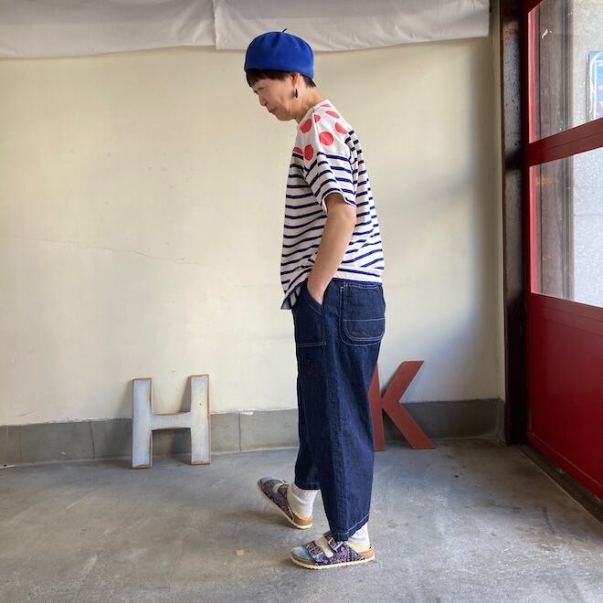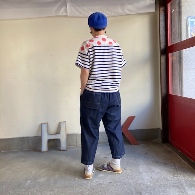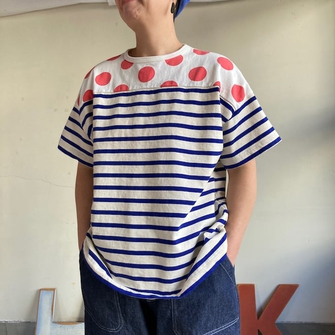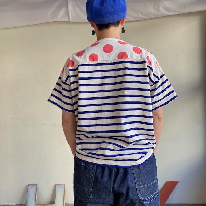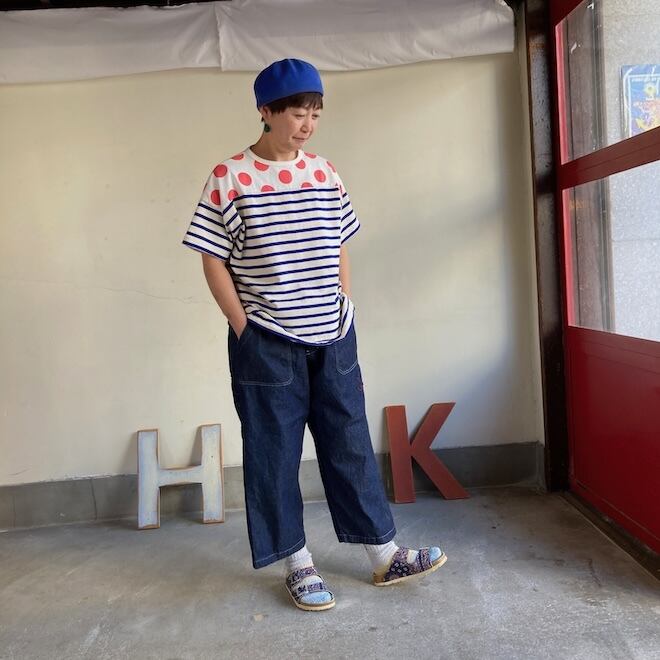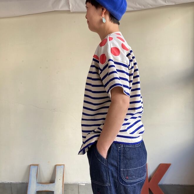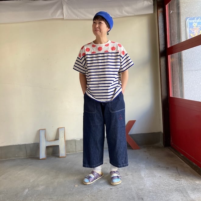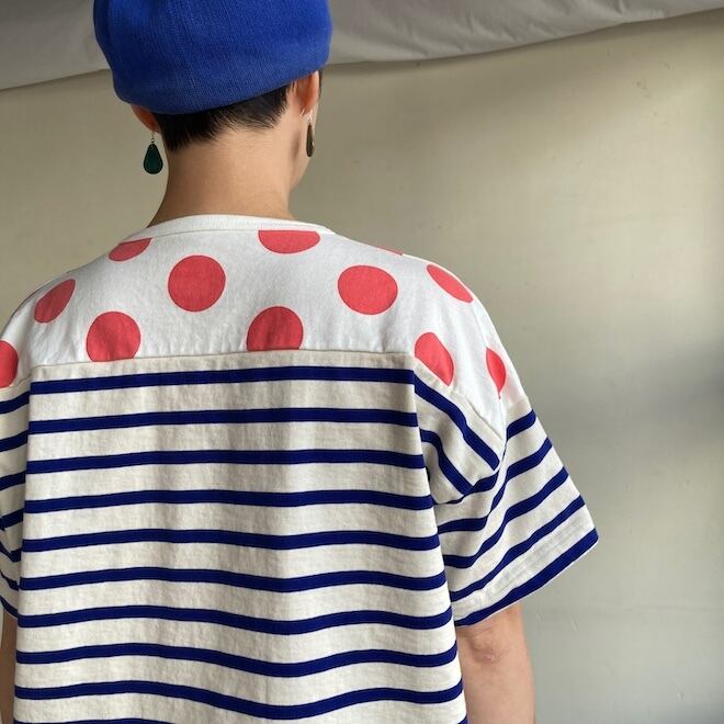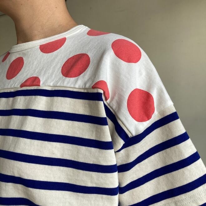 こちらの作品はボーダー柄に肩の部分に水玉柄を切り替えたかわいいデザインです。快晴堂らしい雰囲気ですね。