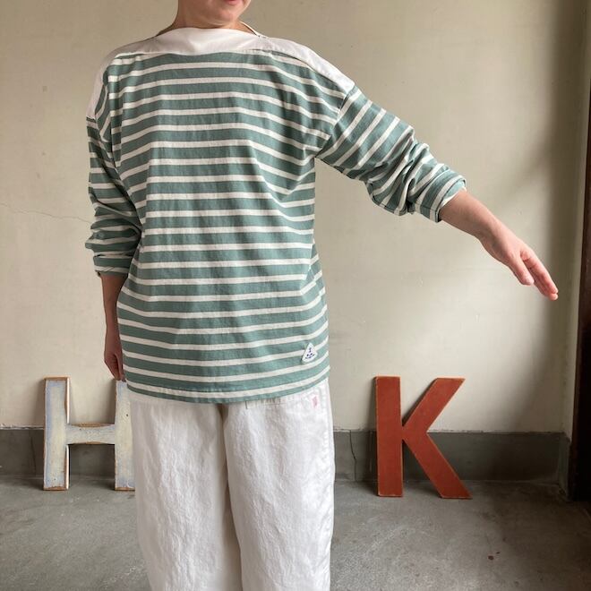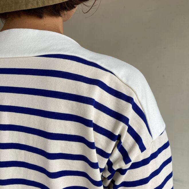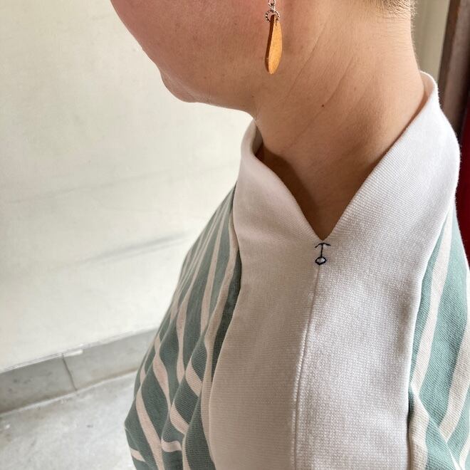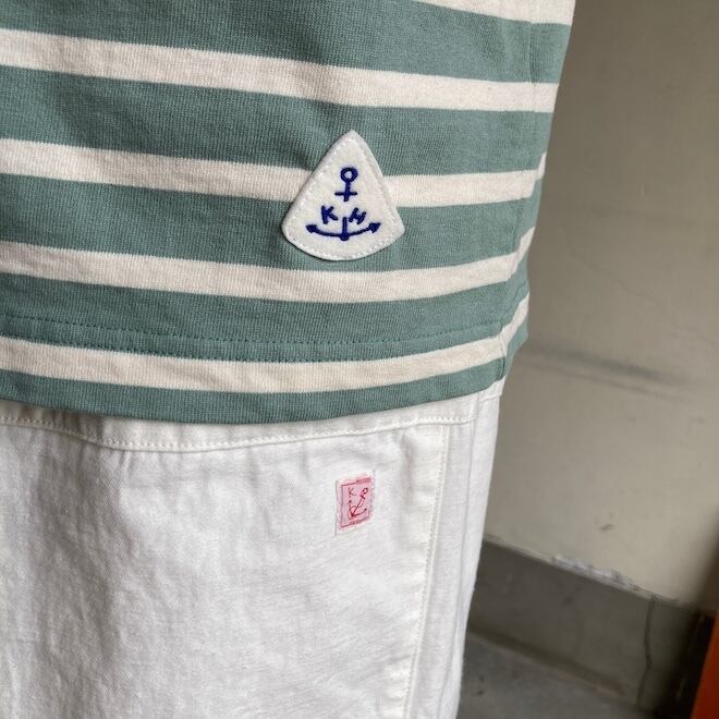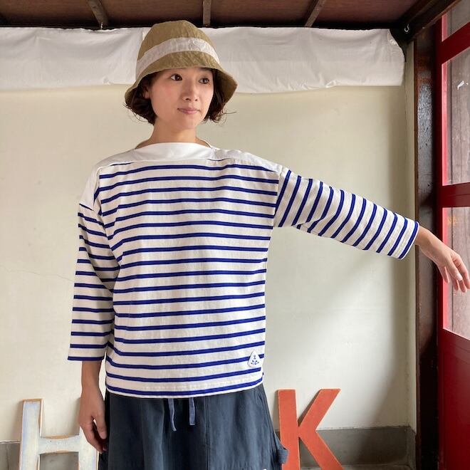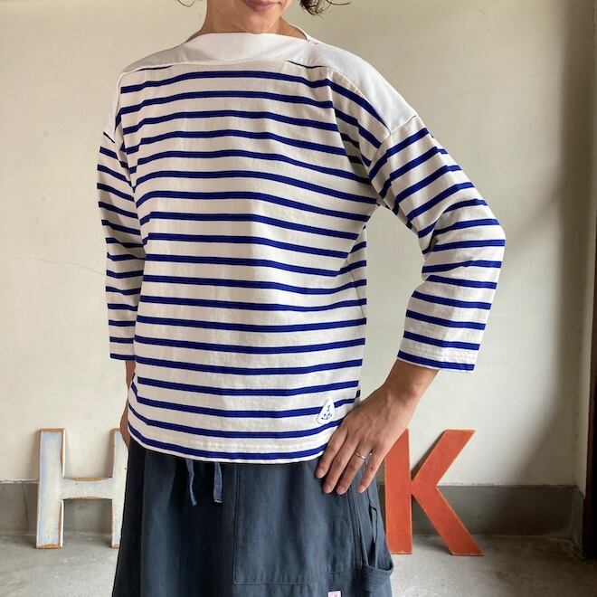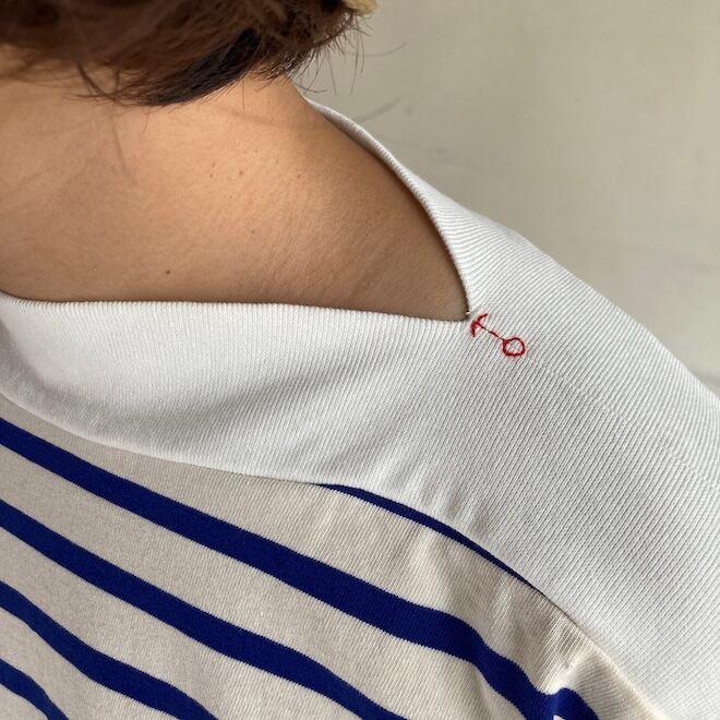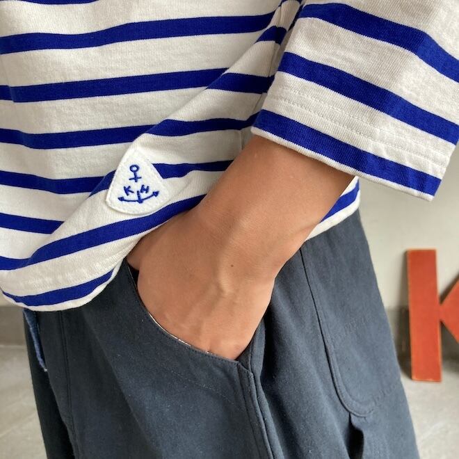 こちらの作品はかわいいボーダー生地だけでなく、肩の部分の生地が切替になっていたり、錨刺繍が施されていたり、シンプルな中にも快晴堂らしい遊び心が準備されております。3+は八分袖、5+は長袖となっております。
