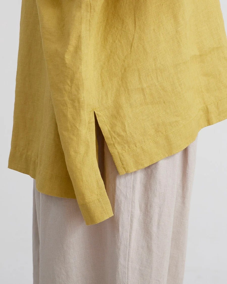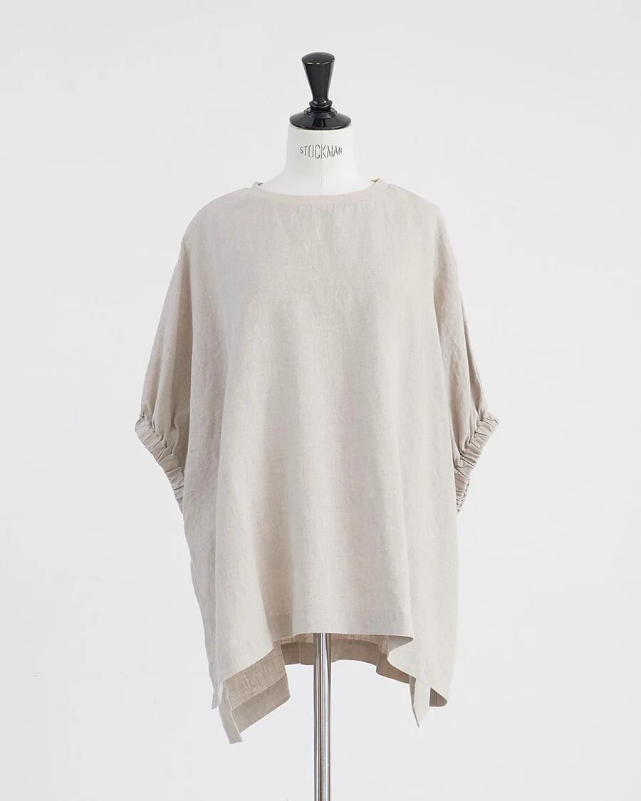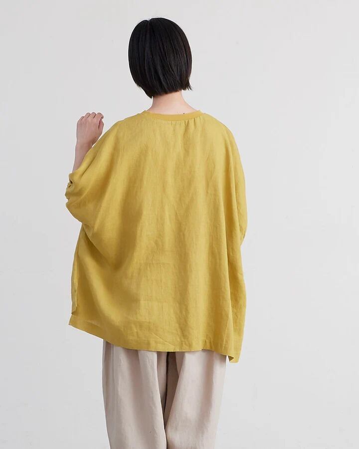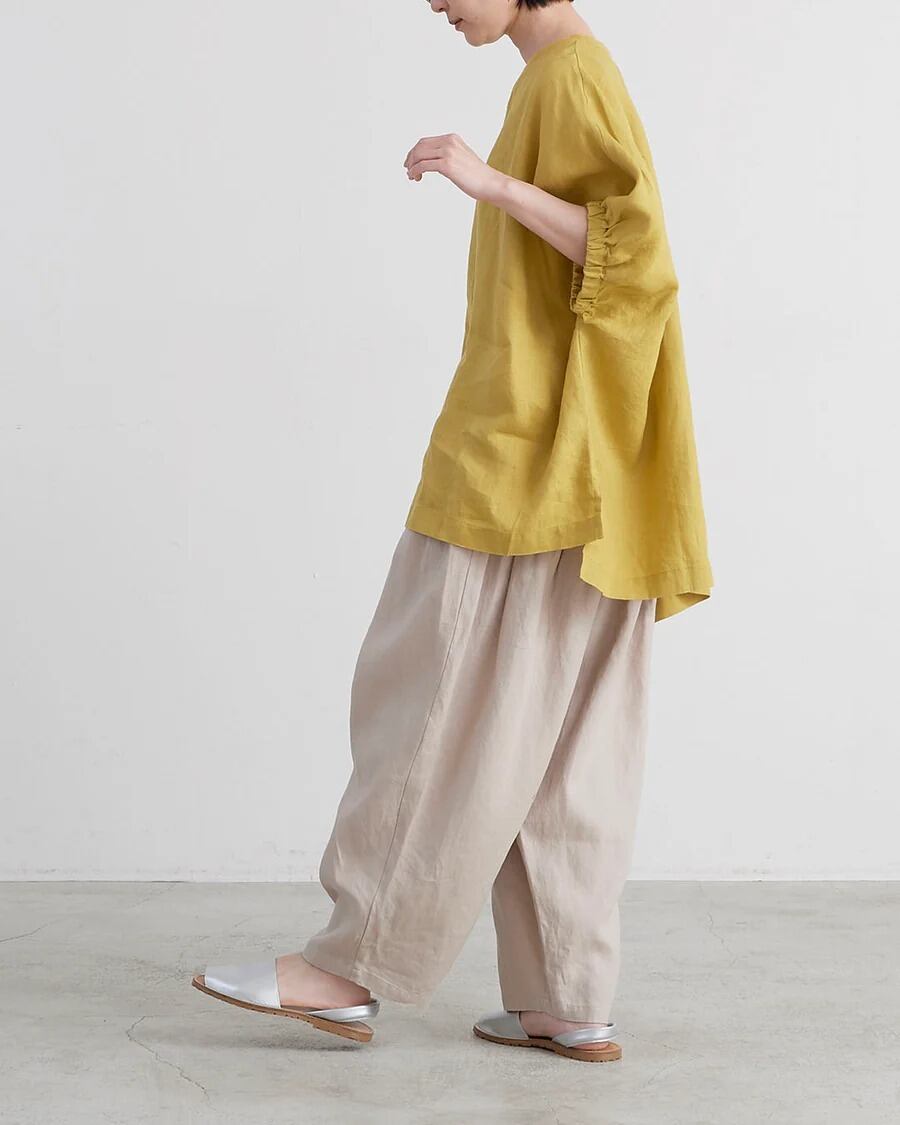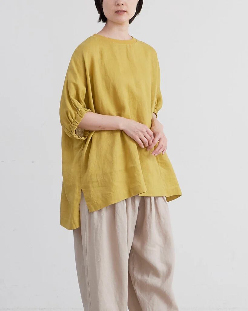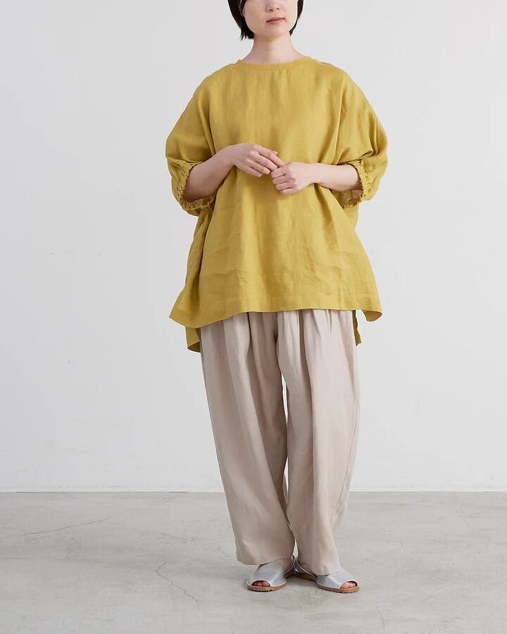 □ 定番で使用している厚すぎず薄すぎないリネン生地を使用。 □ シンプルなボディに袖口のギャザーのボリューム感。 □ 首まわりはリブ仕様にしカジュアルダウン。 □ ゆったりとしたストレスフリーなシルエット。 □ 前後差のある着丈でスリット入り。 □ ヒップラインがカバーできる着丈。