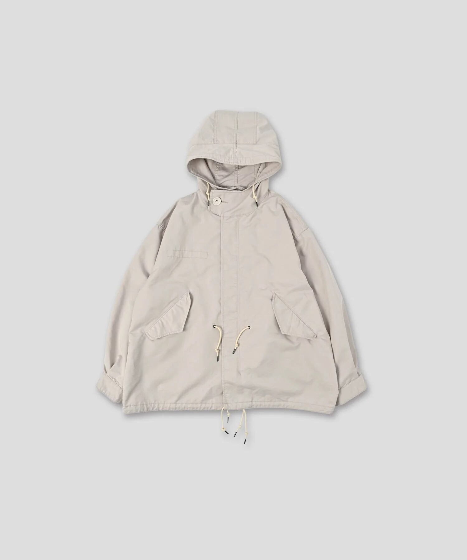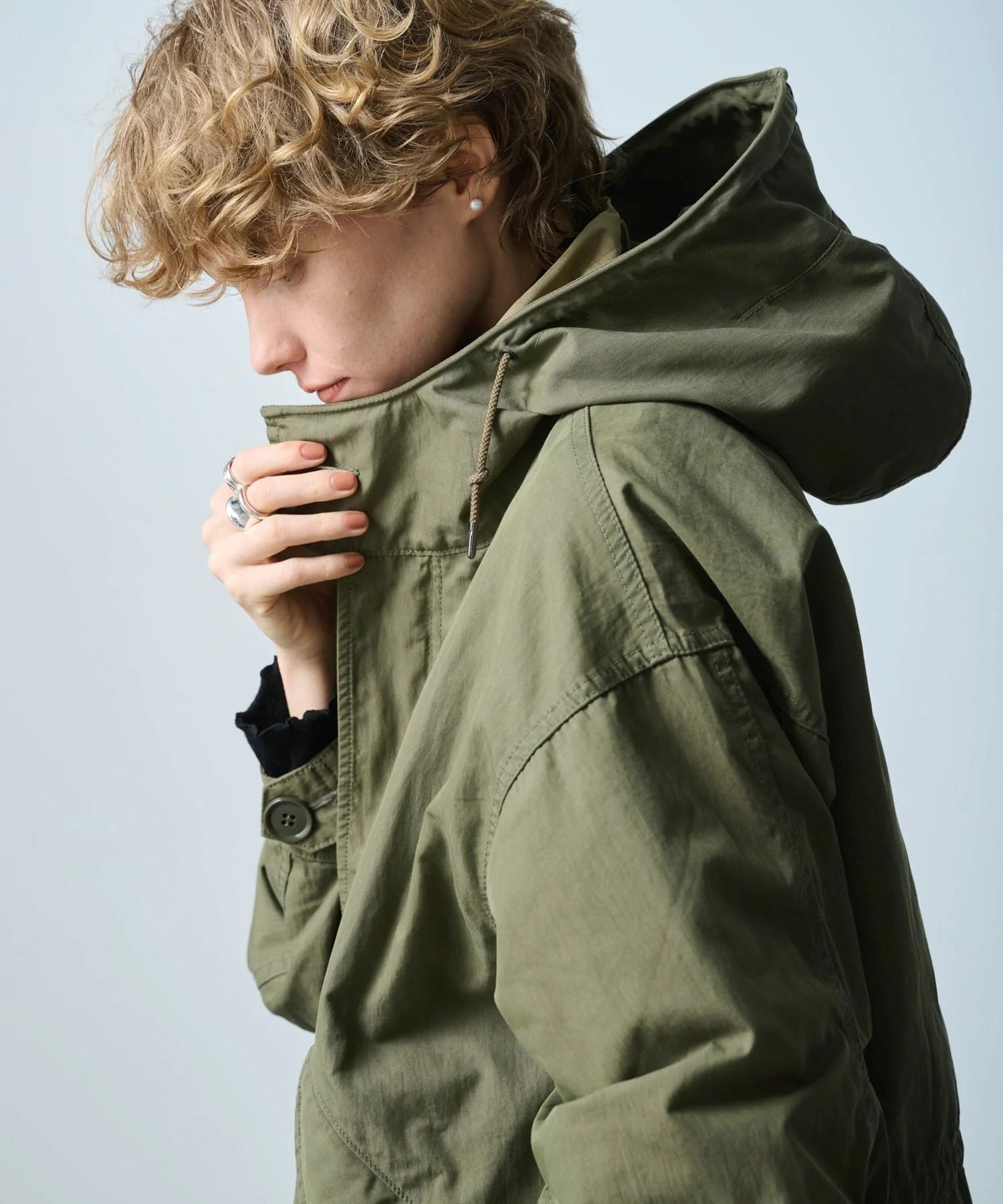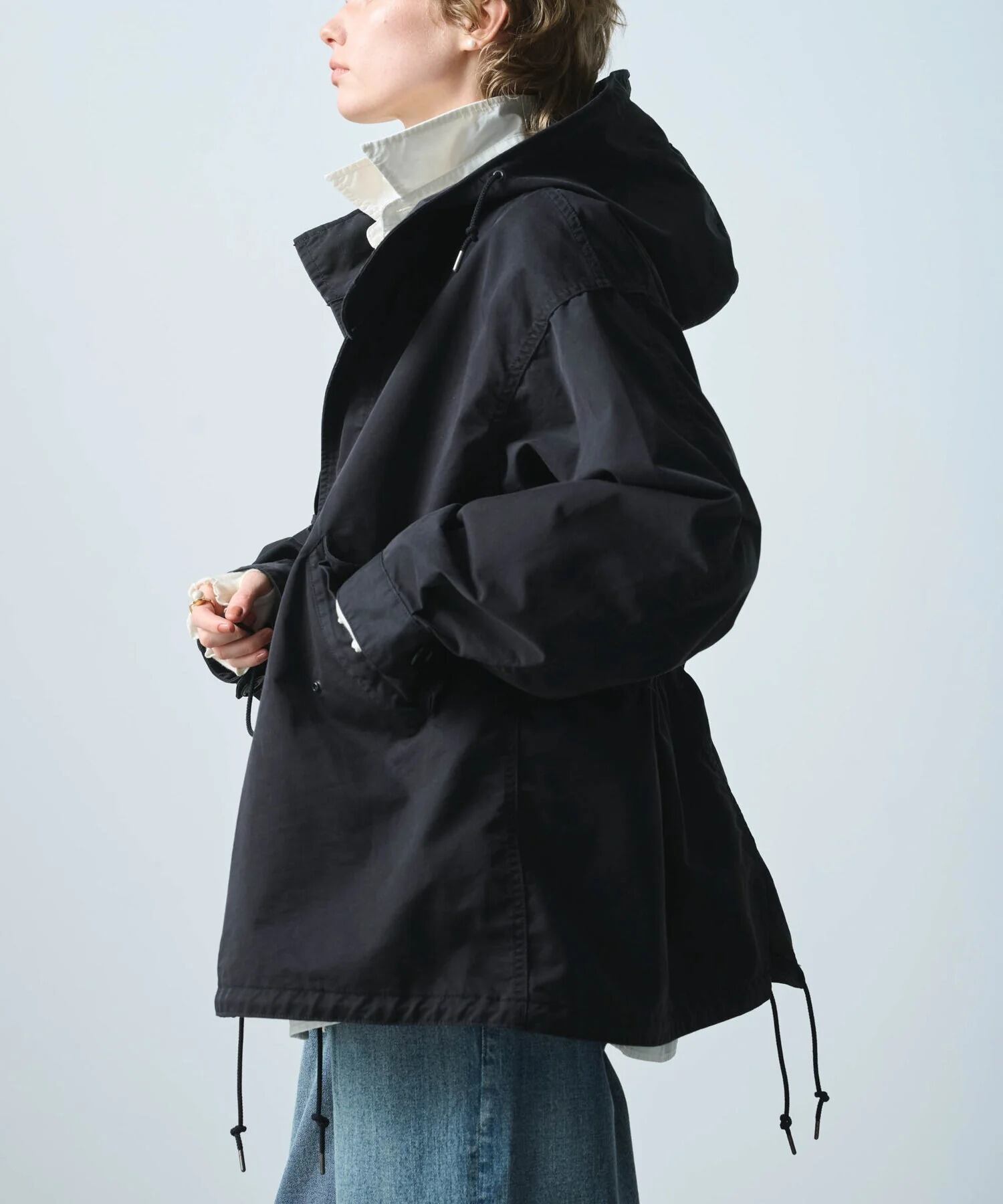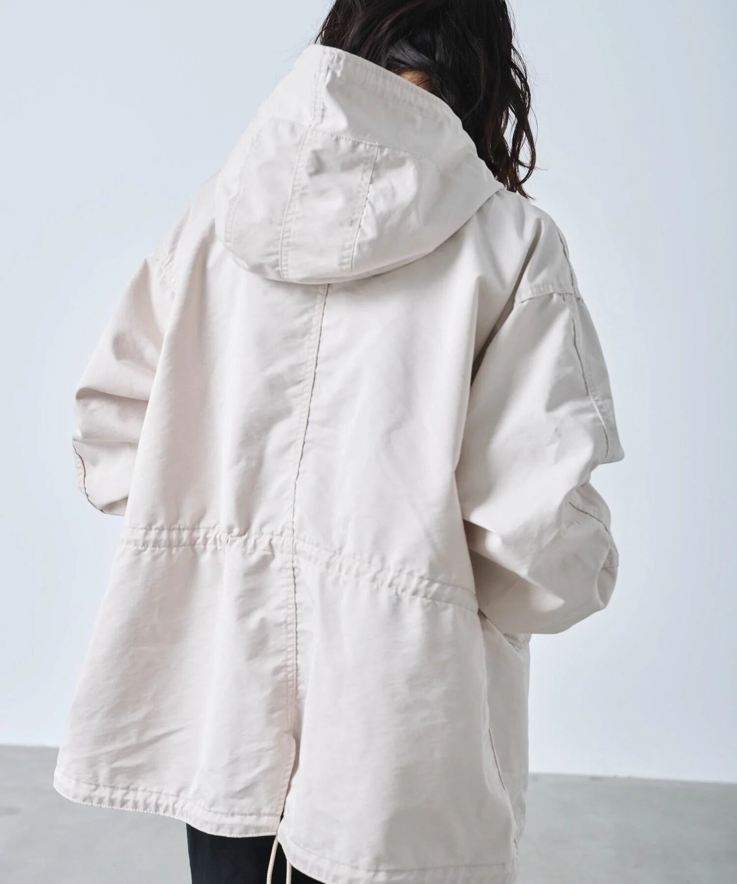 フード口にはワイヤーを通しており着用時にフォルムの調整が可能です。