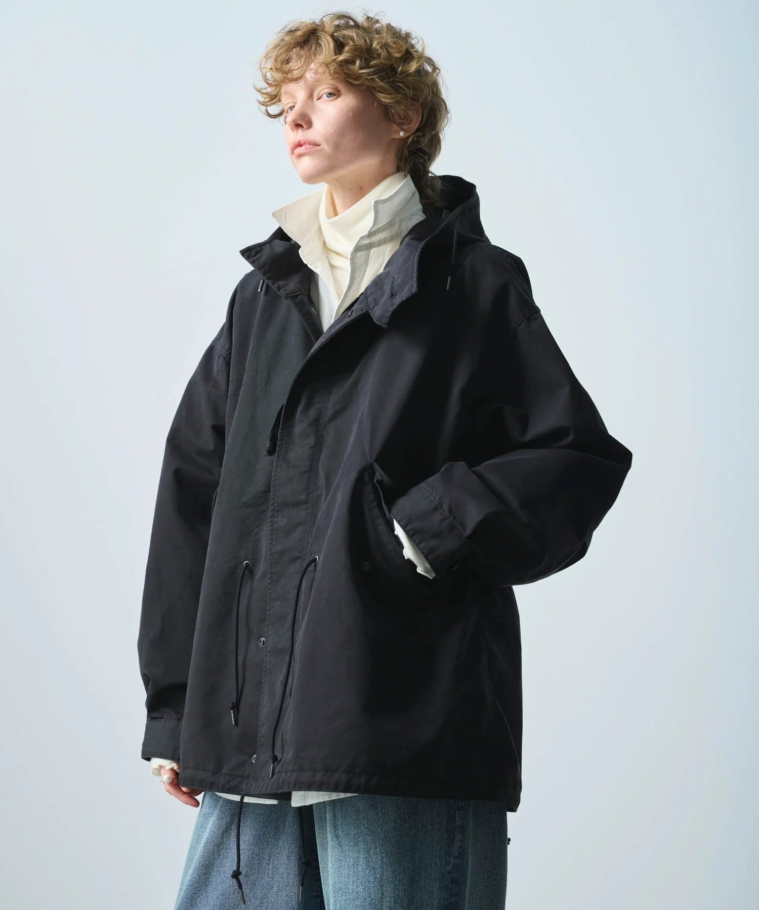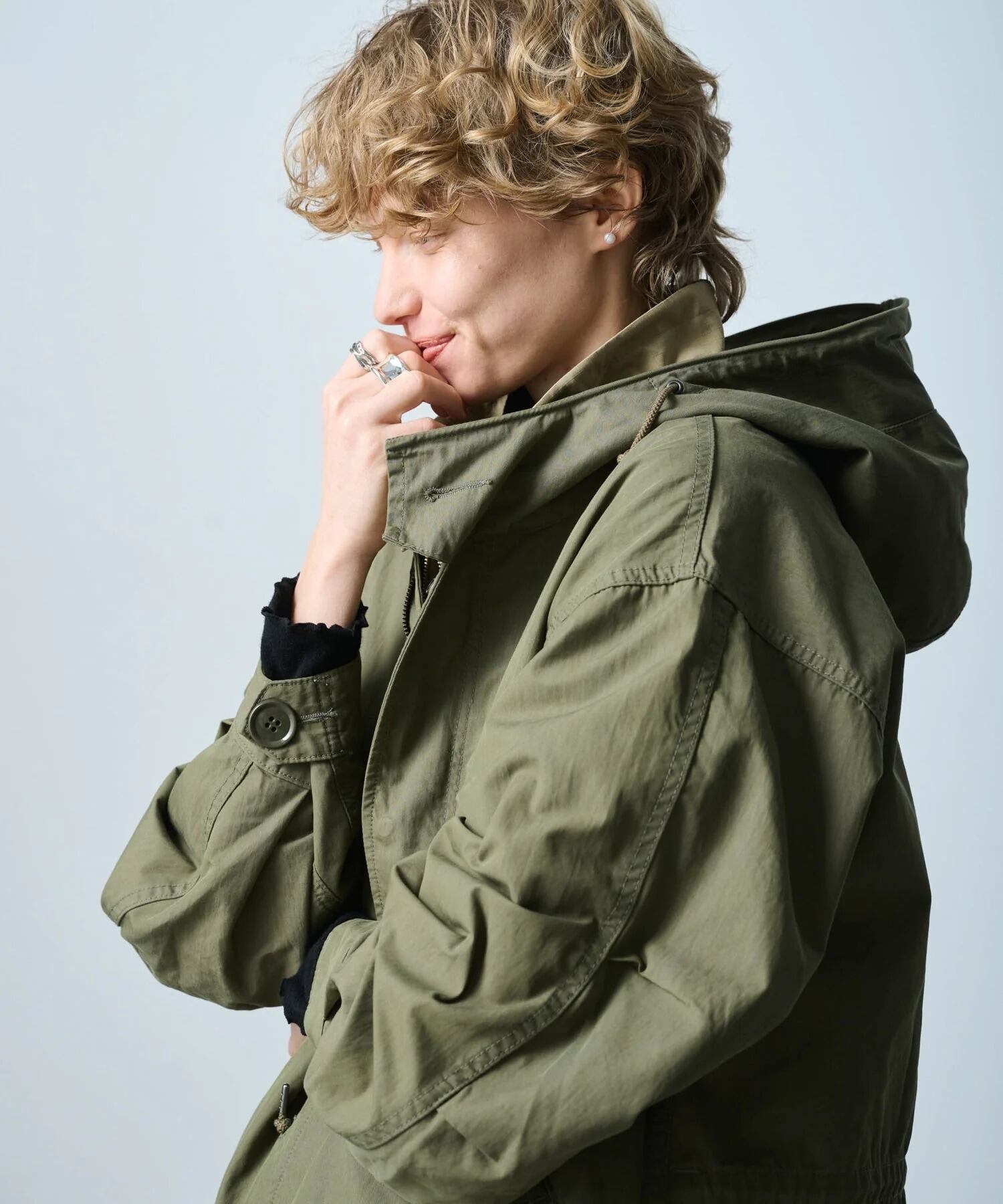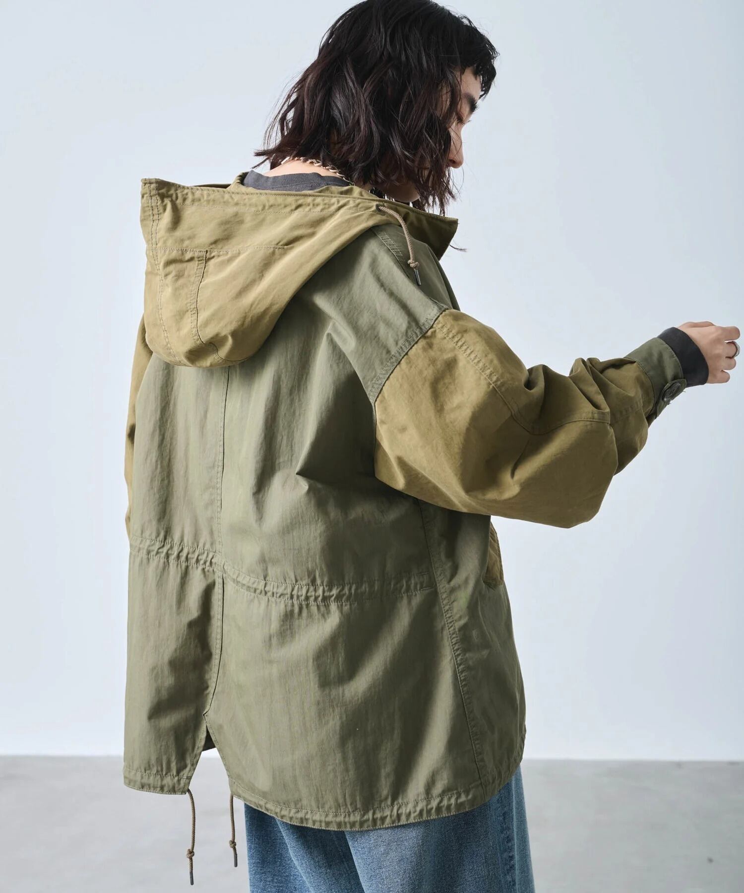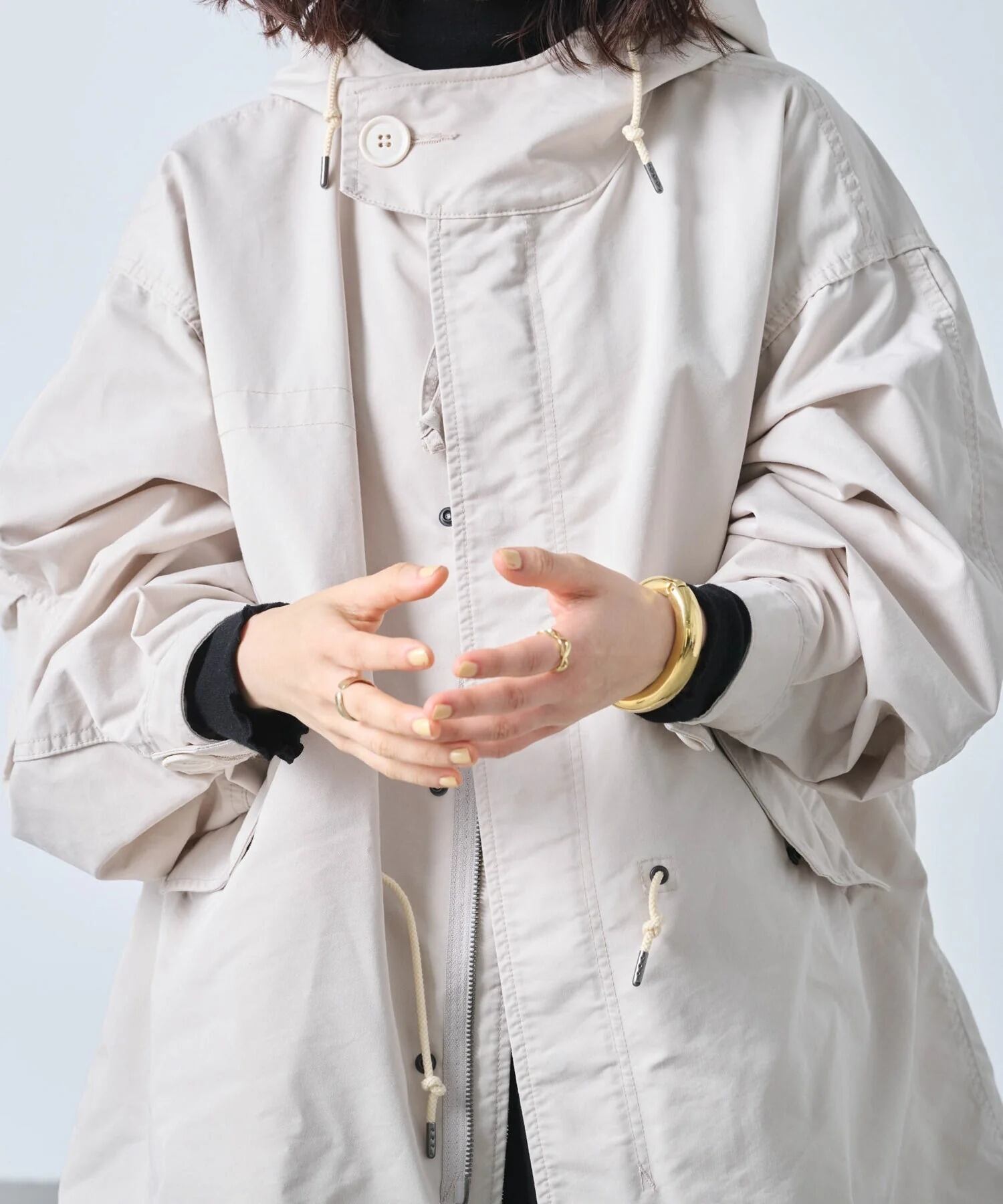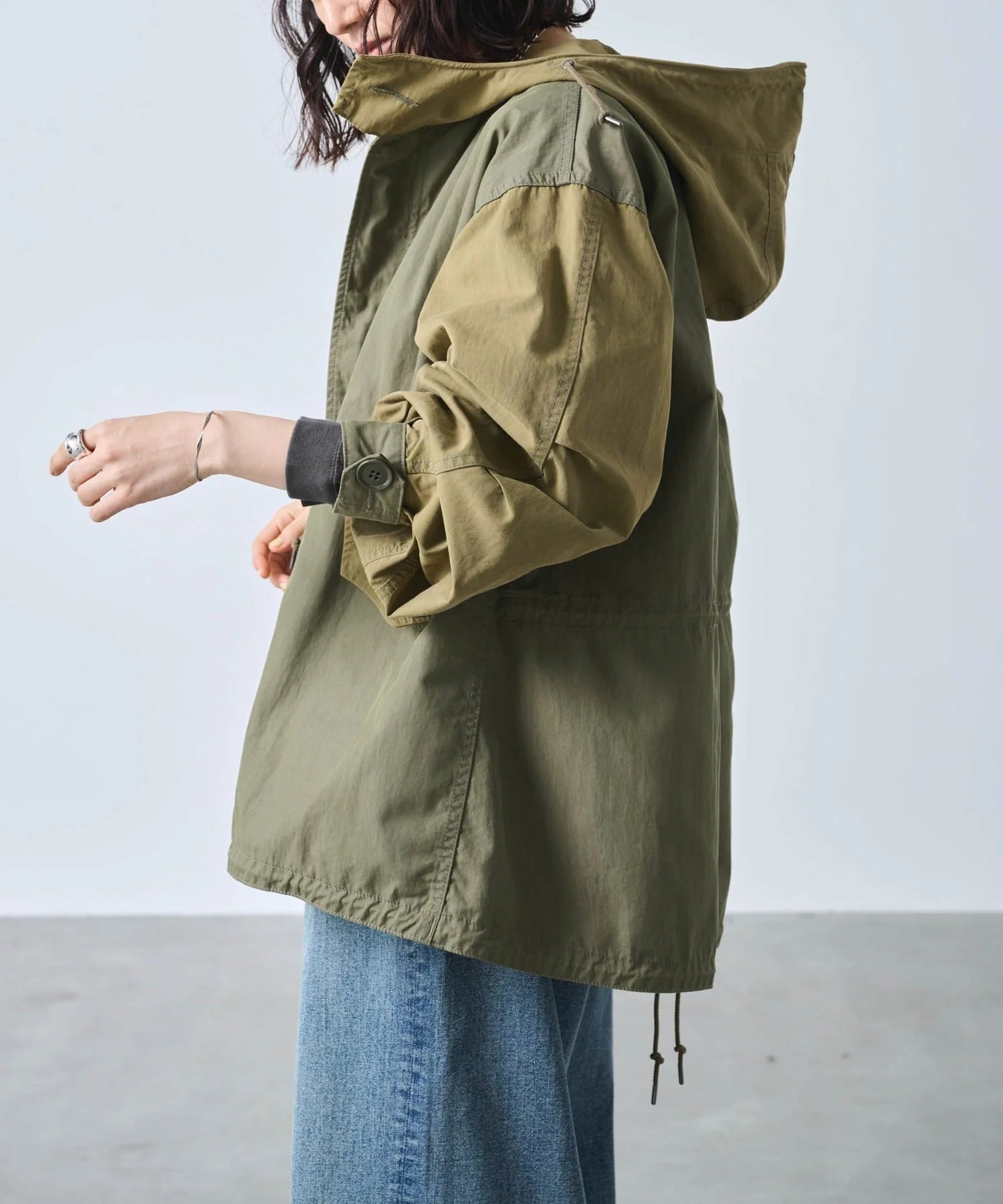 フード口にはワイヤーを通しており着用時にフォルムの調整が可能です。