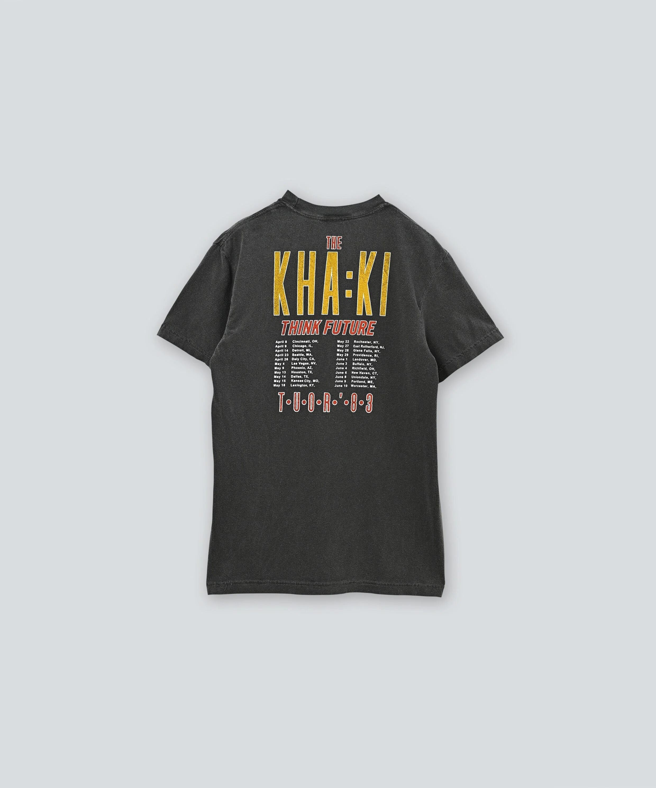 架空のロックバンドのツアーTシャツをイメージしたグラフィックを前後にプリントしています。