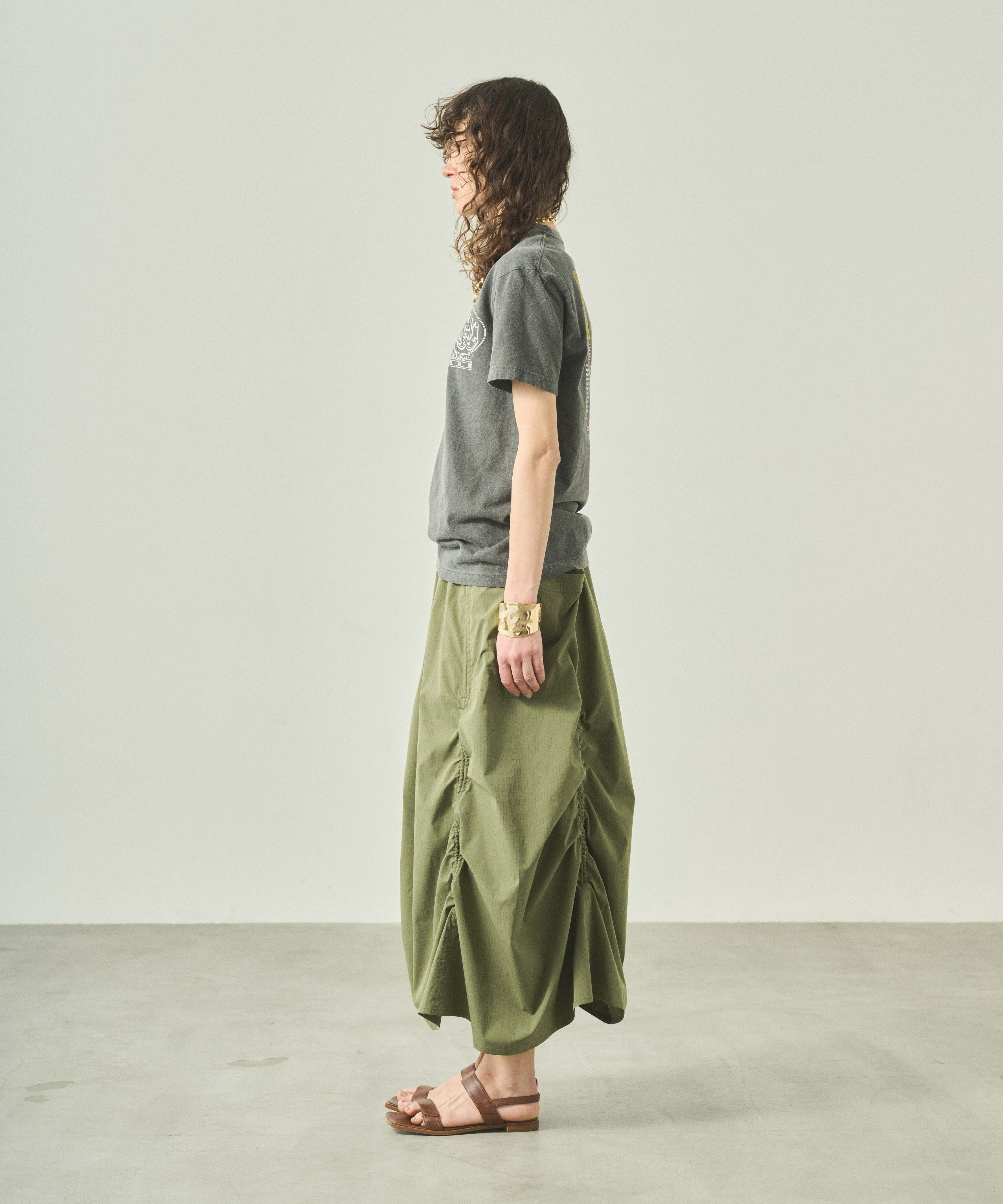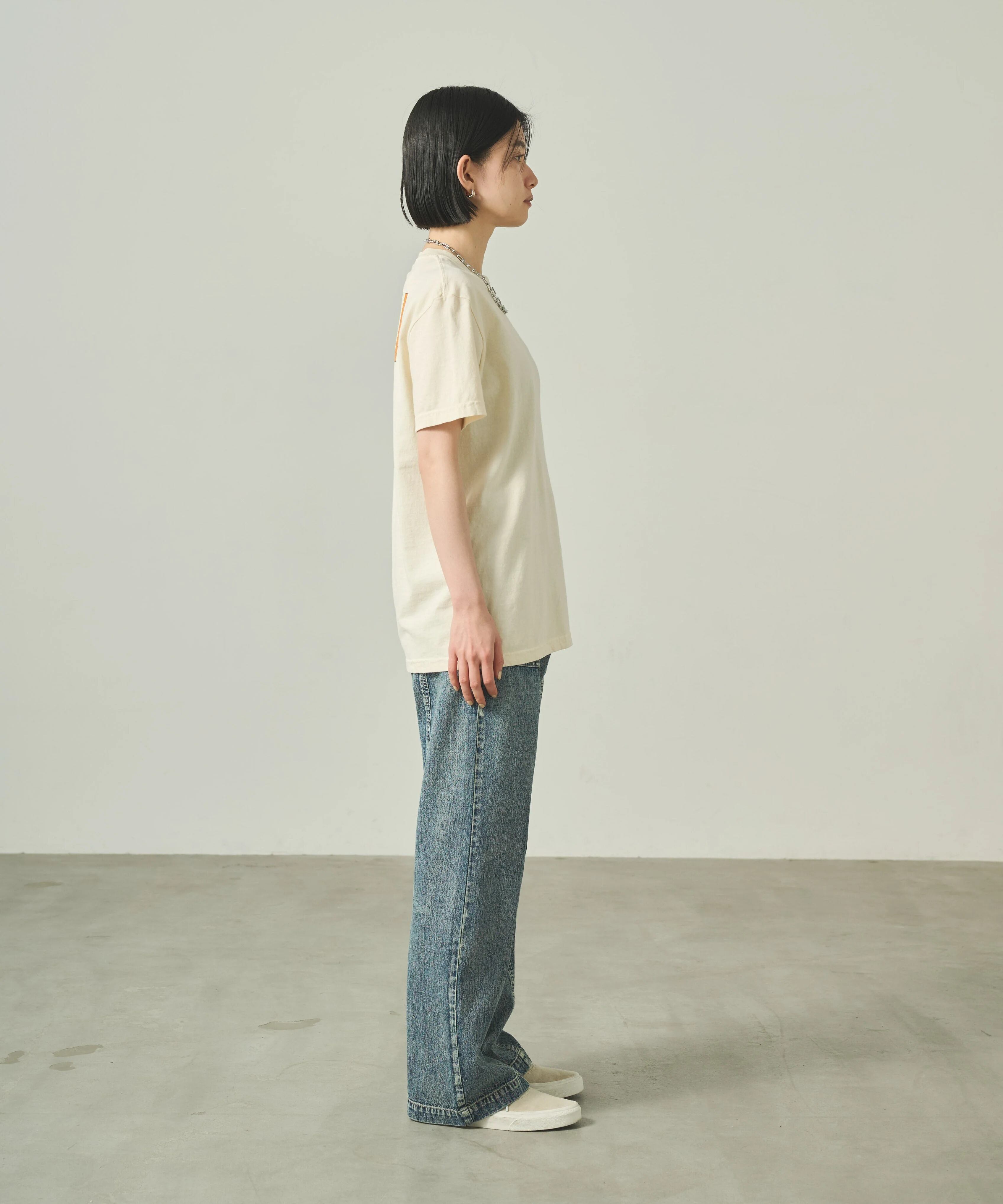 ピグメント加工を施した程よい厚みのあるコットン天竺素材を使用し、プリント後に製品洗いを施すことで馴染んだ風合いに仕上げました。