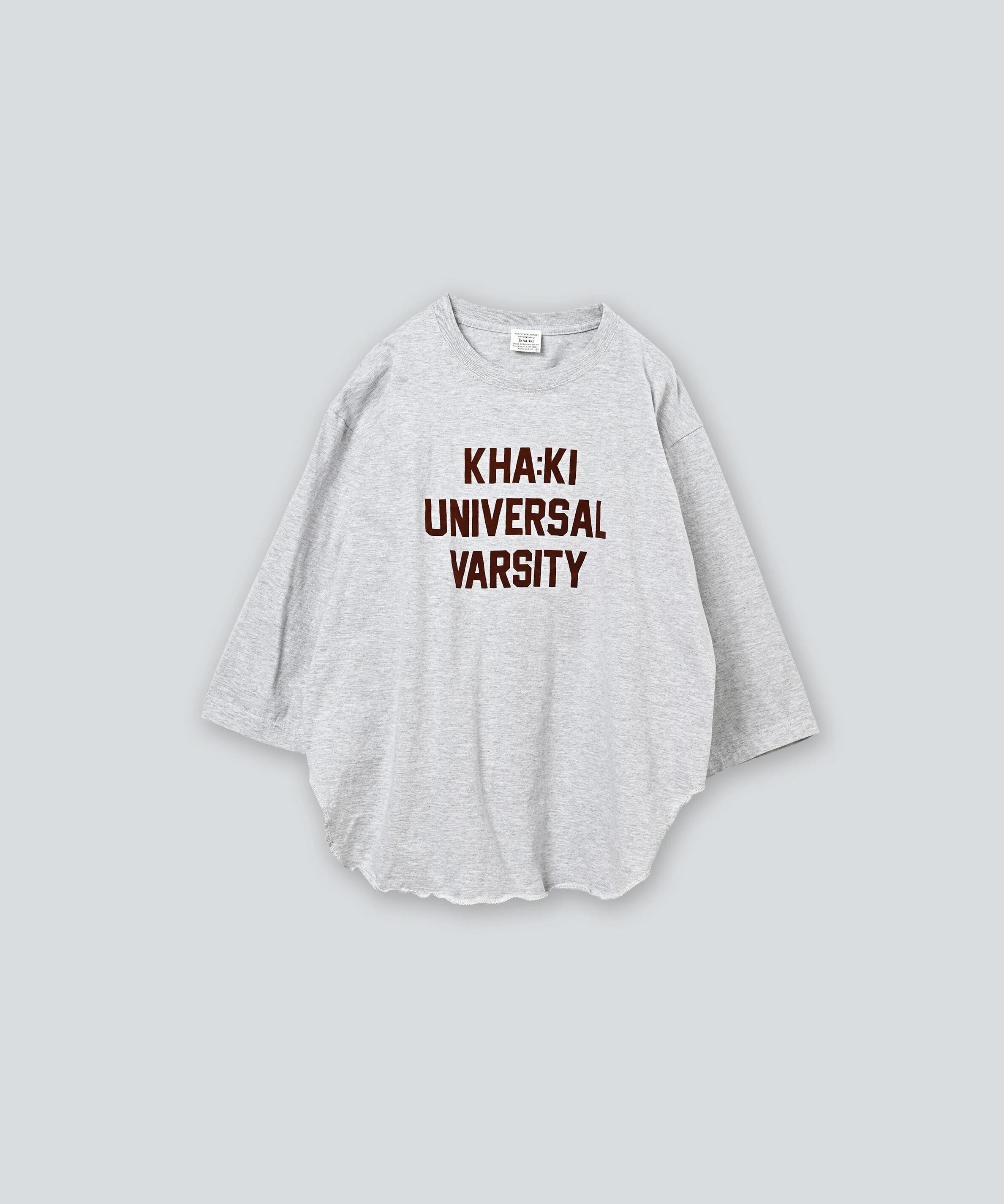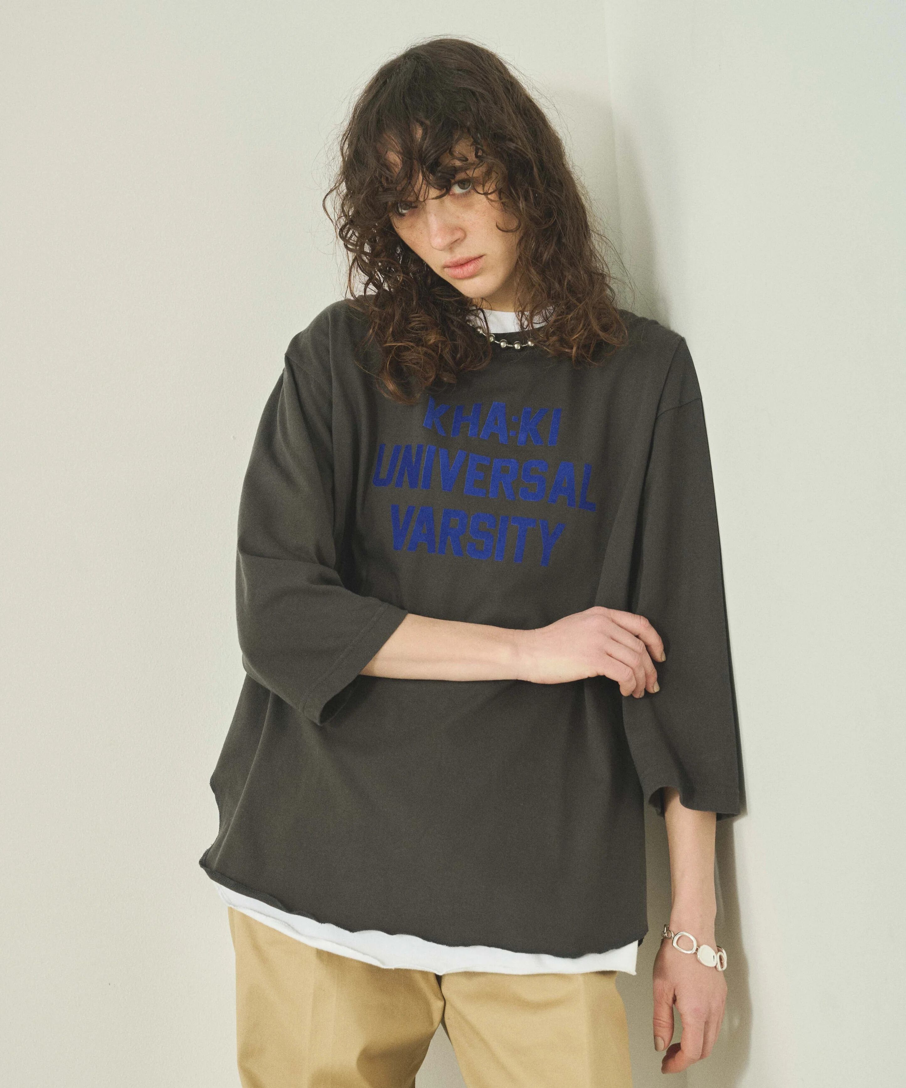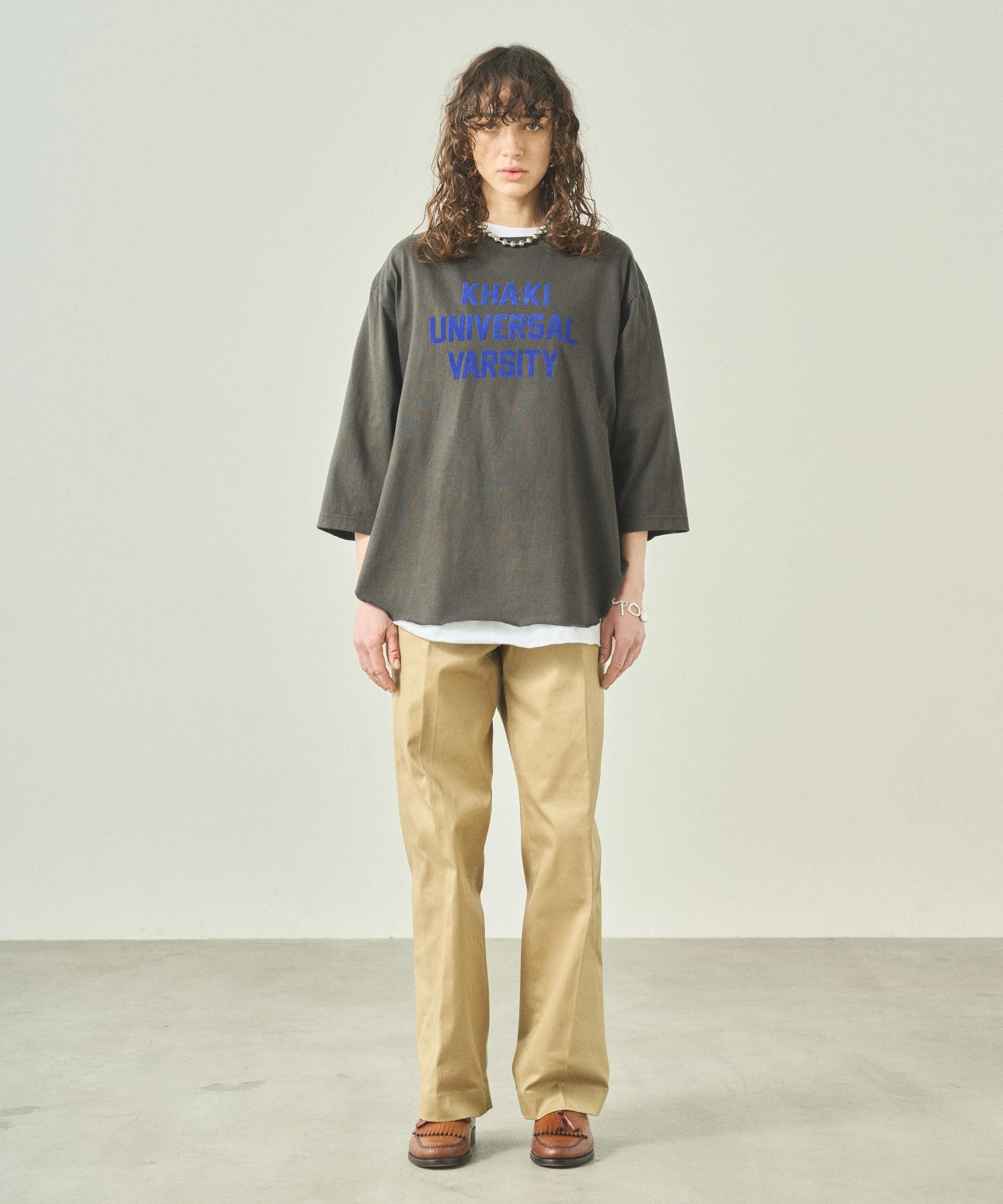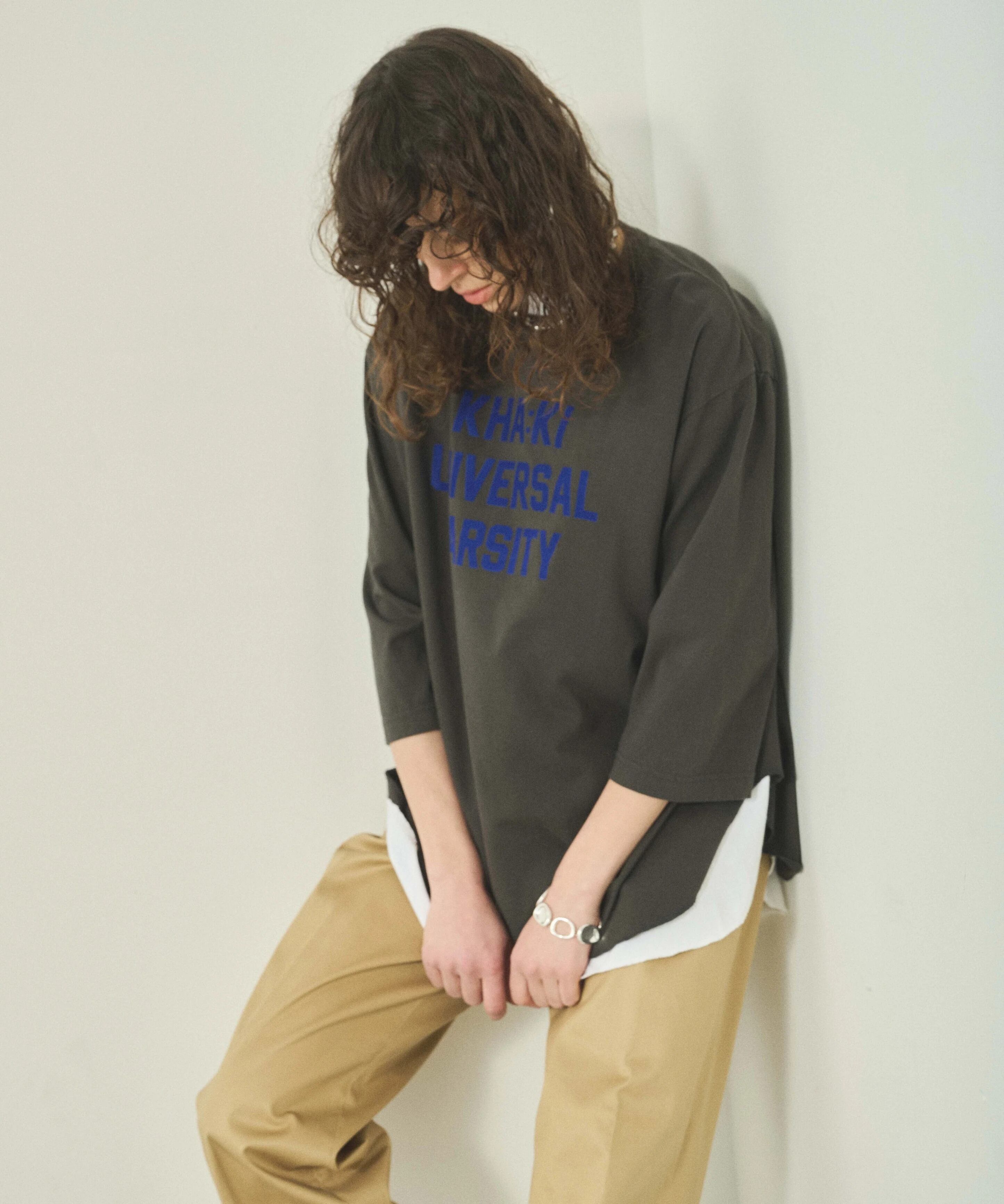シンプルなカレッジロゴを初秋に映える落ち着いたトーンのフロッキープリントで表現した7分袖Tシャツです。