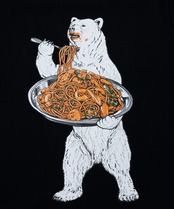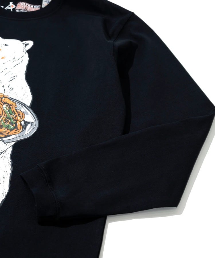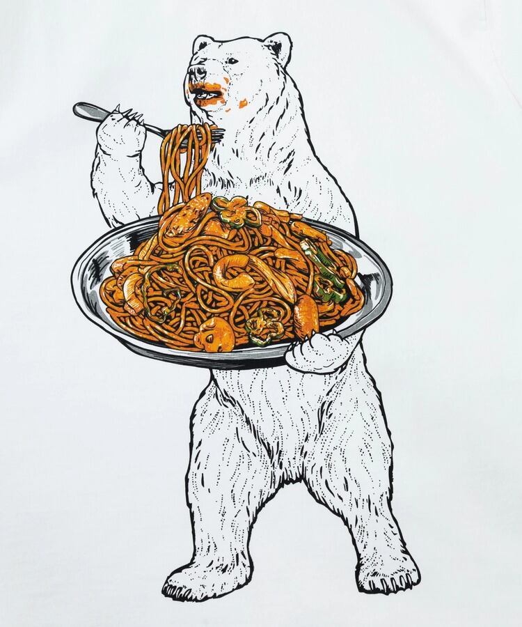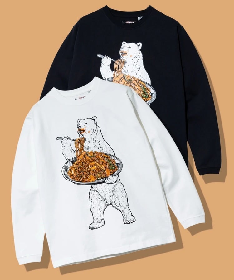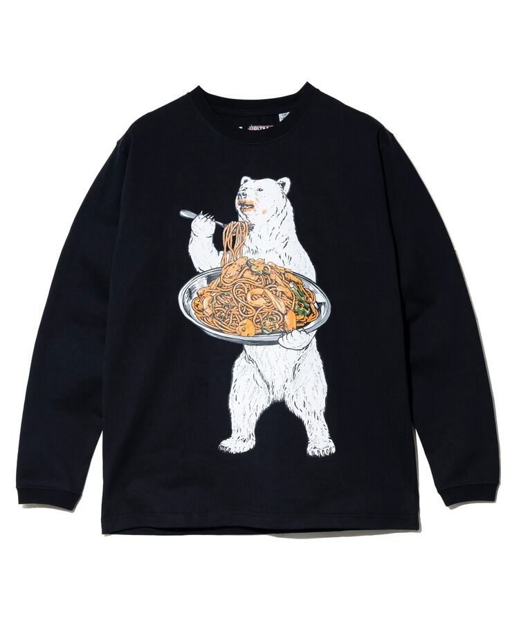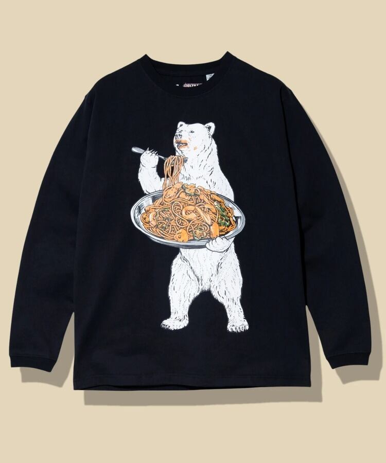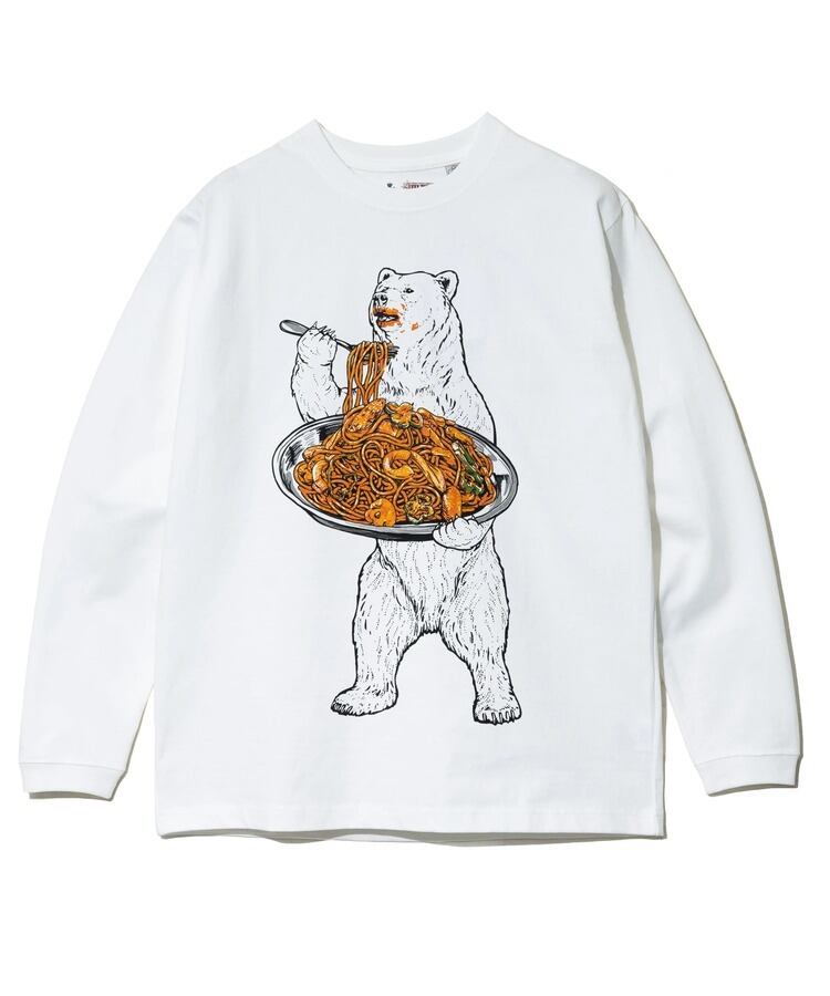 昔懐かし昭和喫茶のナポリタンを頬張るわんぱくなクマ。ヘビーなベーシックシルエットのロングスリーブT。バックサイドにはシリーズのオリジナルネームが付いています。