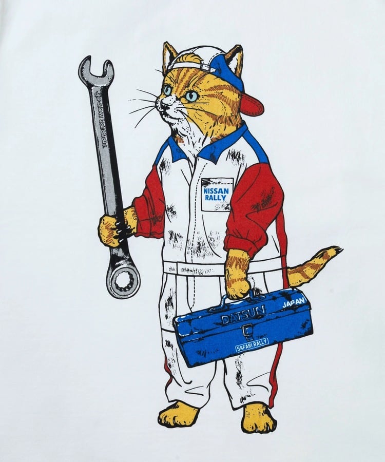 ラリー参戦時代のメカニックスーツを身に纏ったゴースローキャラバンの猫を前後に、袖にはNISSANとDATSUNのロゴをプリント。