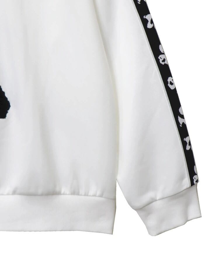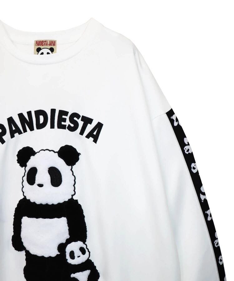 パンディエスタがパンダのぬいぐるみを持ったデザインをアップリケ刺繍で施し、両袖にはでんぐり返しのパンダがかわいい『コロコロパンダ』織テープをアクセントとしました。