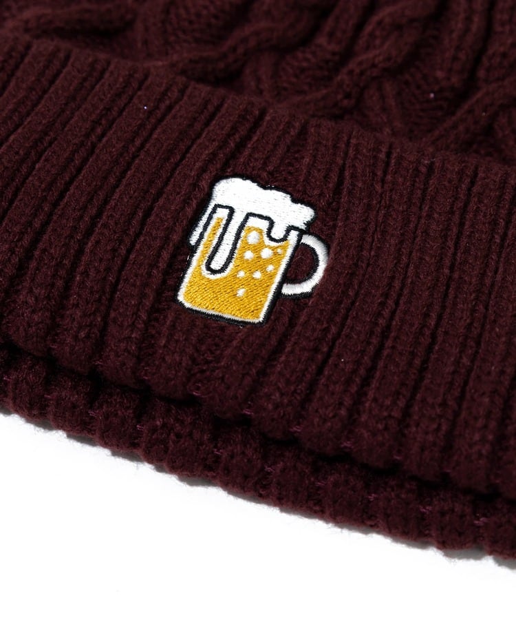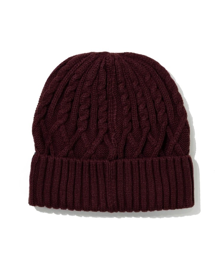 クラシカルなケーブル編みに、ユニークな刺繍をアクセントに添えたニットキャップ。
