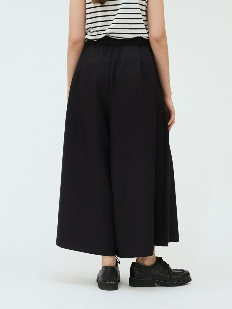 スカート見えのするすっきりとしたフレアイージーパンツです。ウエストはゴム使用なので穿きやすいデザイン仕上げです。通気性も良くサラッとした生地感なので夏場でも涼しく着用していただけます。シックで女性らしい雰囲気が印象的なmizuiro indらしいボトムアイテムです。