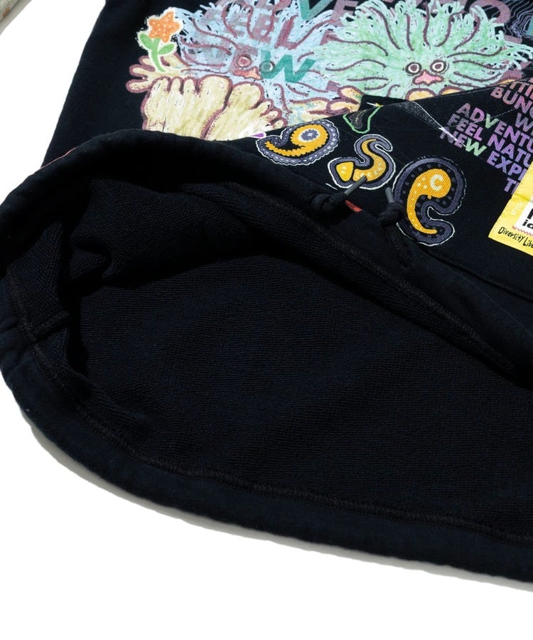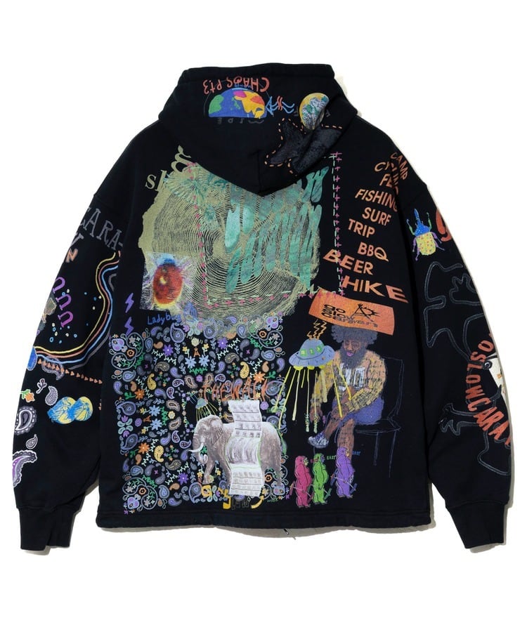 “go slow caravan”をテーマに、さまざまなイラストやモチーフを自由に落書きしたようなコラージュデザインが印象的な、スペシャルな一枚。まるでスウェットの上にアートを描いたような、遊び心あふれる仕上がりです。