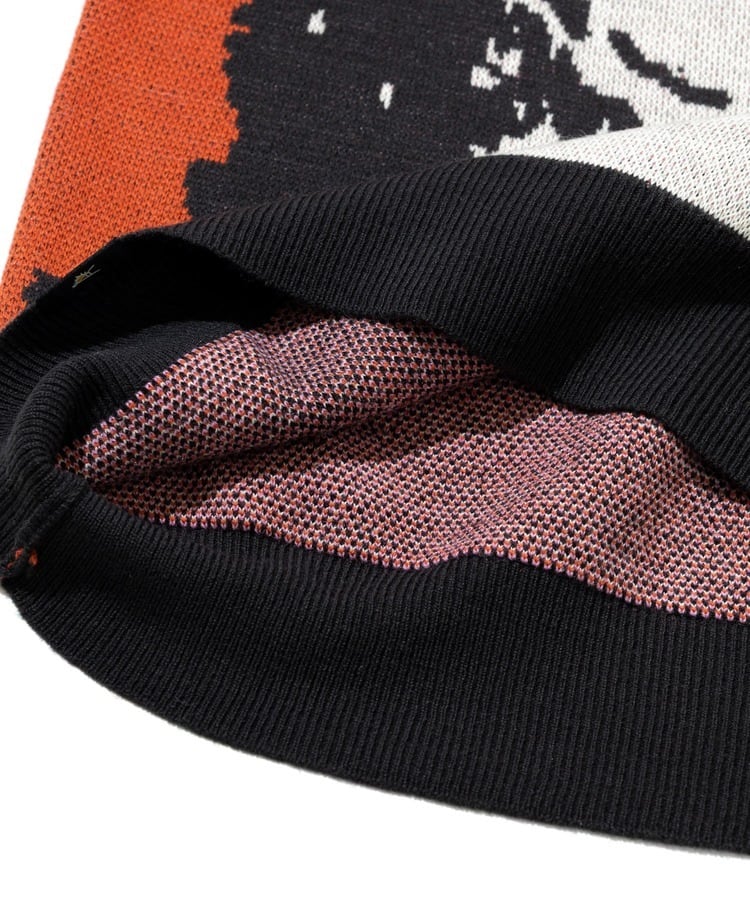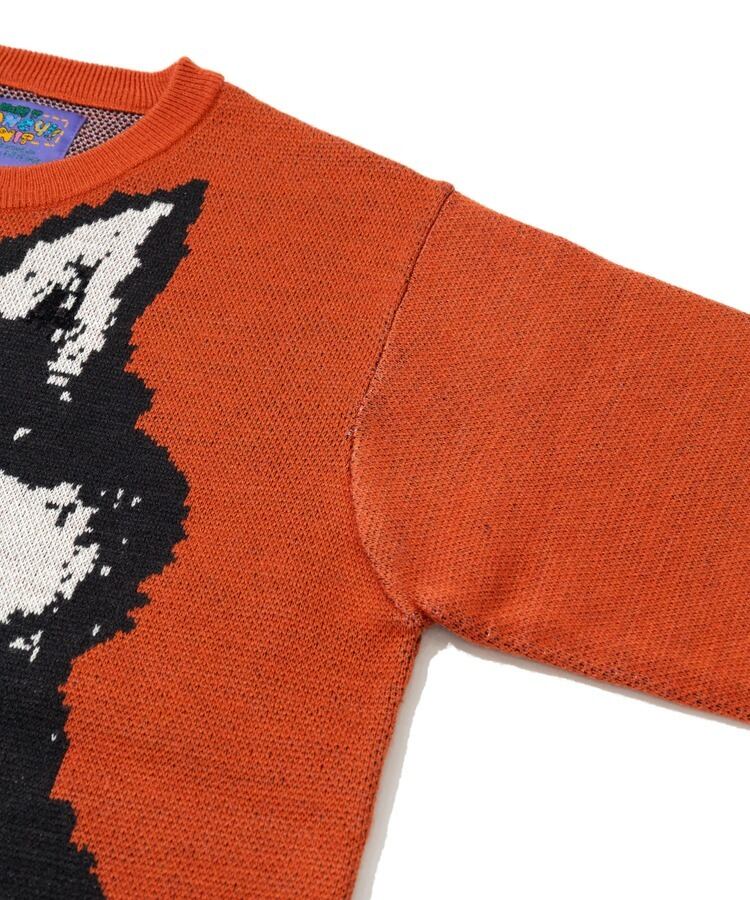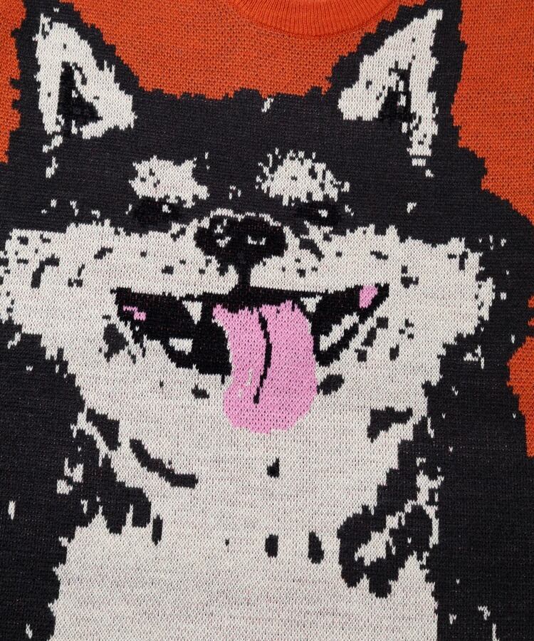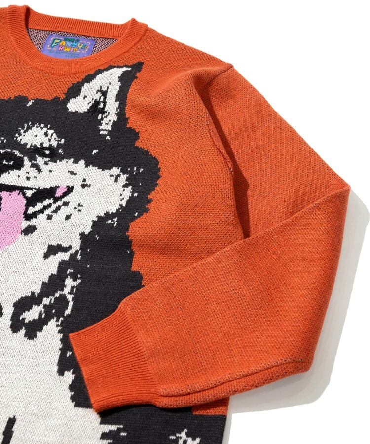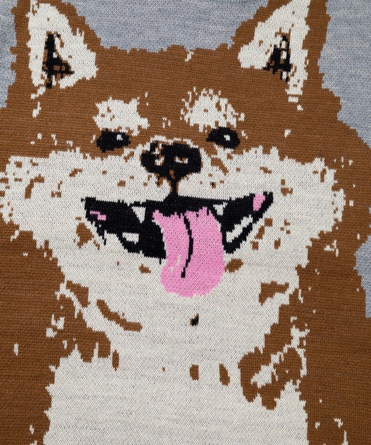 笑顔の柴犬をダブルジャガードで表現。正面の人に癒しと幸せをもたすことができるセーター。レギュラーサイズ中肉厚なのでスウェット感覚で着用でき、プリントでは表現できない温もりある柄の雰囲気も魅力。茶柴と黒柴の展開。