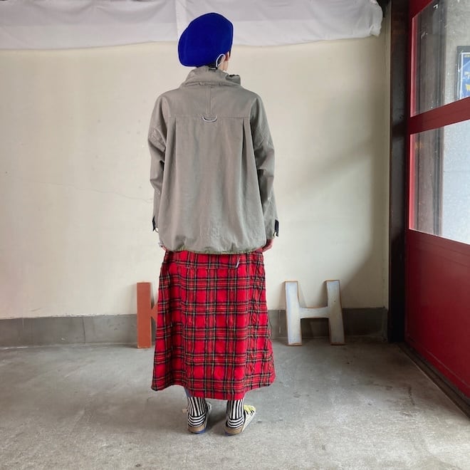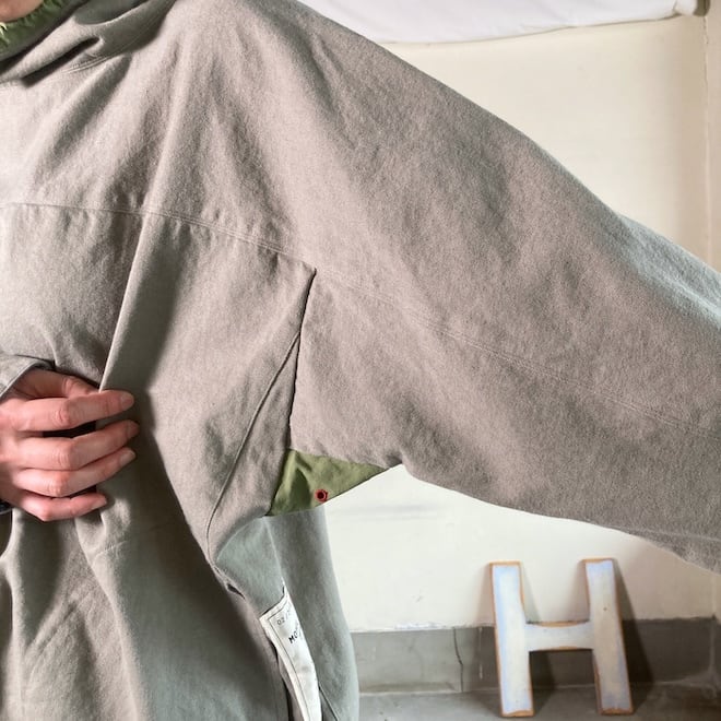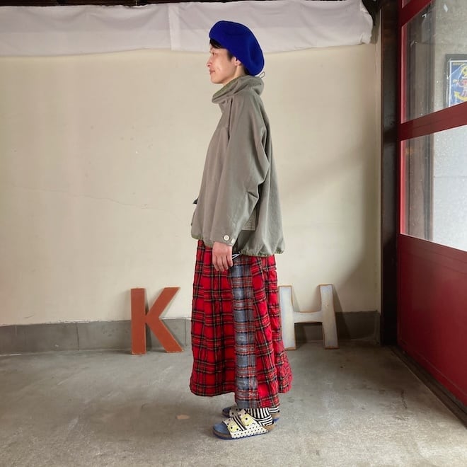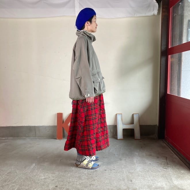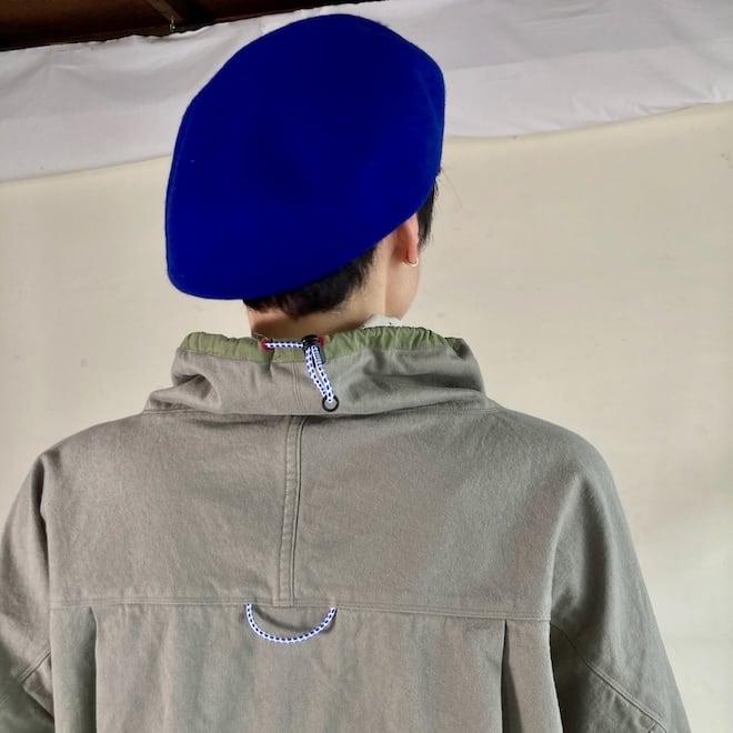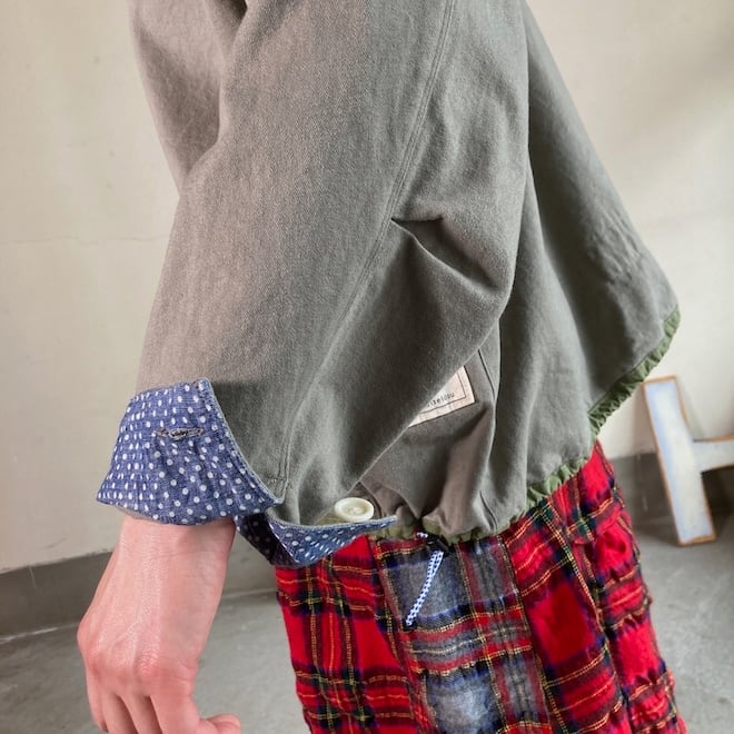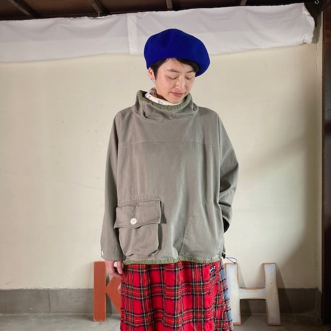人気のヤッケです。他ブランドであまりないカタチというのもありますが、快晴堂のかわいい雰囲気で軽やかな生地で仕立てているというのも人気の理由なのかなと思います。大きなポケットもデザインの特徴になっているのではないでしょうか。衿と裾のパイピングやネック部分の裏地、わきの部分の切り替えなど細やかな仕掛けも流石!快晴堂!とうれしい気持ちなりますね。