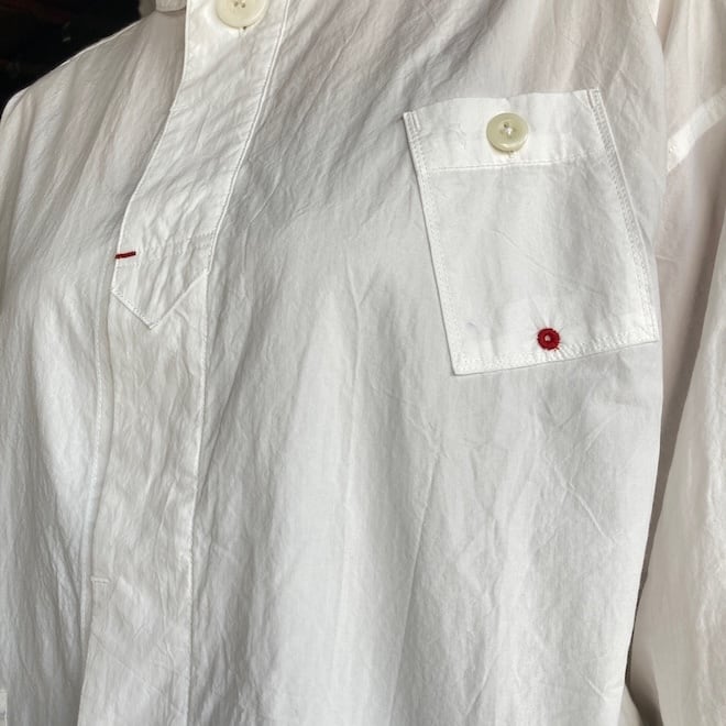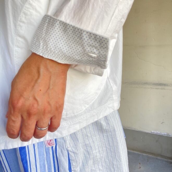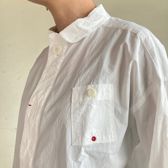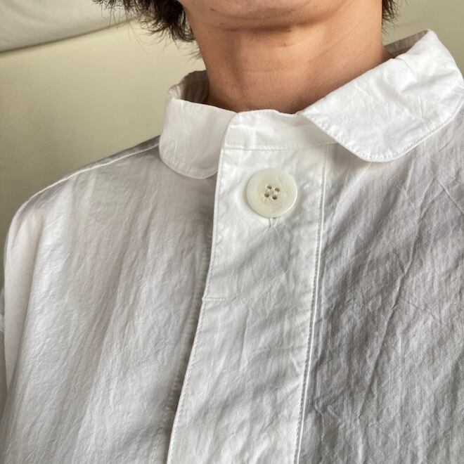 丸襟とネック部分の大きなボタンがアクセントになっており、とてもかわいい雰囲気のシャツです。比翼ですのですっきりとした印象があり、メリハリの効いたデザインなのではないでしょうか。