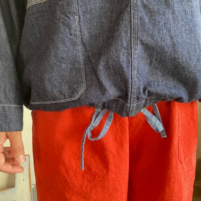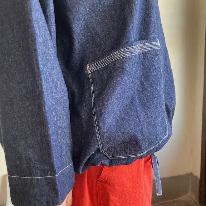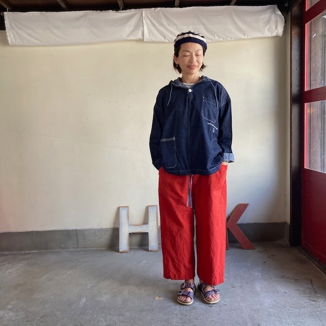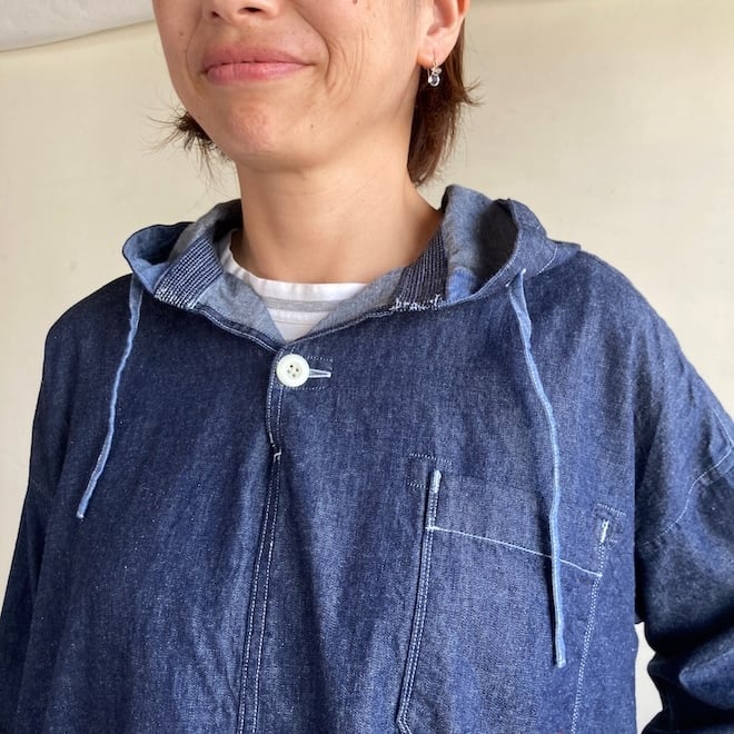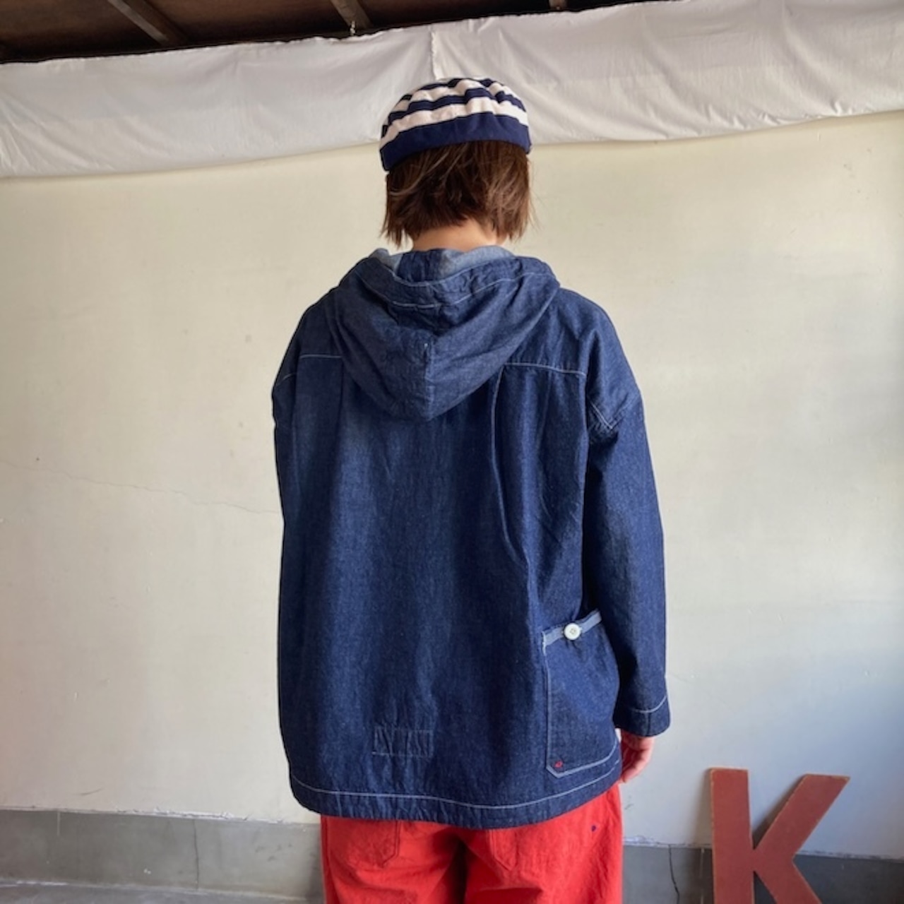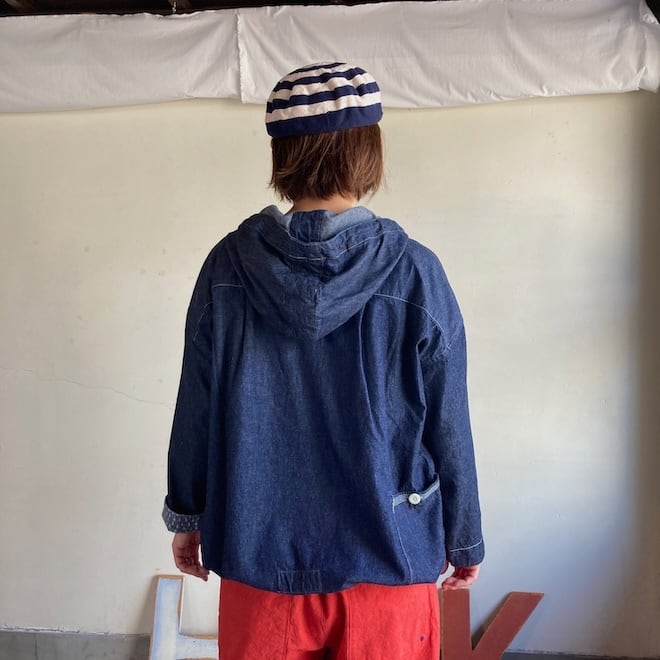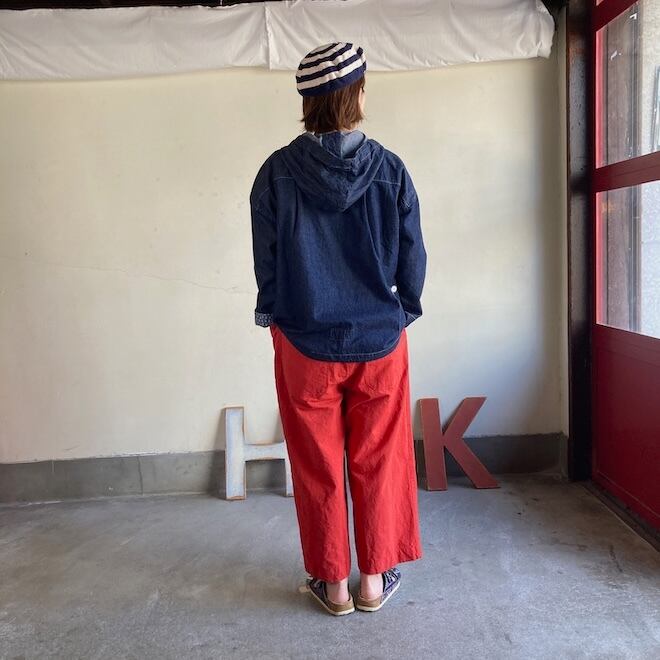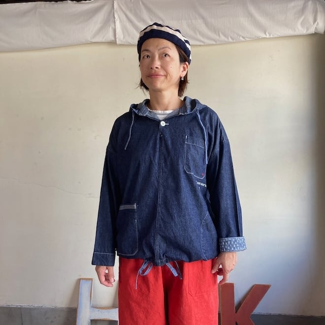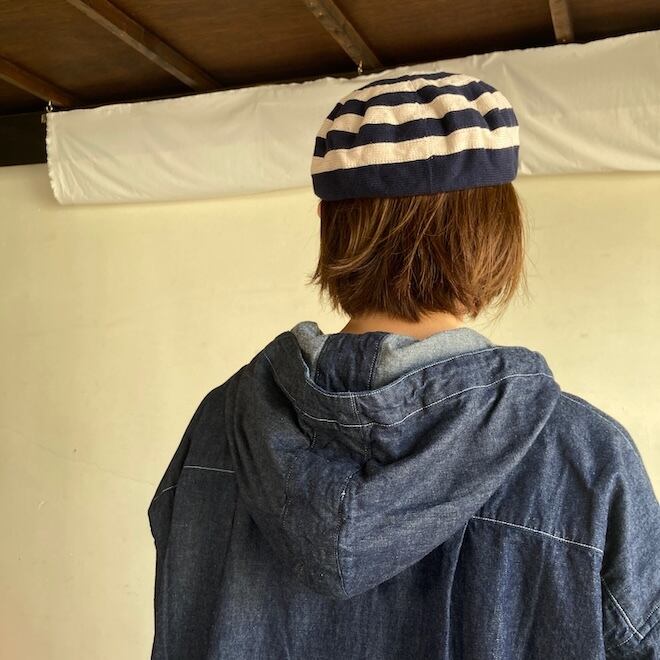 特徴があるプルオーバー。マリンコーディネートの雰囲気を演出してくれるようなかわいい作品です。快晴堂の軽やかなパンツに合わせたり、夏場はショートパンツに合わせたりも素敵なのかなと思います。