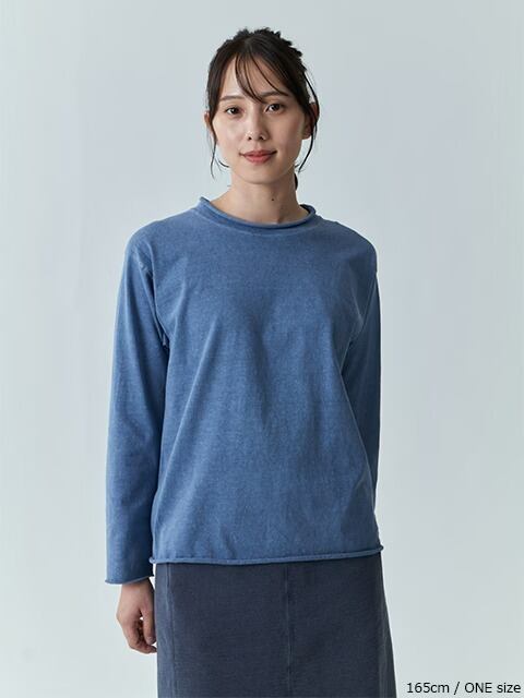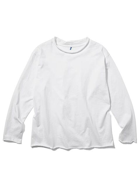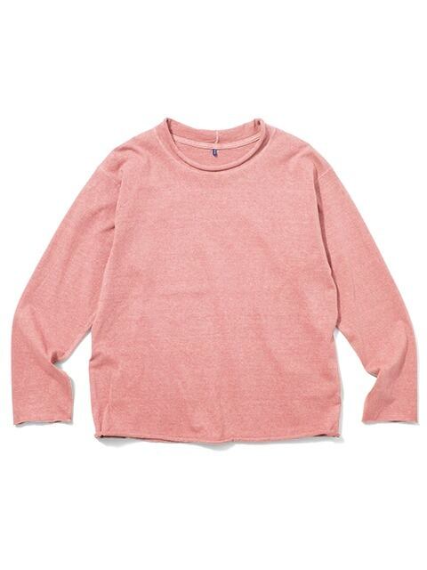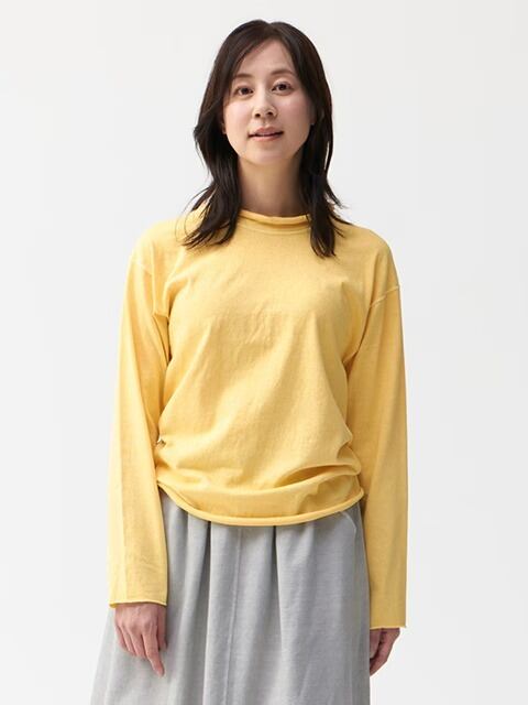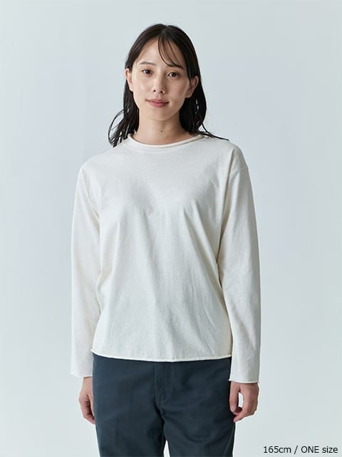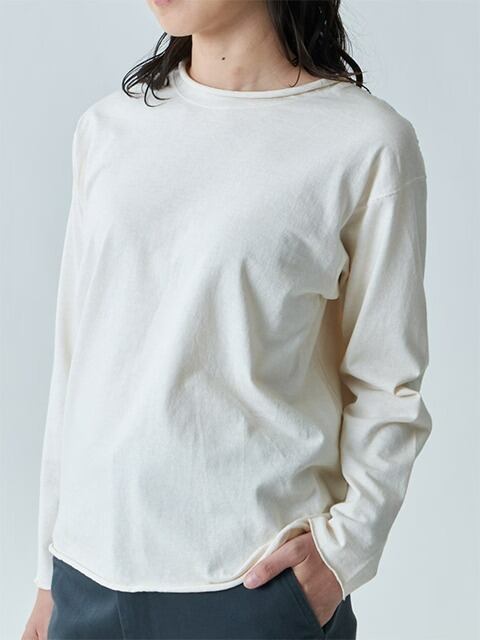 適度にゆとりを持たせたシルエットに、首、袖、裾はカットオフ&ロックステッチ仕様でナチュラルにクルクルと丸まったラフなデザインに仕上げた、ほど良く肩の力の抜けたリラックス感のある表情が何とも言えないウィメンズ用カットソーです。