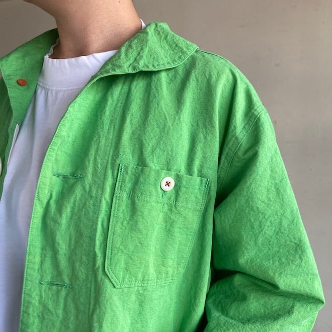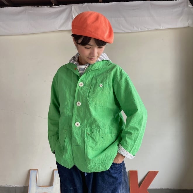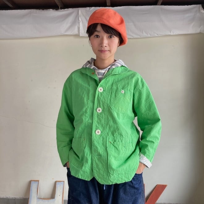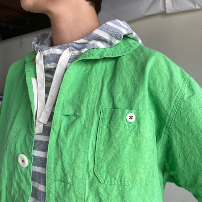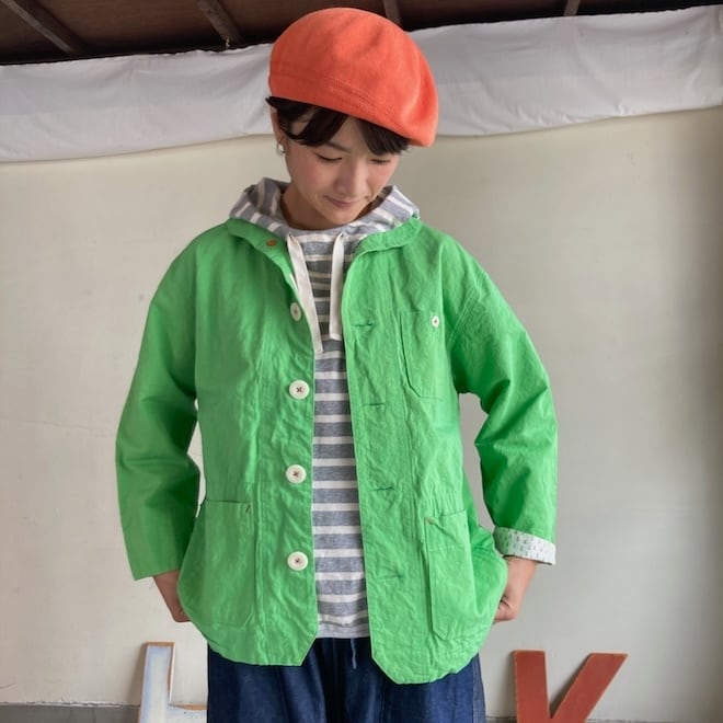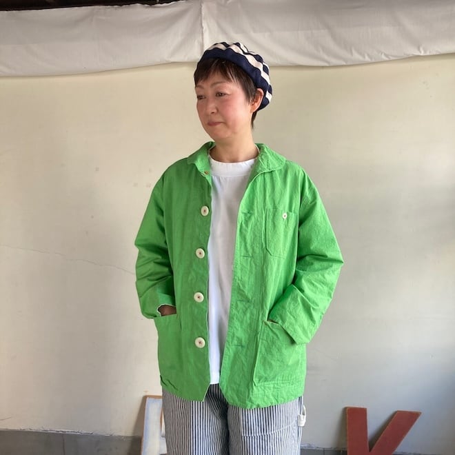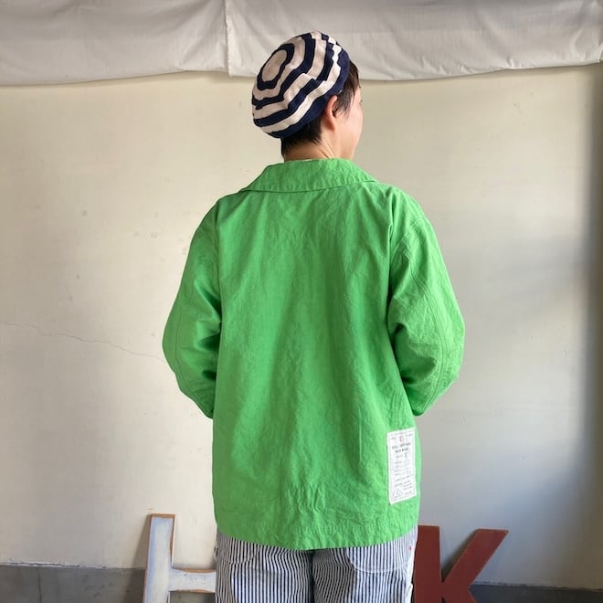 こんなかわいい色味、生地のジャケットはあまり見たことがなく、素敵でしたのでセレクトいたしました。当店の馴染みのお客様や、快晴堂のファンの方でしたら、この気持ちを共感していただけるのではないでしょうか。春の訪れを告げるにふさわしい明るめのカラーに加えて、フレンチワークテイストのラピスラズリもオーダーしております。前が開くことで春先のちょっとした羽織物として活躍しそうですし、中に合わせる服によって様々な表情を楽しめます。
