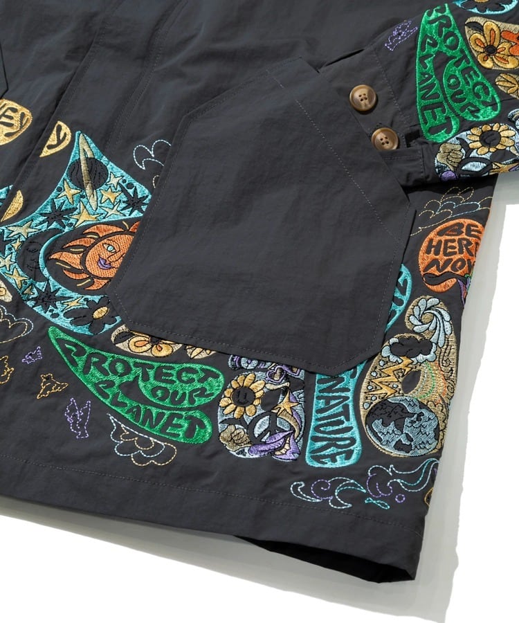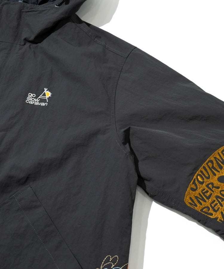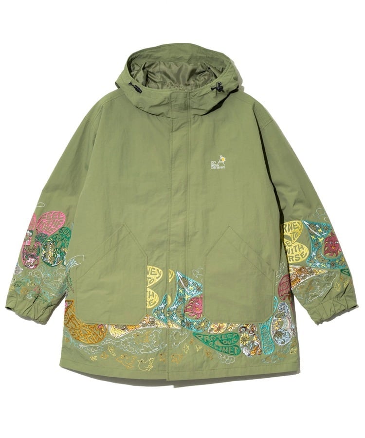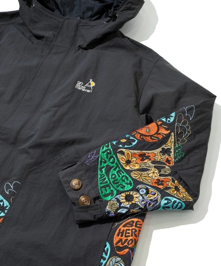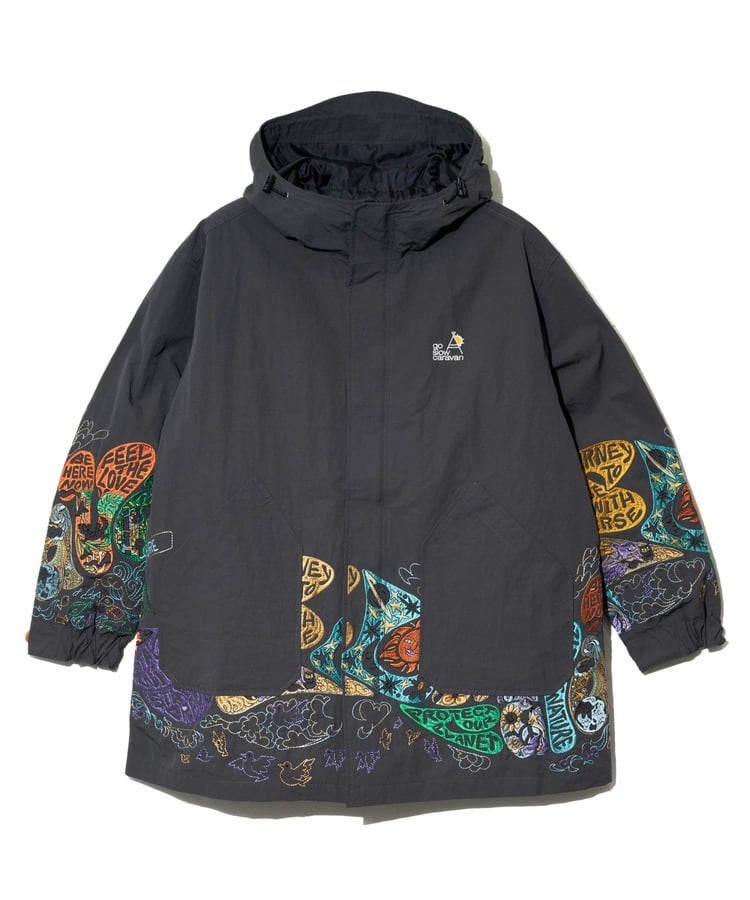 袖や裾まわりには「自由と平和、愛、波打つようなリズム」を表現した〝グルーヴィ〟なヒッピーロゴを刺繍で表現。羽織るだけでgo slow caravanの世界観を存分に楽しめます。