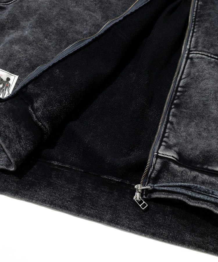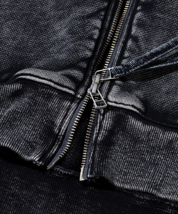 寒さの残る春先には、インナーを重ねて着込めるスウェットアウターとして活躍します。USED感の強い製品染め加工を施し、雰囲気のある仕上がりに。