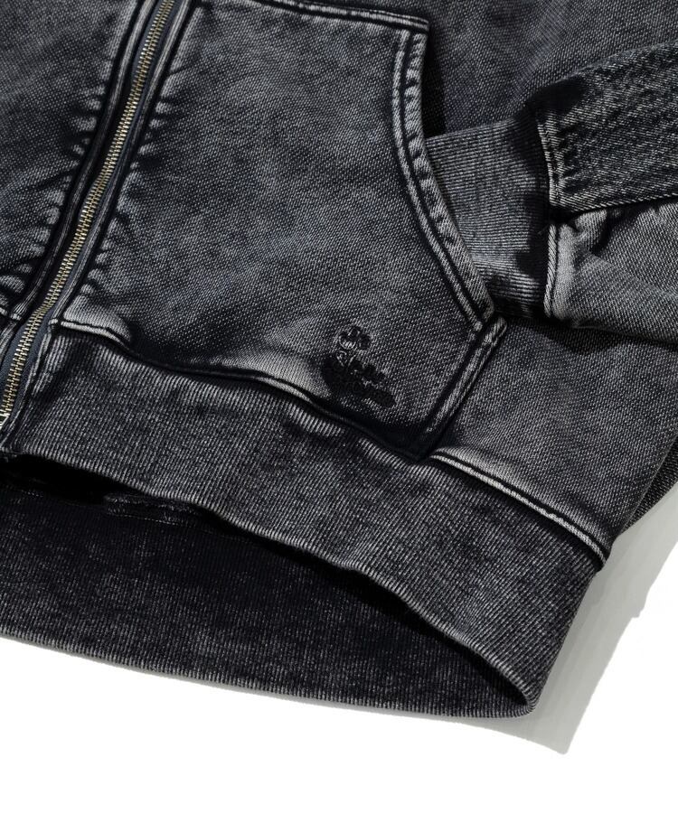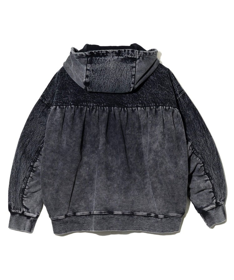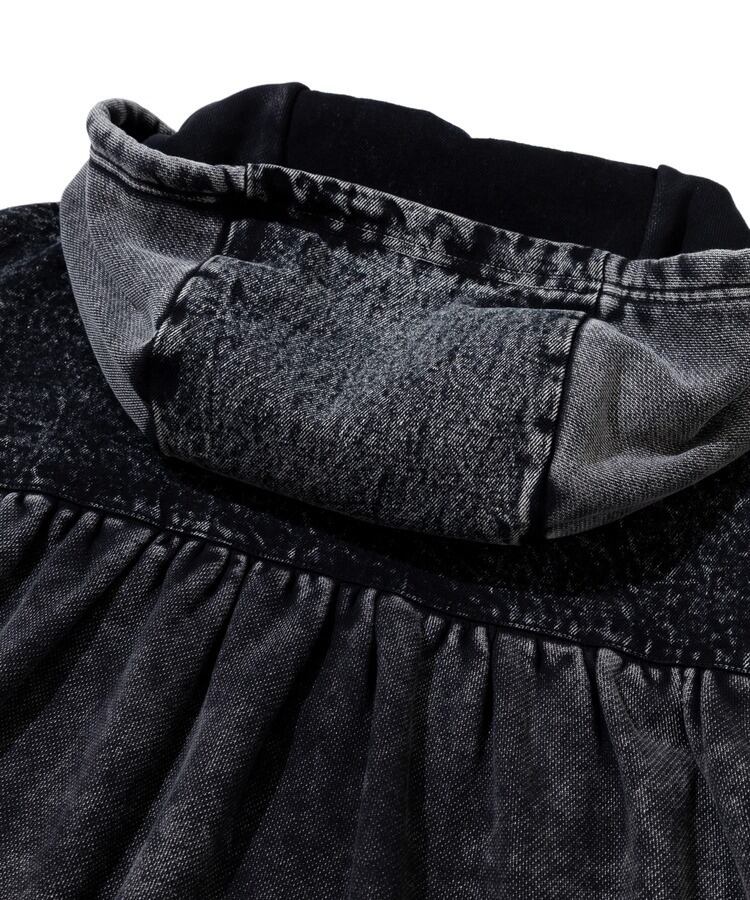 柔らかくやや厚みのある裏毛素材をベースに、背面とフード部分をデニム素材で切り替えたデザインが特徴。