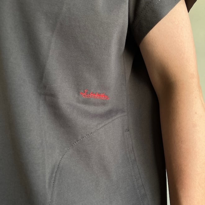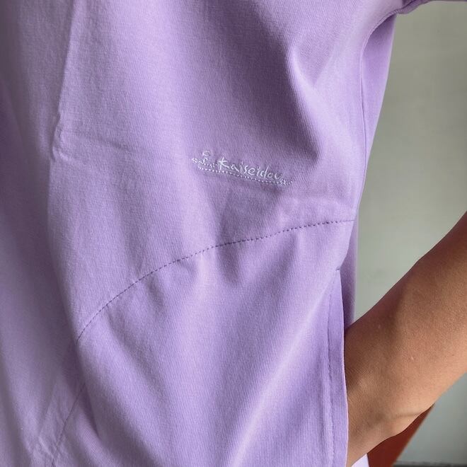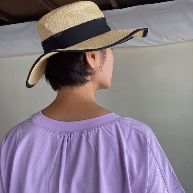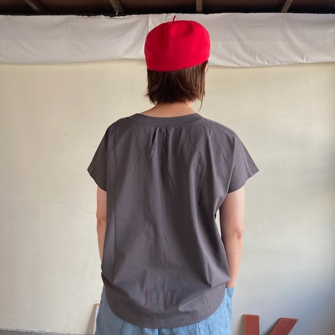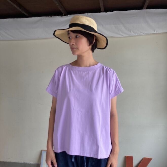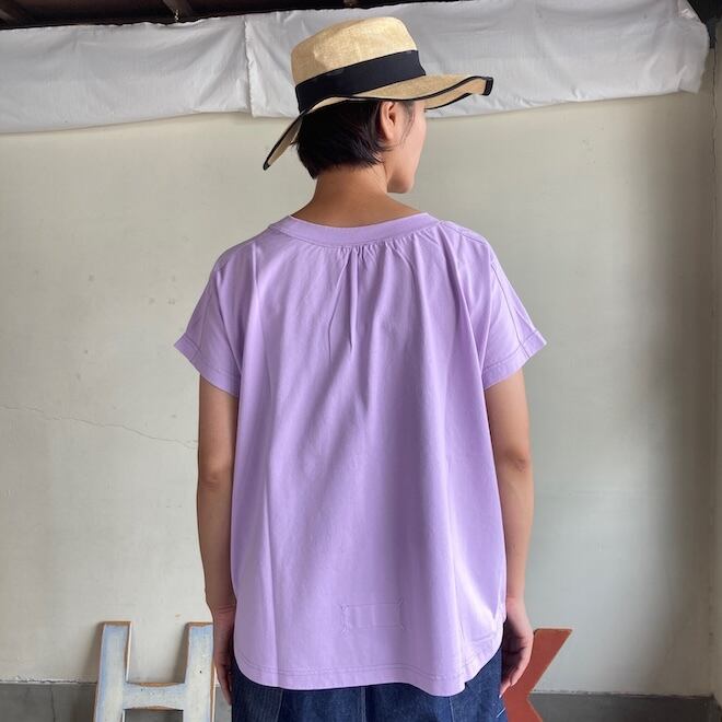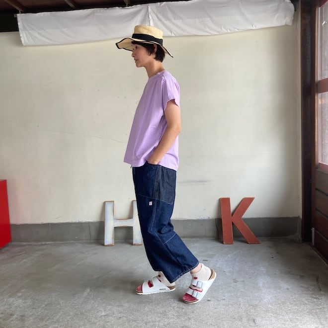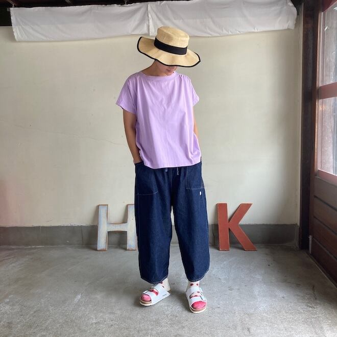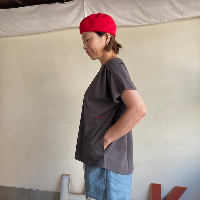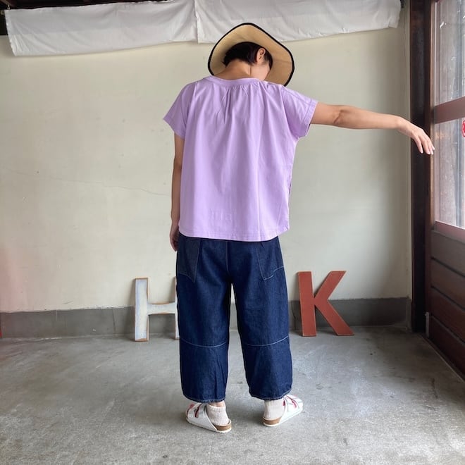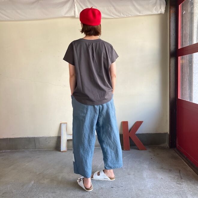 袖もすっきりとしておりますので、夏場の爽やかなTシャツとして一枚でも、サロペットのインナーなど重ね着にも活躍しそうな作品です。