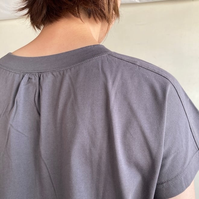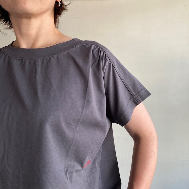 肩のギャザーがかわいい雰囲気のTシャツです。
