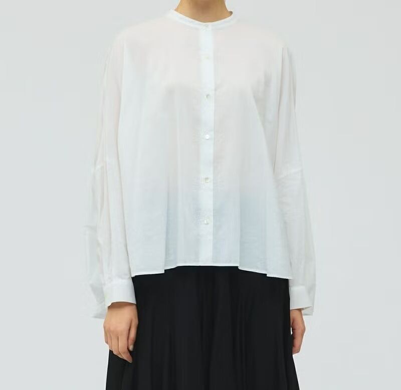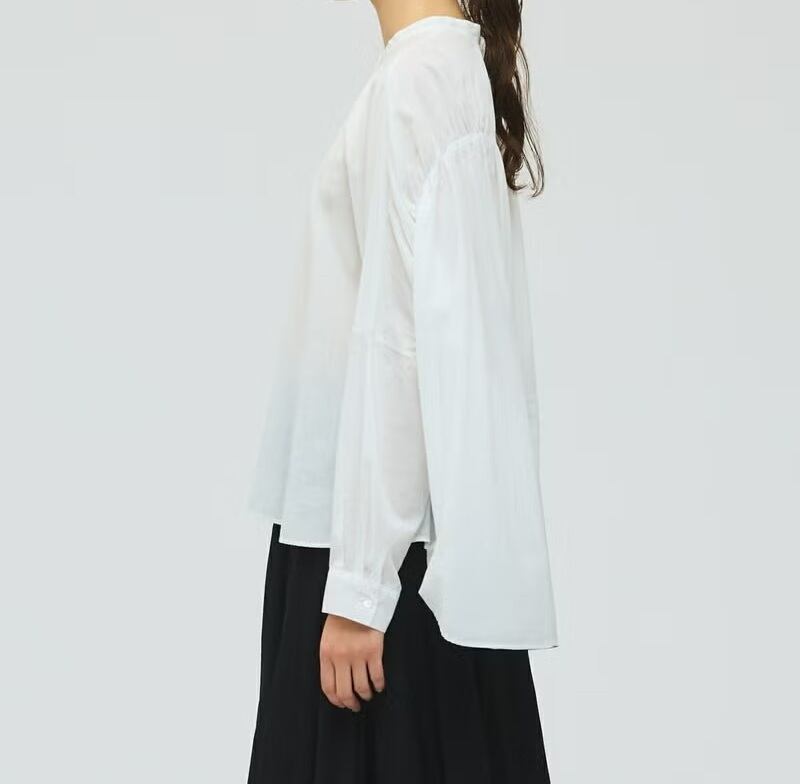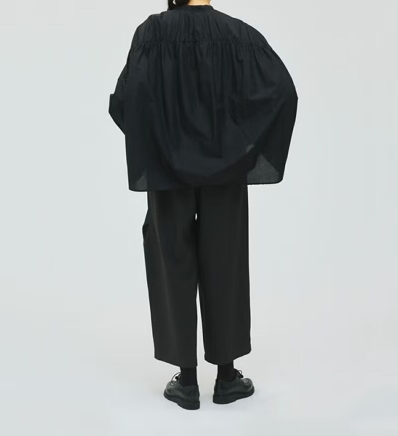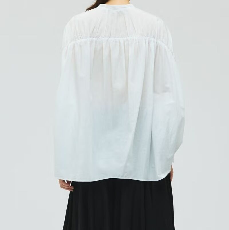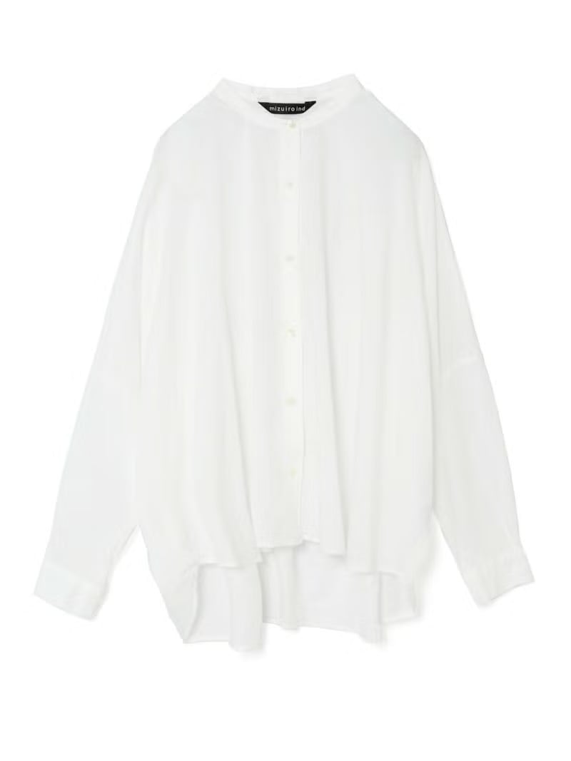 mizuiro ind人気のバックギャザーワイドシャツです。柔らかでナチュラルなコットンは軽さと透明感のある素材の為透け感がございます。フロントはスタンドカラーですっきりとしたシンプルなスタイル。バックは肩から施したギャザーでふんわりとした女性らしいシルエットがしなやかに揺れる魅力あるシャツです。シーズンを通して長く愛用できるのもポイント。羽織としてコーディネートしても素敵です。mizuiro indのお勧めのシャツです。