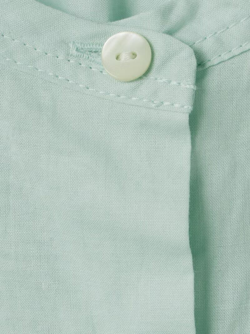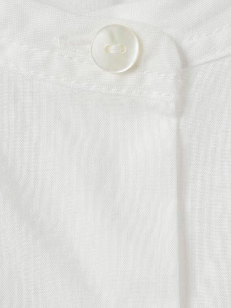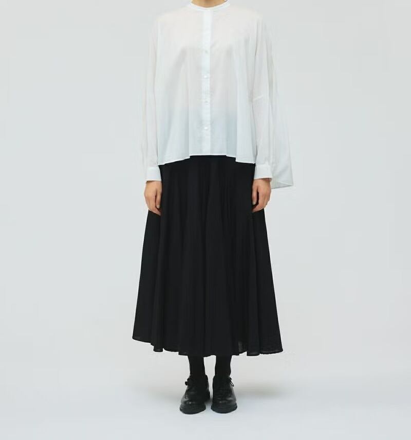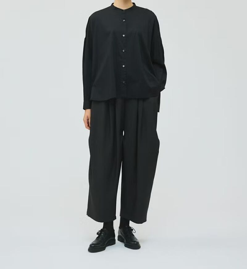 mizuiro ind人気のバックギャザーワイドシャツです。柔らかでナチュラルなコットンは軽さと透明感のある素材の為透け感がございます。フロントはスタンドカラーですっきりとしたシンプルなスタイル。バックは肩から施したギャザーでふんわりとした女性らしいシルエットがしなやかに揺れる魅力あるシャツです。シーズンを通して長く愛用できるのもポイント。羽織としてコーディネートしても素敵です。mizuiro indのお勧めのシャツです。