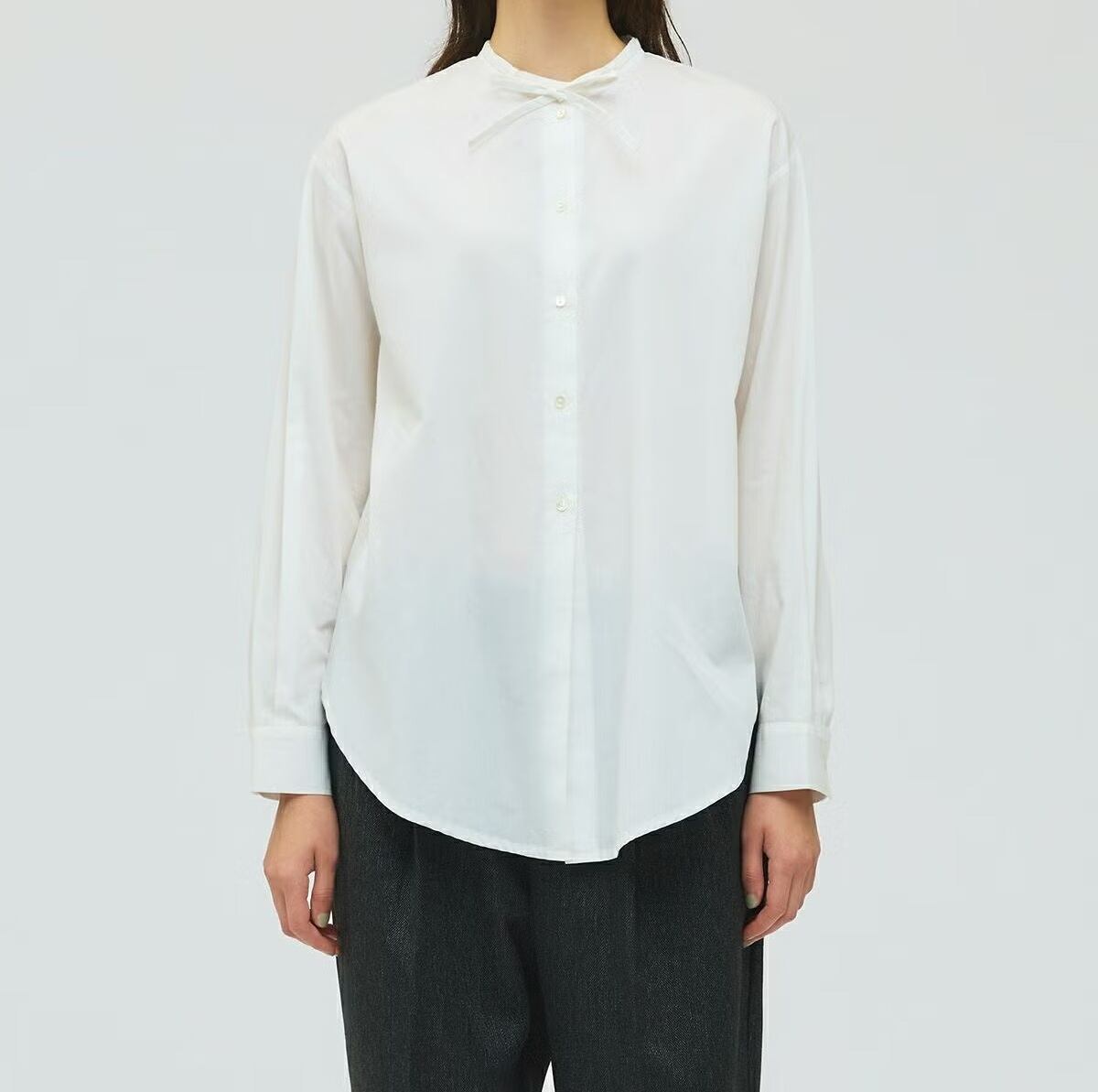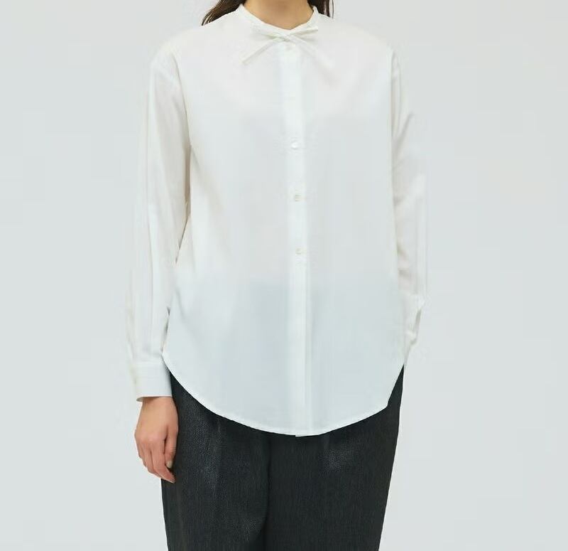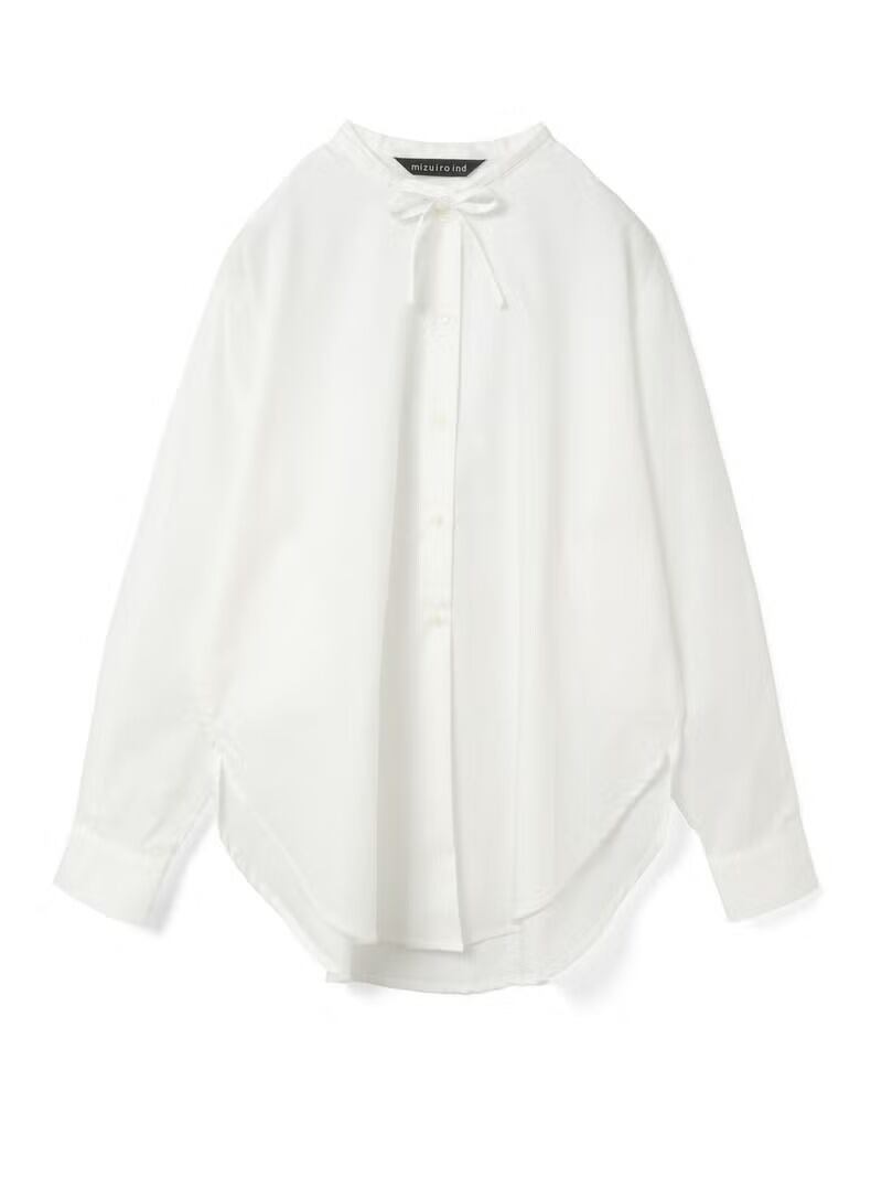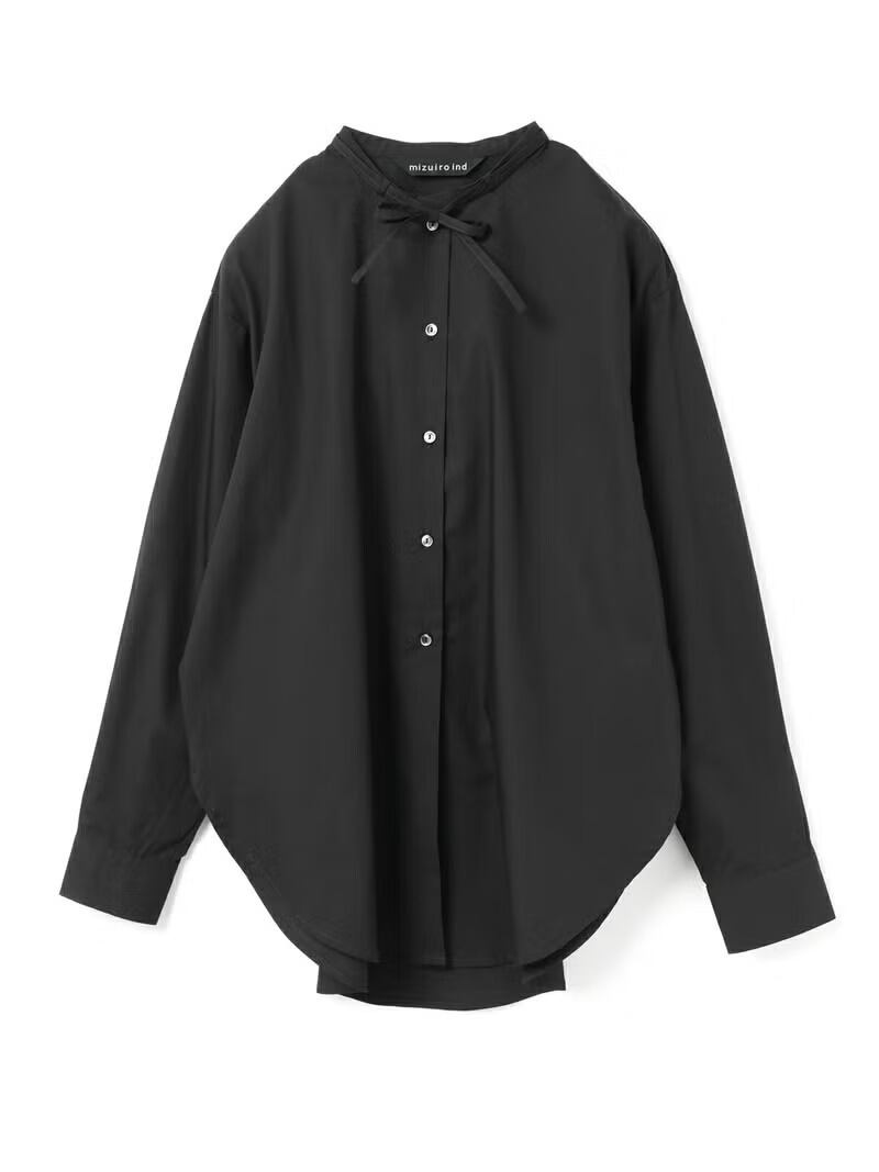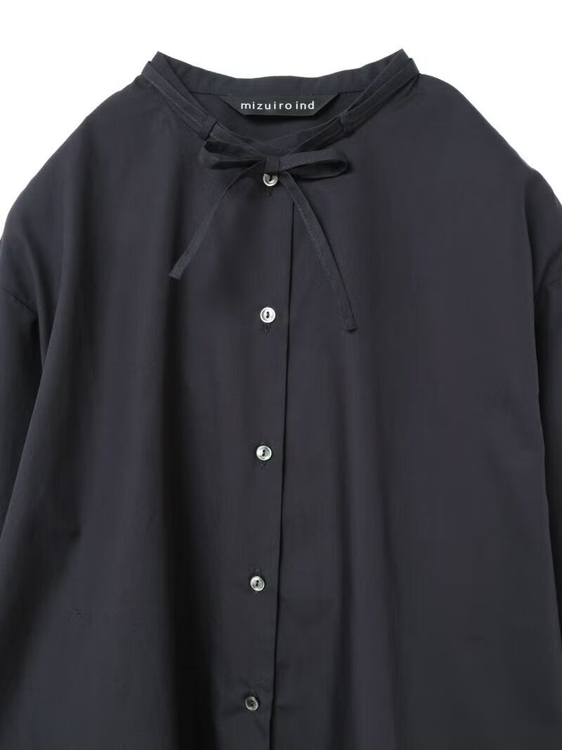 50ブロード素材を使用したリボンタイロングシャツです。mizuiro ind の人気型、細リボンの清楚な首元を演出したシンプルな1枚。ヒップの隠れる少し長めの丈感が特徴で丸みのある女性らしいシルエットを表現。サイドにポケットが付いているのもポイントです。程よいサイズ感で重ね着にも重宝していただける1枚です。