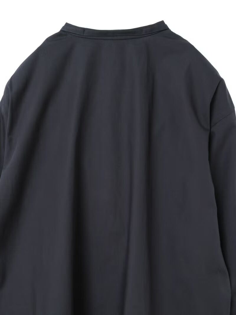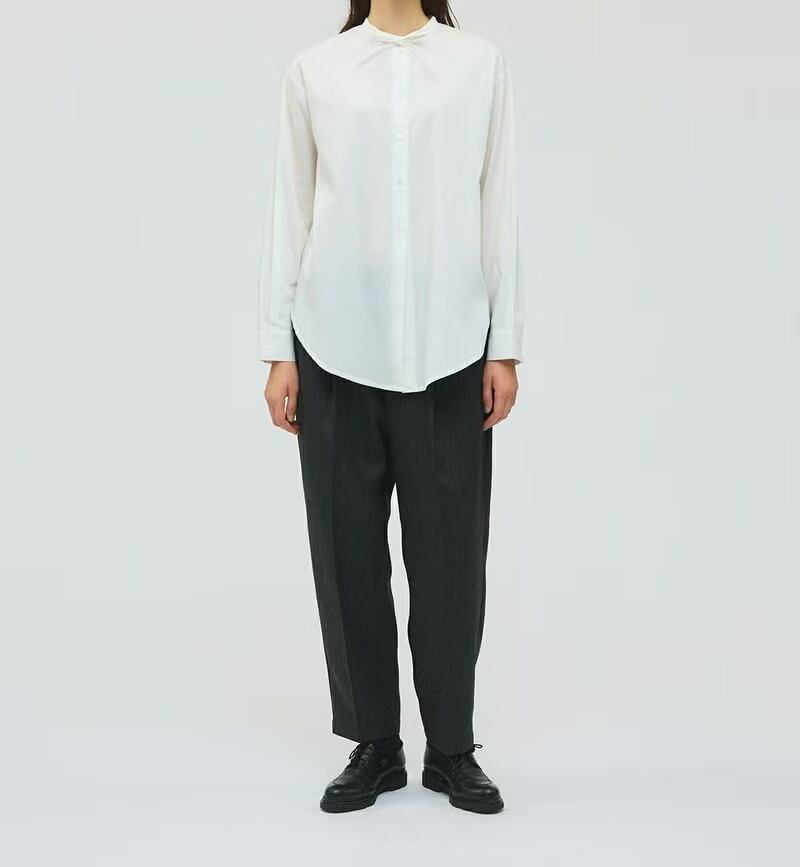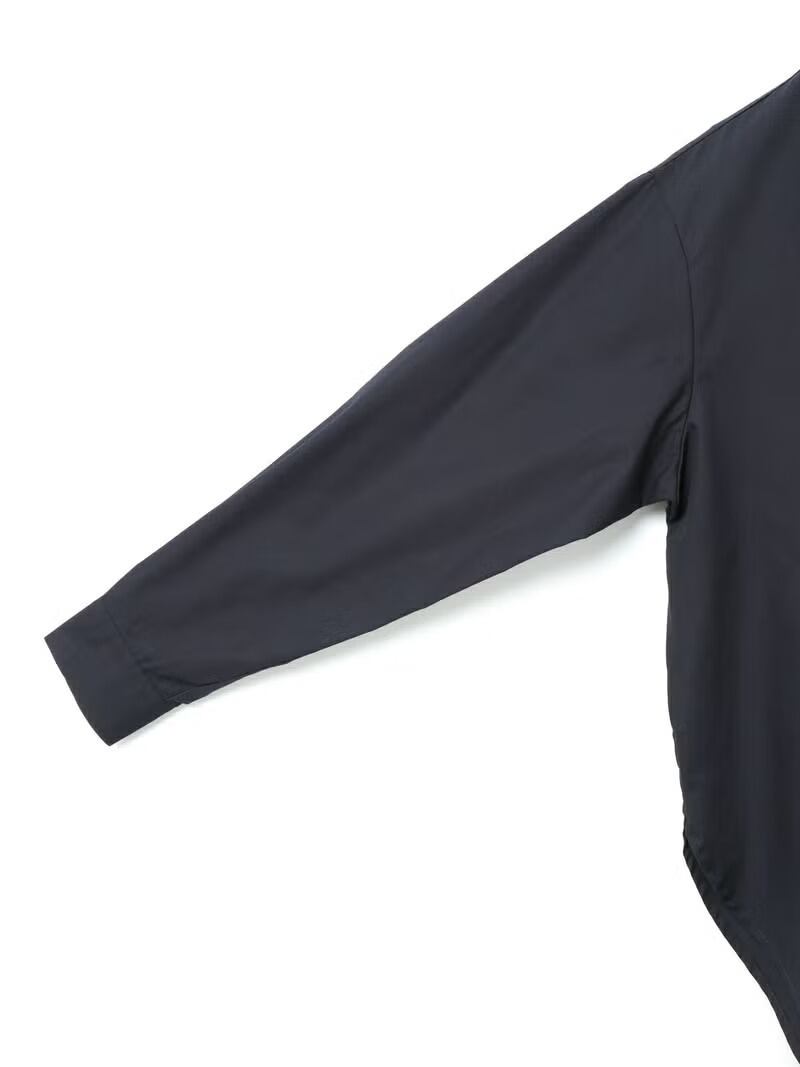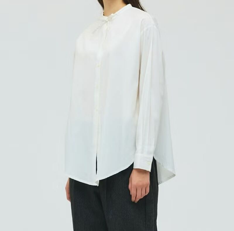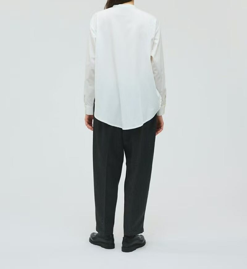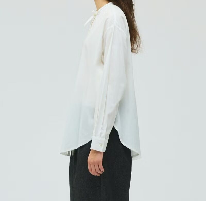 50ブロード素材を使用したリボンタイロングシャツです。mizuiro ind の人気型、細リボンの清楚な首元を演出したシンプルな1枚。ヒップの隠れる少し長めの丈感が特徴で丸みのある女性らしいシルエットを表現。サイドにポケットが付いているのもポイントです。程よいサイズ感で重ね着にも重宝していただける1枚です。