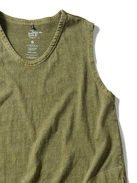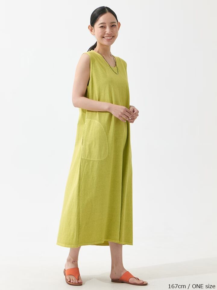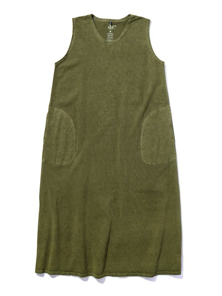 定番のTシャツ生地(5.5オンスジャージー)を使用した、ゆったりとしたAラインシルエットのノースリーブワンピース。