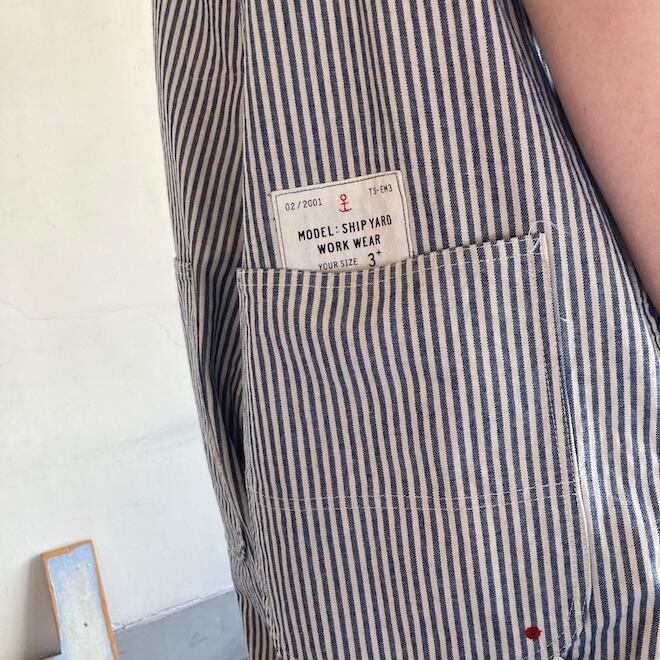オーバーオール以外は共通のデザインでインディゴデニムのグループもあります。ヒッコリーはストライプ柄に織られたデニムですが、このグループは生地の裏側を表にしてストライプのコントラストを抑えています。そのため長く着ているようなヴィンテージ感があるワークウェアになりました。でも生地に少しハリがあるのでだらしなさが全くなくて、すっきりシャッキリとしています。