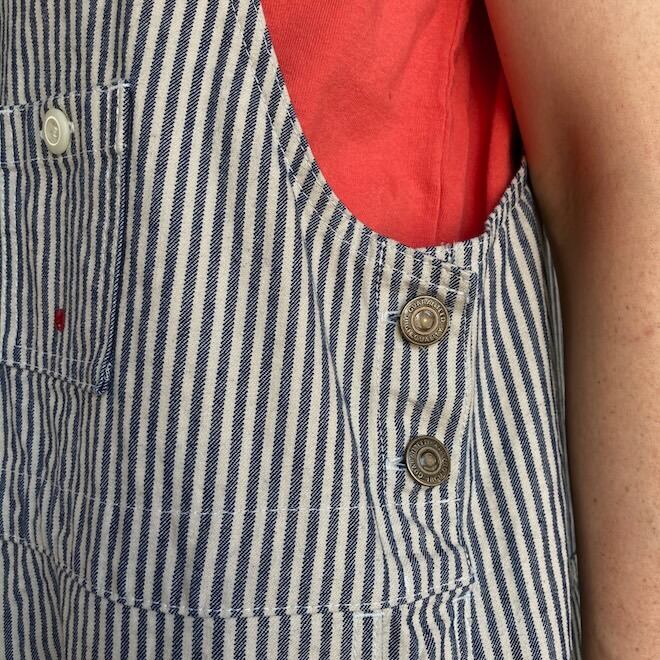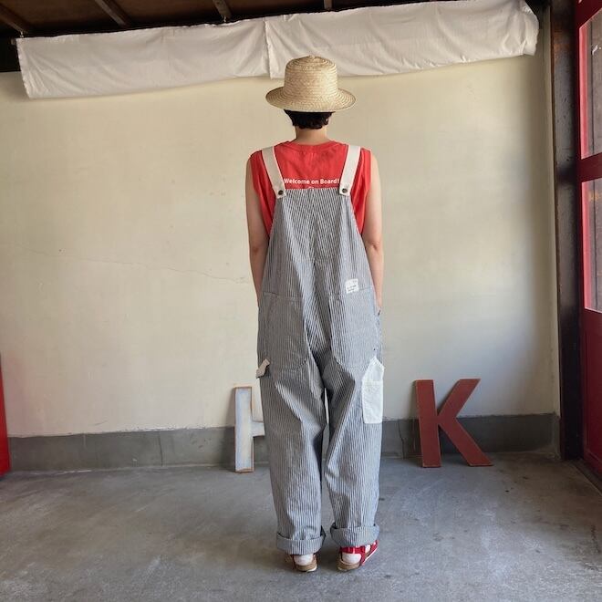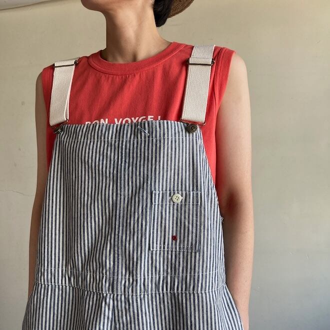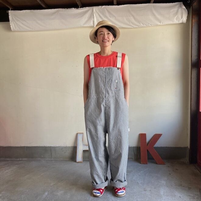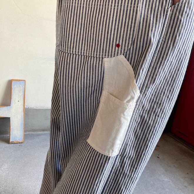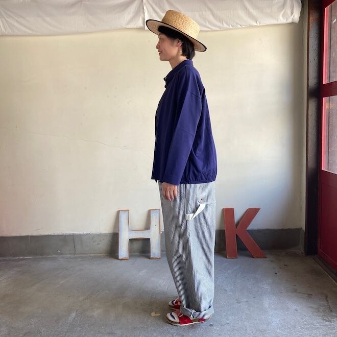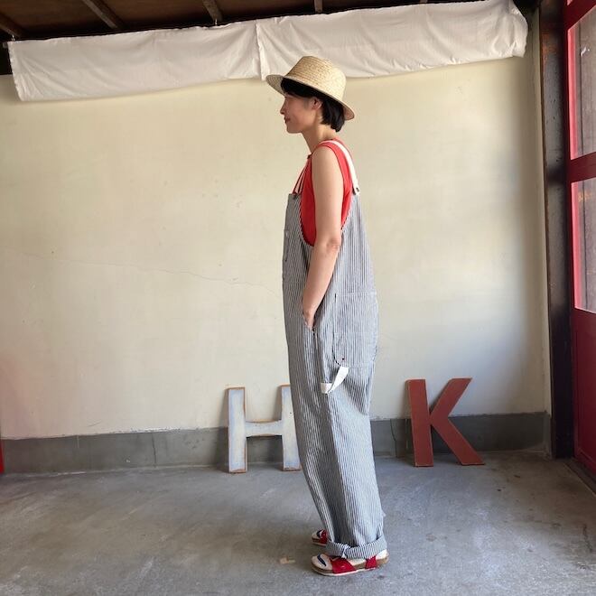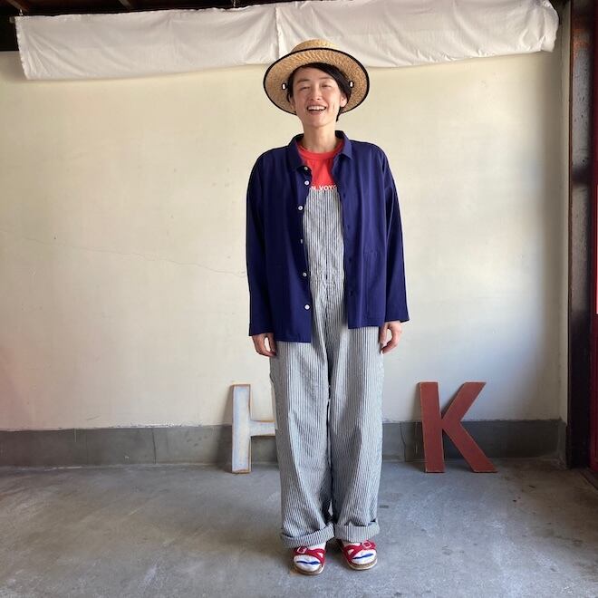 こちらのオーバーオールはデニムやホワイトデニムなどでセレクトしており、好評でしたのでヒッコリーも積極的にオーダーいたしました。ルーズなシルエットとワークテイストの肩ベルトがとてもかわいいので、ヒッコリーの生地の雰囲気と相まって、クラシックなのに個性的な一着なのかなと感じております。