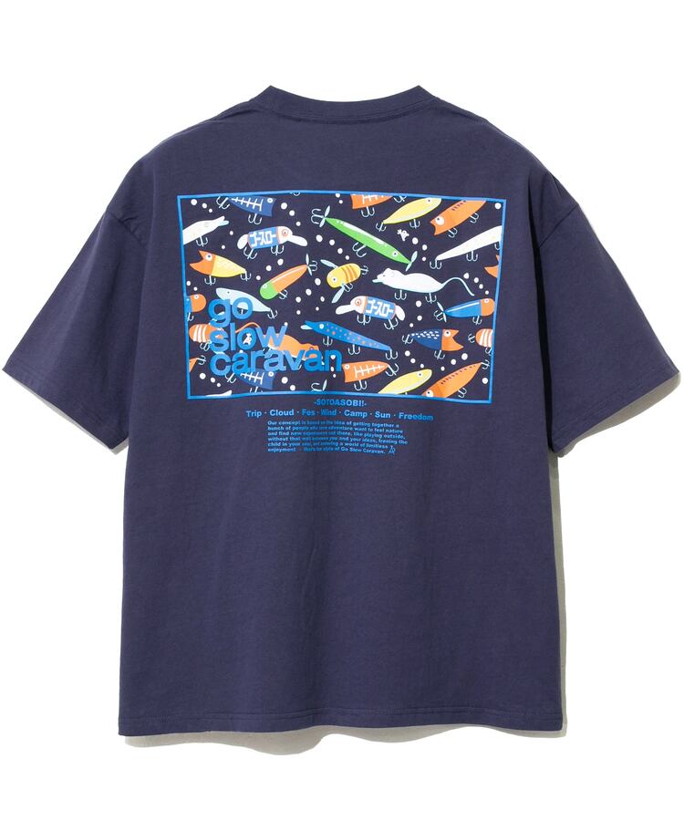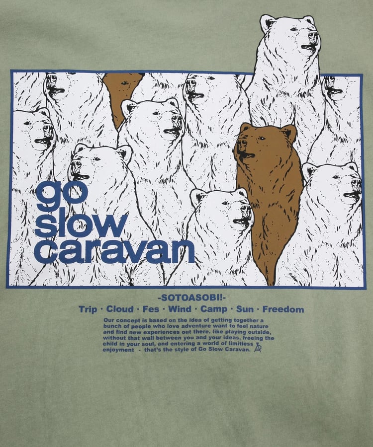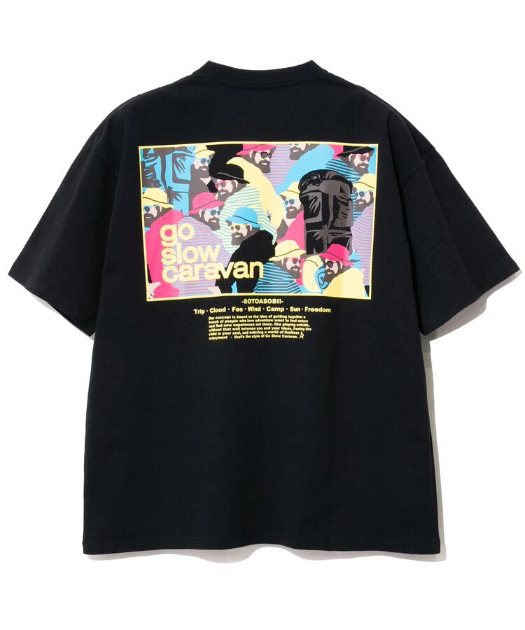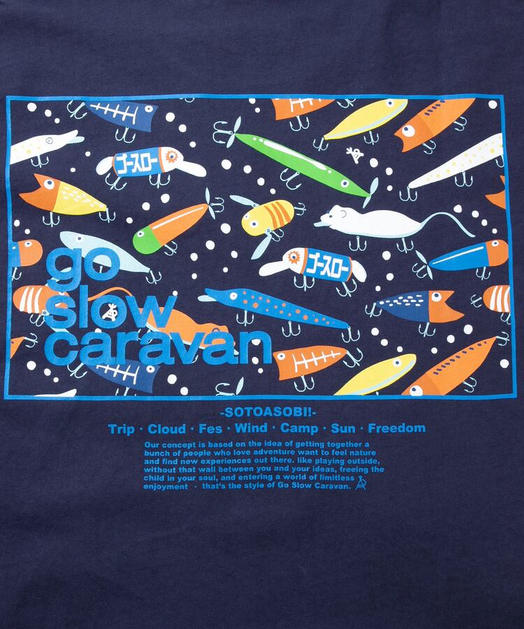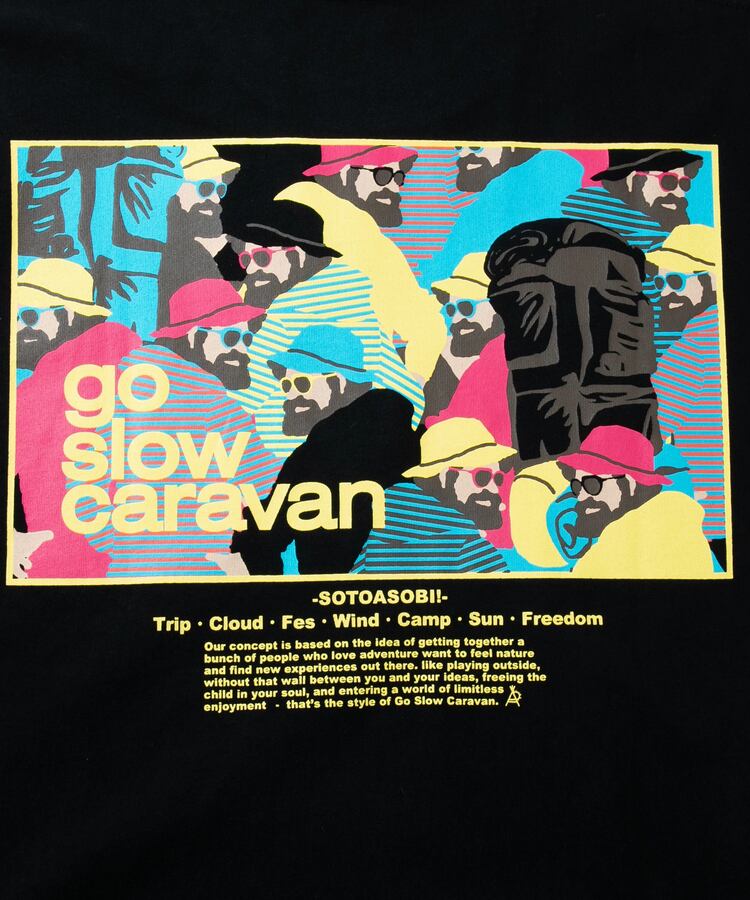 Tシャツのバックプリントにはゴースローキャラバンを代表する柄達をスクエアに切り取りコンセプトを添えました。胸には控えめなロゴプリント。