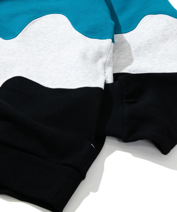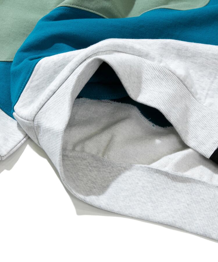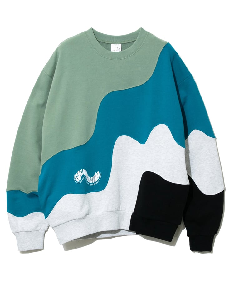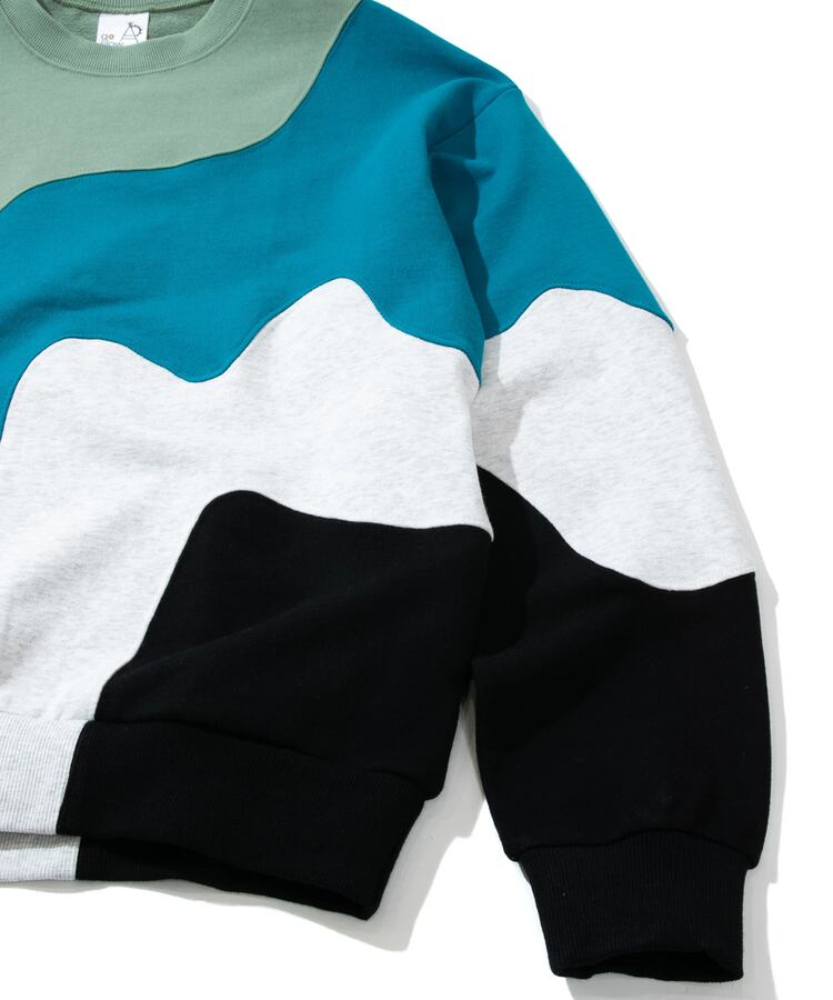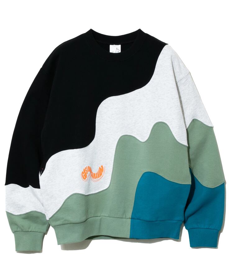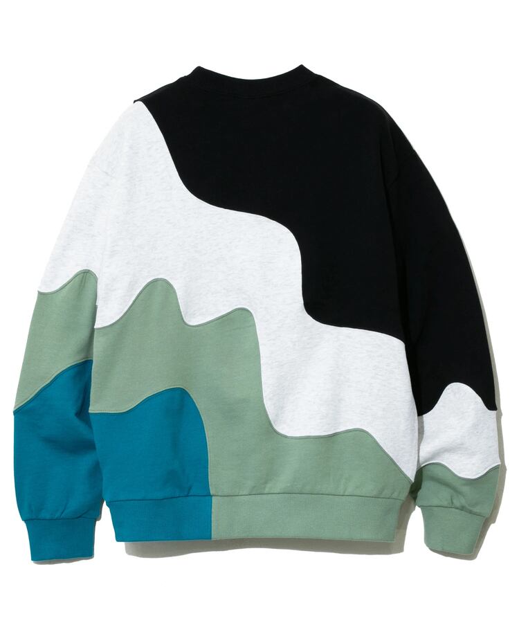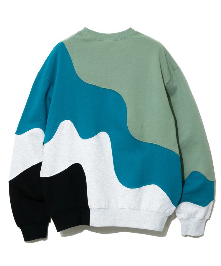 グネグネとWAVE状に切替たクルースウェット。贅沢に4色の生地を使い、難しい曲線の縫製をふんだんに取り入れ、手間をかけたデザインアイテム。