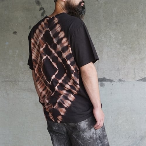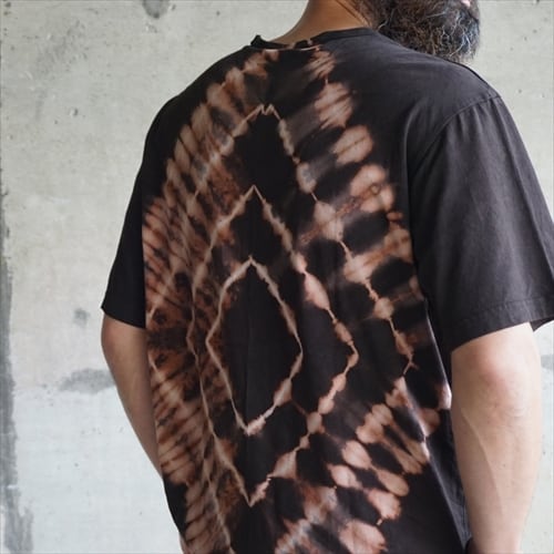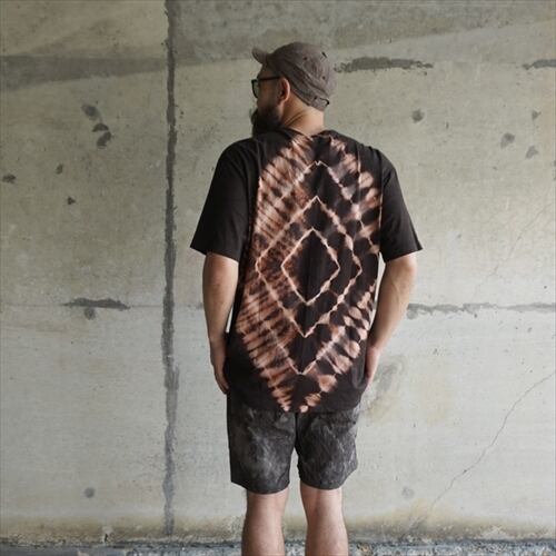 絞り染めでにじんだような幾何学模様を表現した、手仕事ならではの魅力にあふれるTシャツに。存在感のあるバックの染色を引き立てるため、フロントはアマミノクロウサギの刺繍を施しただけのシンプルなデザインに。