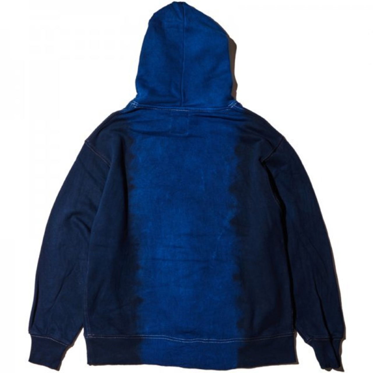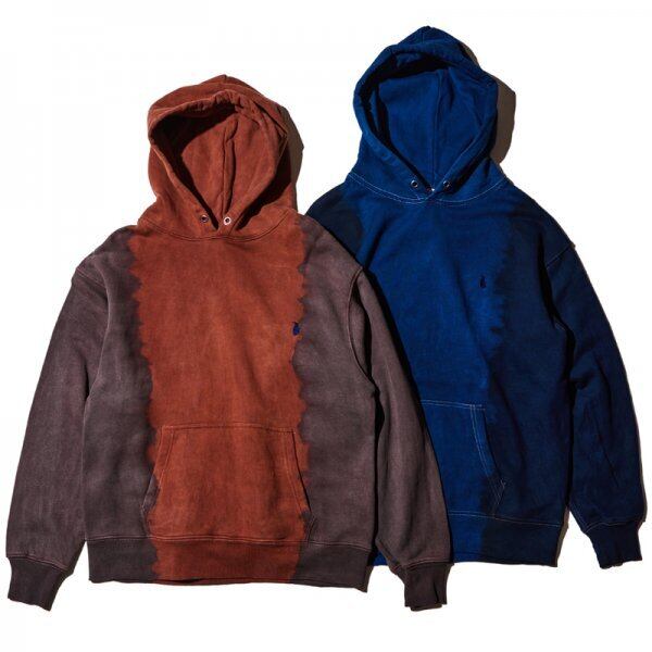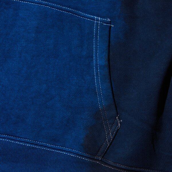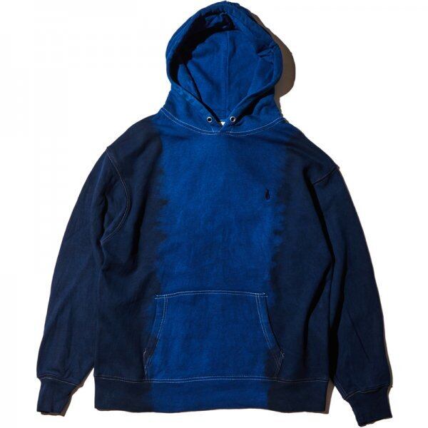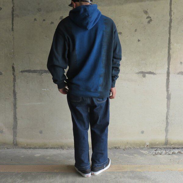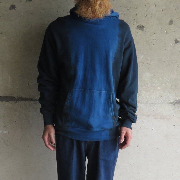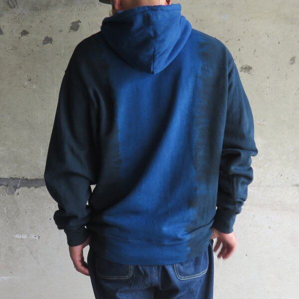 伝統工芸『泥染』と藍染を用い、染色回数に変化をつけグラデーションに仕上げたプルオーバーパーカー。当店では藍染めを基調としたNAVYをセレクトしました。藍泥染めと藍染めとの濃淡のコントラストが美しい作品です。