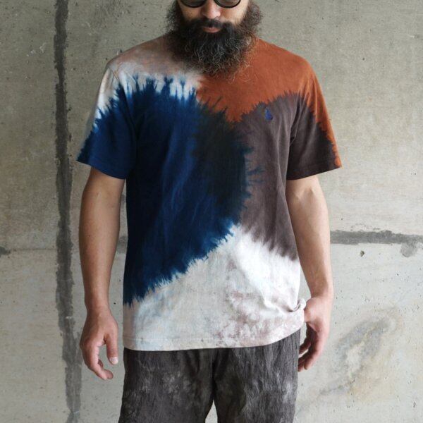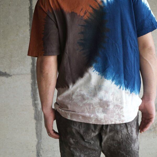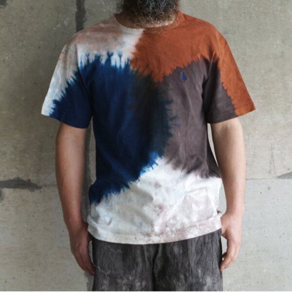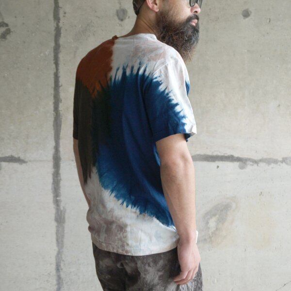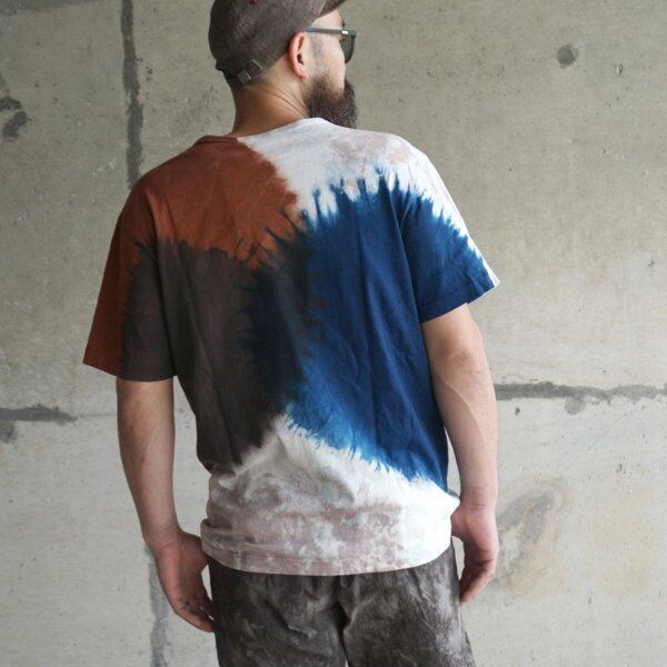 当店では2019年からセレクトしており、唯一無二の染色方法によって表現された個性的な特徴に魅了されたファンから根強い人気を得ています。奄美大島の大自然の中で培われた天然染料である泥染め、藍染めを手染めで仕上げていく染色の技術はもちろんのこと、落ち着いた印象でありつつ、トレンド性もバランスよく取り入れた作風のファッション性の高さも評価されています。普段の着こなしに取り入れやすいカジュアルアイテムにそれらが落とし込まれているのも魅力の一つです。