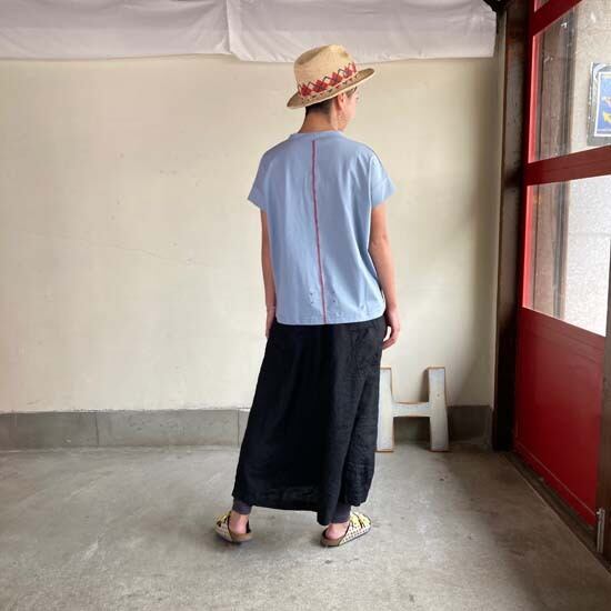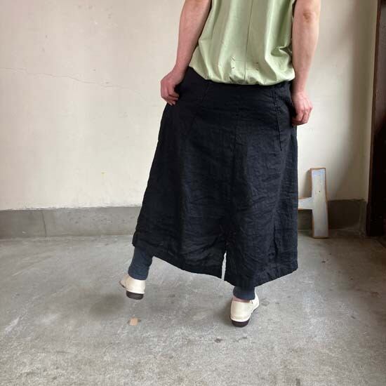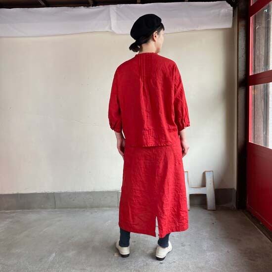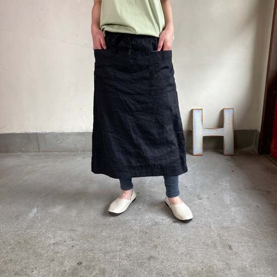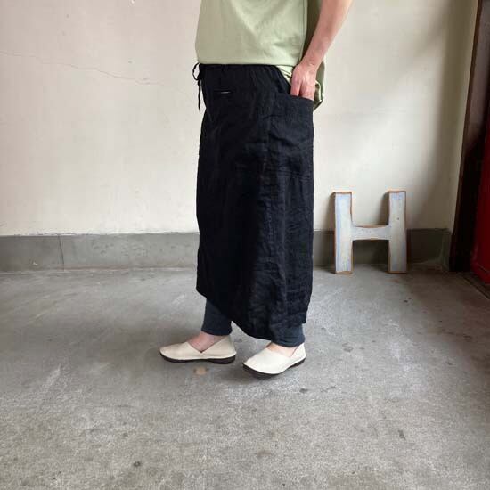こちらのスカートは、ポケットの仕様やカタチでいうとメンズライクな雰囲気を持った作品かと思います。ガーデニングの際に使うパンツやスカートをモチーフに作られるガーデナーパンツと言われるようなものに近いです。一般的にはこういった「ワークもの」の特徴は生地の厚みがあって、ガシッとした雰囲気や耐久性を重視したものが多いですが、上記したように快晴堂さんの軽やかな生地を落とし込むことにより、独特の雰囲気になっているのではないでしょうか。スカートは雰囲気が甘すぎて苦手!というお客様でも取り組みやすいような作品かと予想します。
