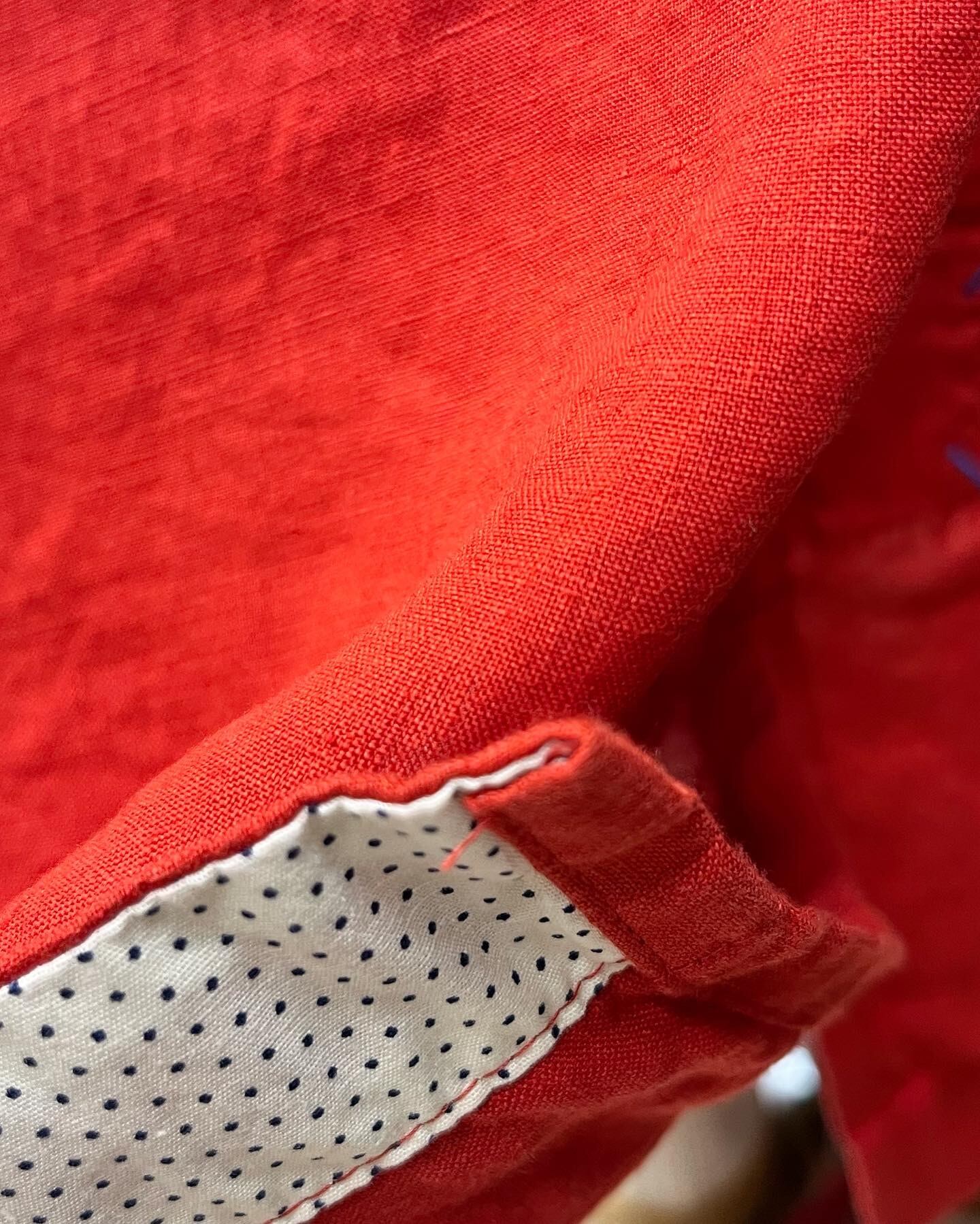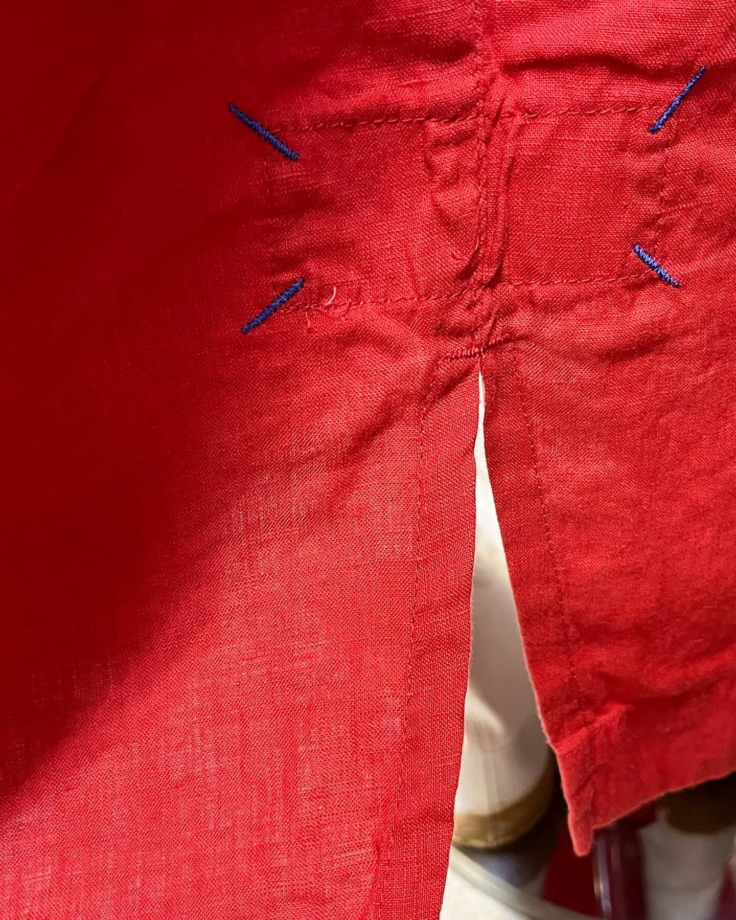 また、店頭でご覧いただける方はその細部の細やかさをじっくりと眺めていただければと思います。当店の解釈ですが、こういった柔らかく軽やかな素材は生地自体のハリがあまりない分、縫製を工夫しないとシルエットが保ちにくいです。お客様が試着された姿を拝見する限り、快晴堂さんの作品はそういった部分への配慮がみられるような気がします。