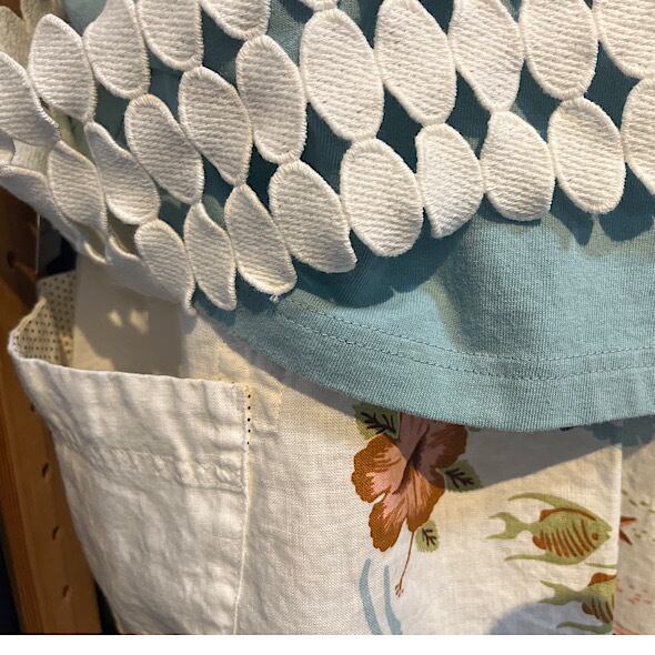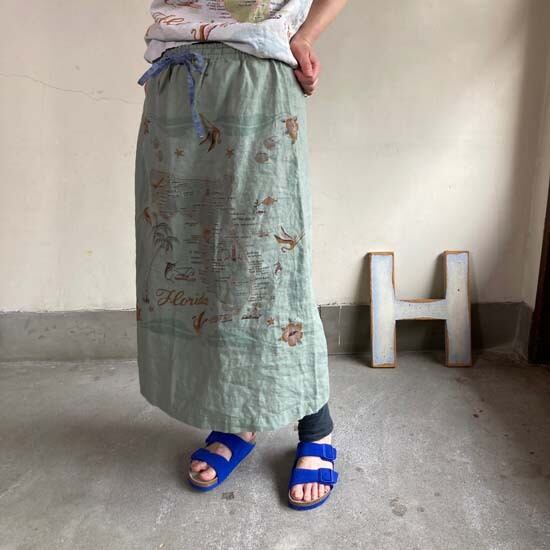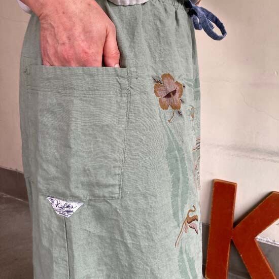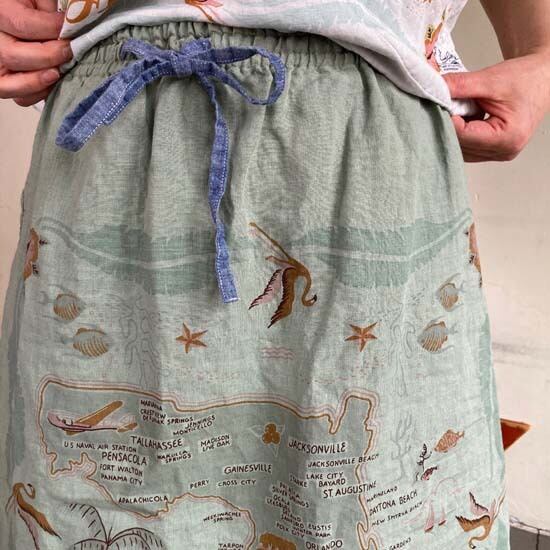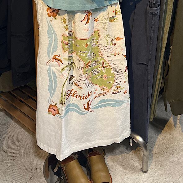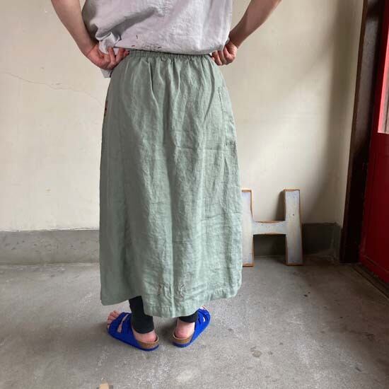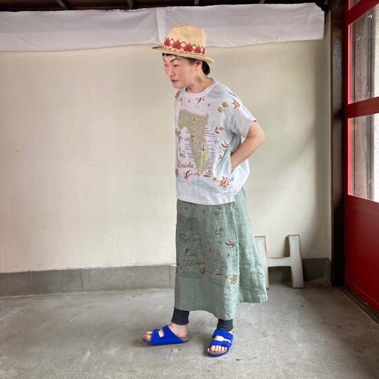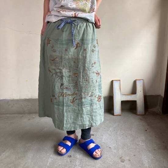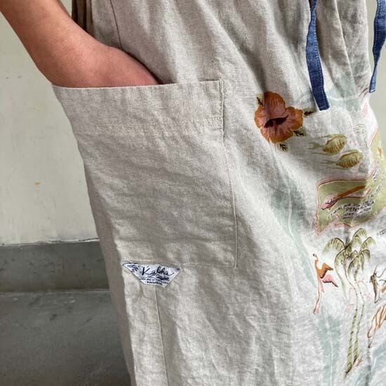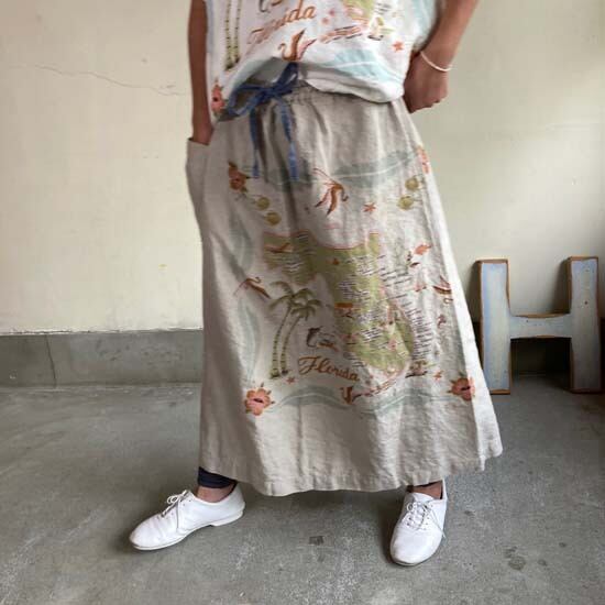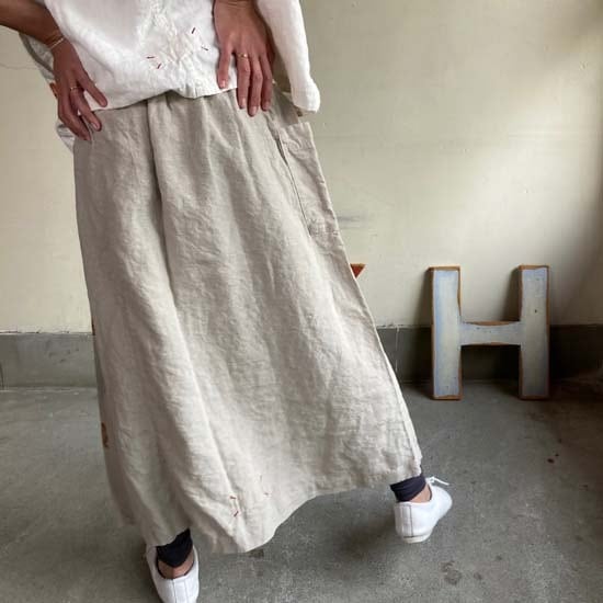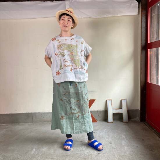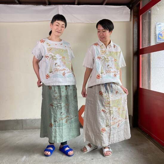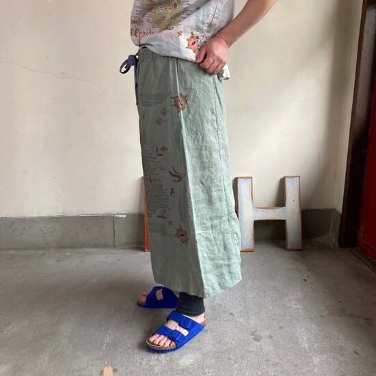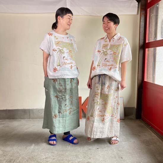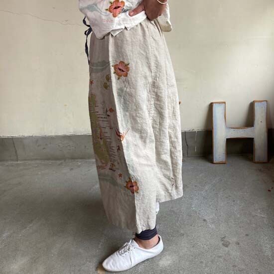 こちらの作品はパンツや前開きのトップスに比べて、プリントの柄がより表現しやすいとパターンです。途切れない一枚の絵として作品に落とし込まれていて特徴があります。また、ファインなリネンシリーズのスカートもそうなのですが、ポケットやカタチはワークっぽい作品なのですがジャパンリネンで仕上げることでとても大人っぽい雰囲気になり、かつ、カジュアルでもあるという絶妙な演出が好きです。