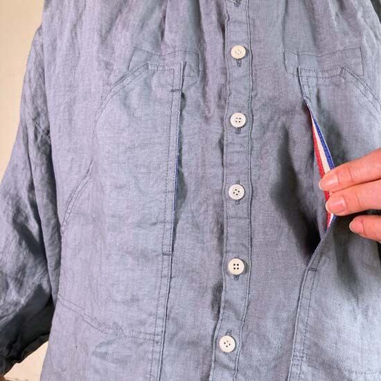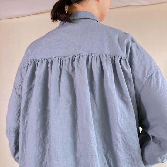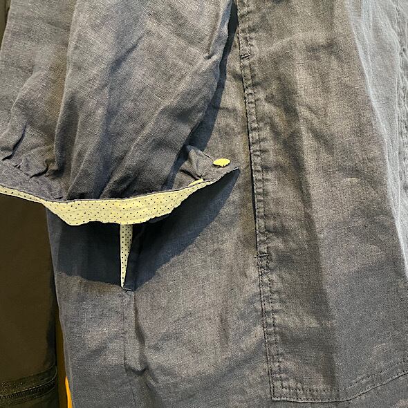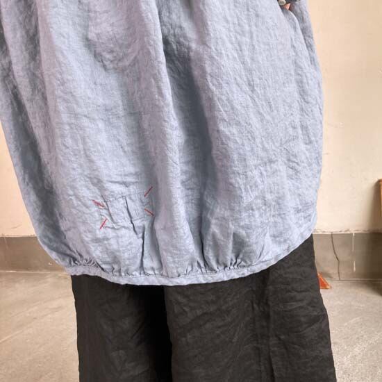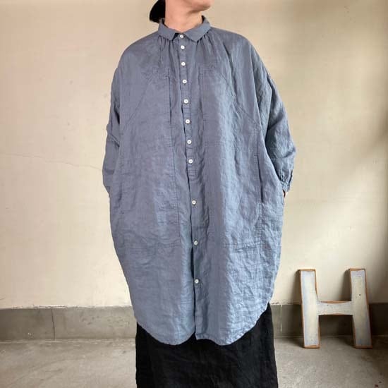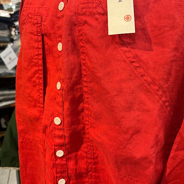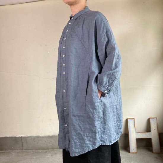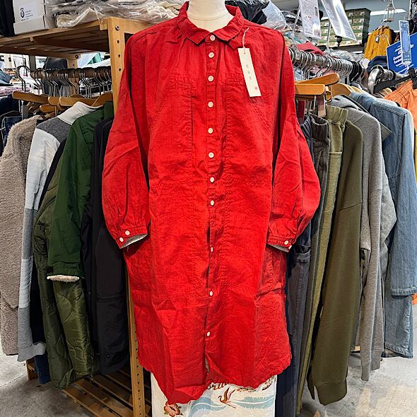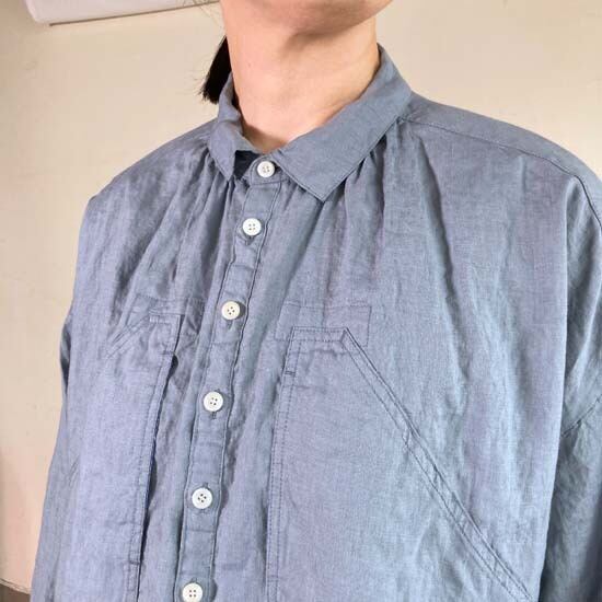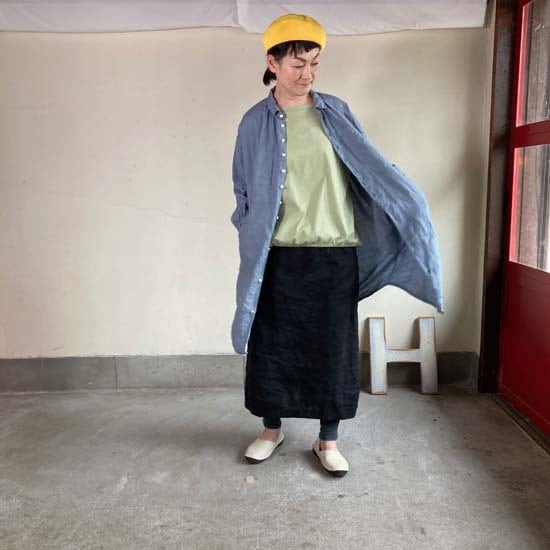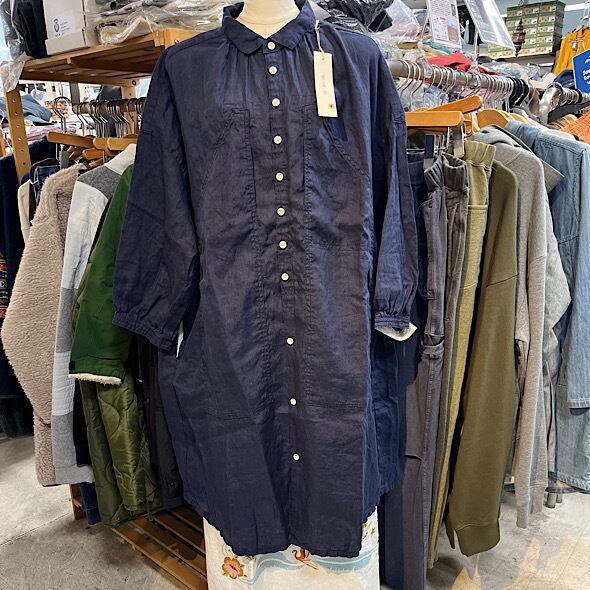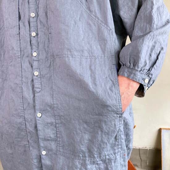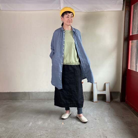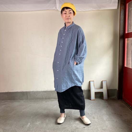 こちらのWorkポケ・ワンピースは作品名に冠されるワークっぽい雰囲気のポケットとベース生地の「ファインなリネン」の軽やかさが融合したバランスの良い作品かと思います。夏場のクーラー対策、日よけ、初秋の羽織ものとしても活躍しそうなカタチですし、着丈が長めのものでこういうカタチの作品は売り場でもおすすめしやすく重宝します。さらにそれが軽やかな生地で仕立てられているというのも安心感があるポイントでぜひ試着してみてほしいですね。