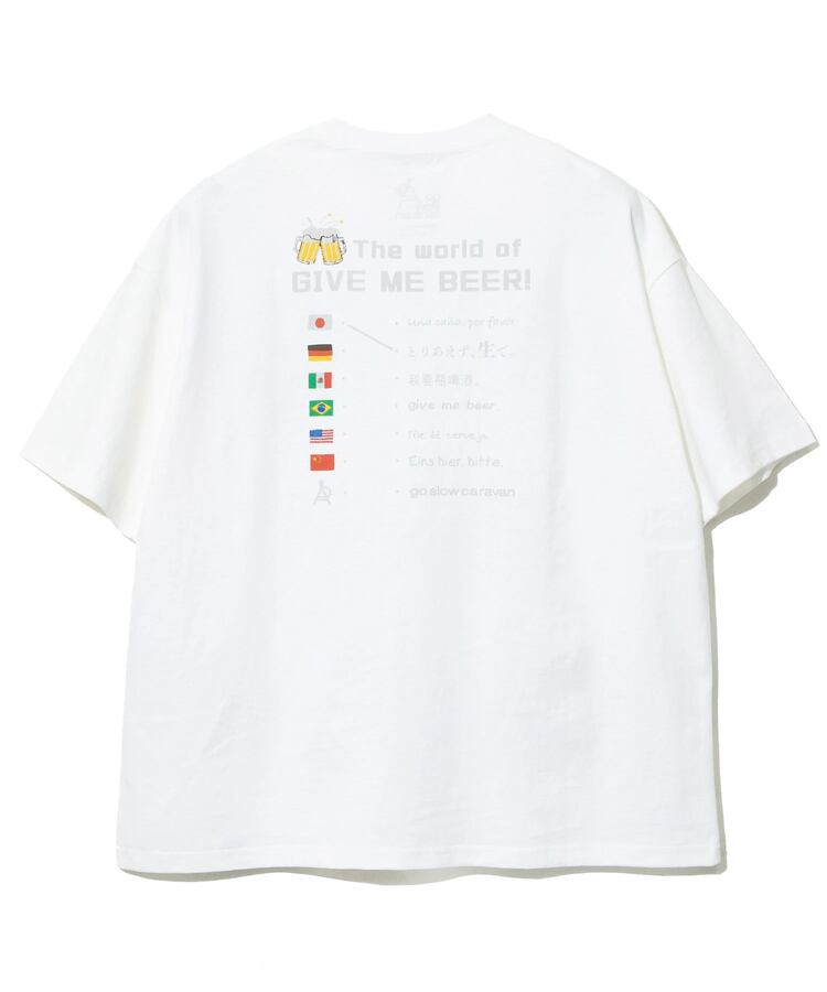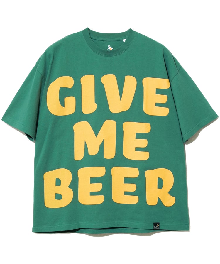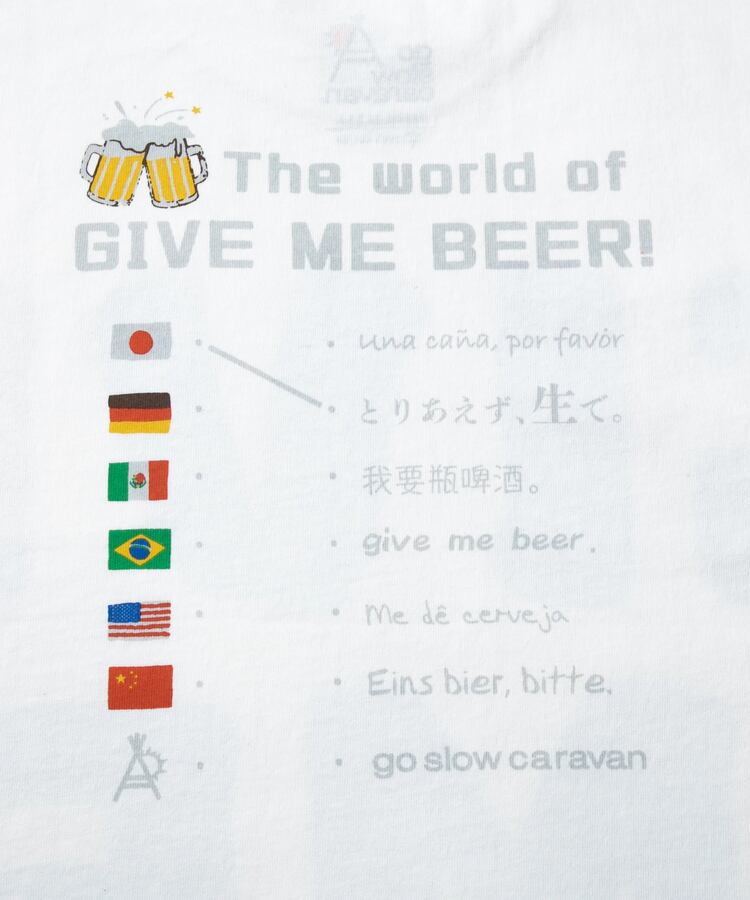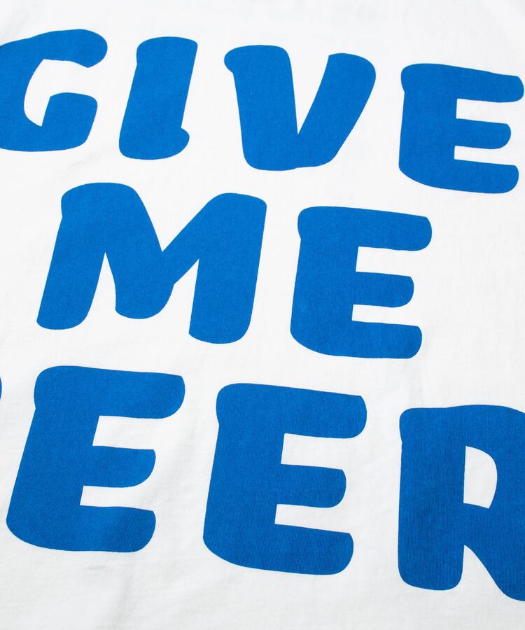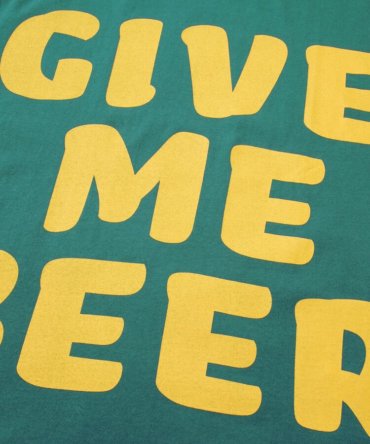 インパクト抜群のGIVE ME BEERプリント。着丈はベーシックで身幅が広め、ビッグTEEほどダボつかないシルエットのゆったりTEEになって復刻。バックプリントには世界のビールの頼み方のクイズ風プリント。