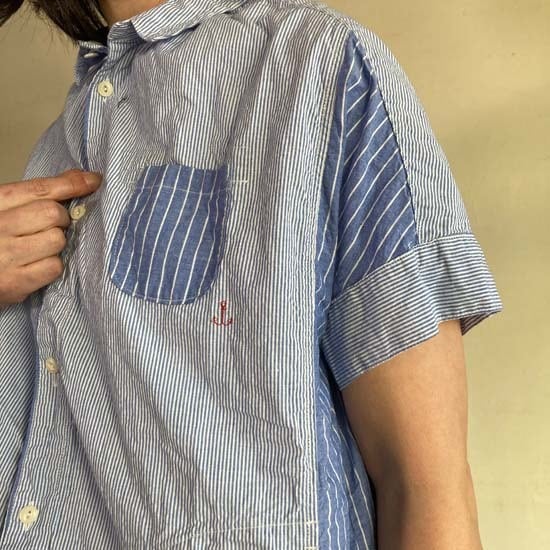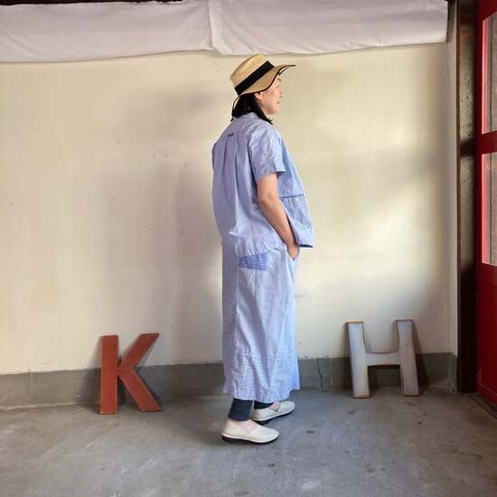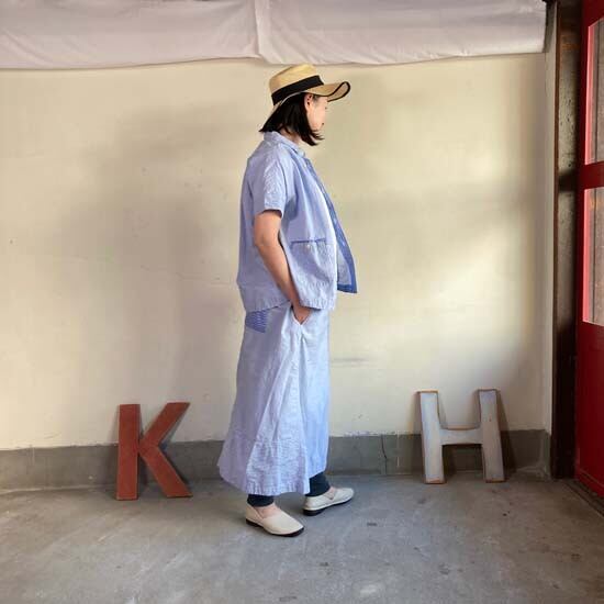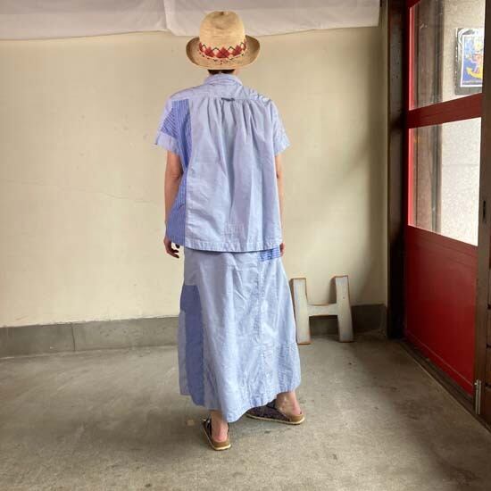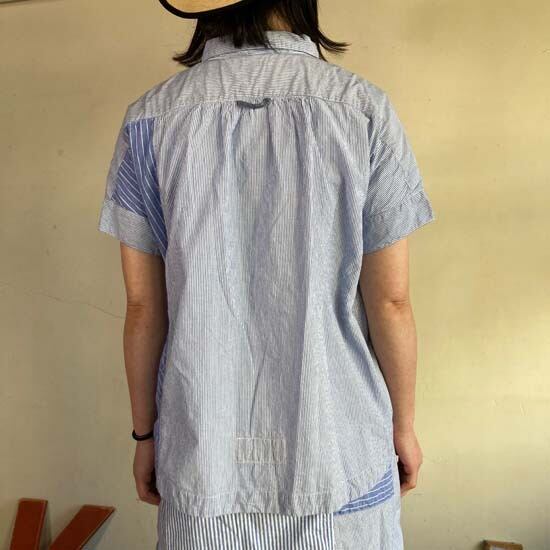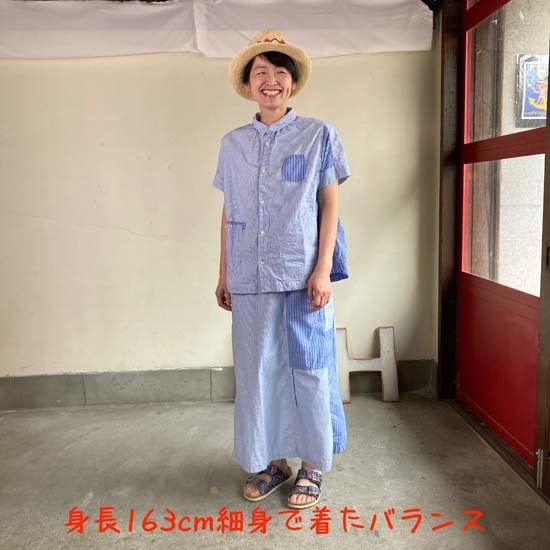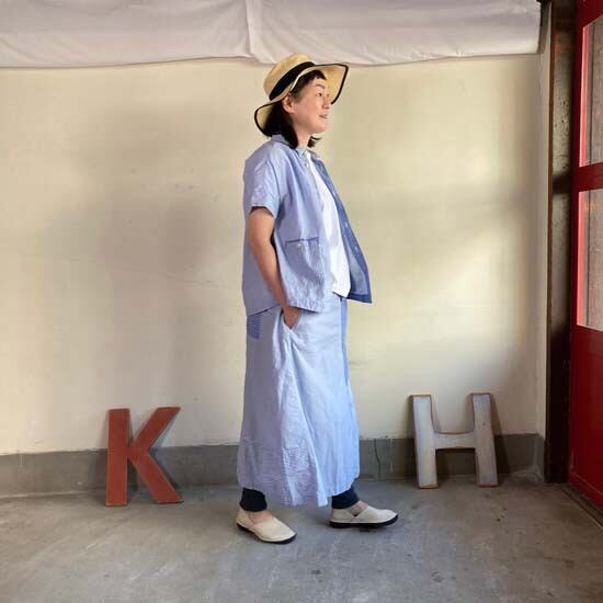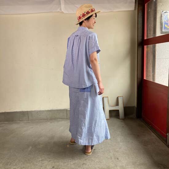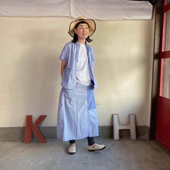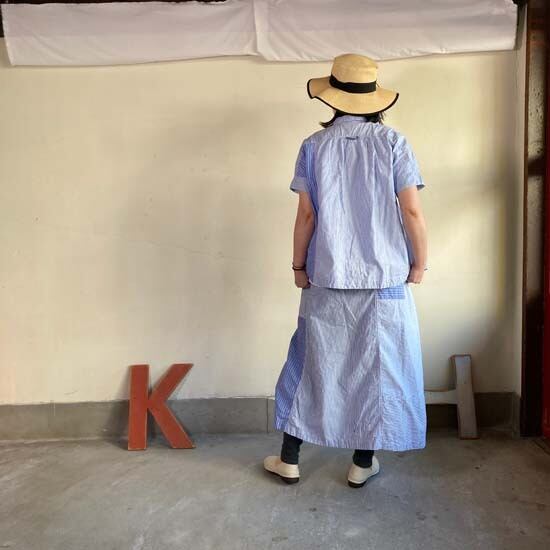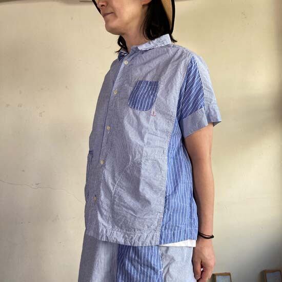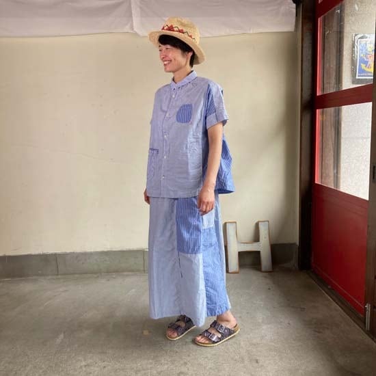 こちらのフレンチ半袖シャツは快晴堂さんではお馴染みのカタチですが、デニムパンツやスカートと合わせてシンプルに着こなしても良いですし、同生地のセットアップでも・・と思いセレクトしましたが、スカートは完売となっております。インパクトのある作品ですので個性的なおしゃれが好きな方、いかがでしょうか。