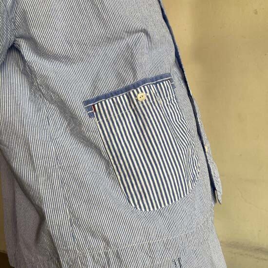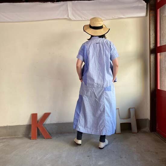 2021年に20周年記念で作ったブルーパッチワークの続編です。ブルーと生成りの2色の糸だけでボーダーのピッチを変えることによって変化をつけた3種類の生地を作ってもらい作品に落とし込んでいるようです。また、生地を使う部位によって縦と横の向きを変化させて、ストライプとボーダーのパッチワークのようにも魅せています。