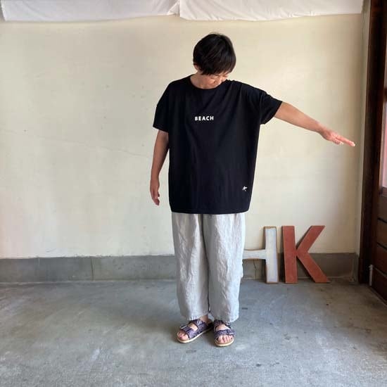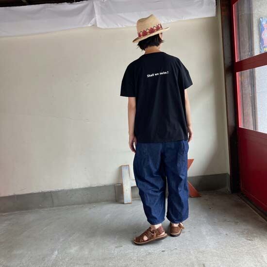 海から上がり、ほてった体でもさらりと着られ、風が通り抜けるようなサイズ感を活かすために、あえてカサカサした米国産の糸を日本で天竺に編み上げました。当店のお客様の間ではお馴染みのGood Onのtシャツのような生地感です。