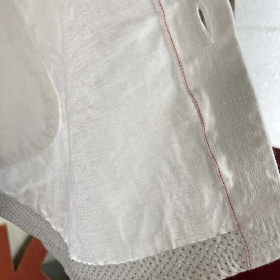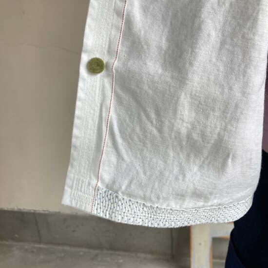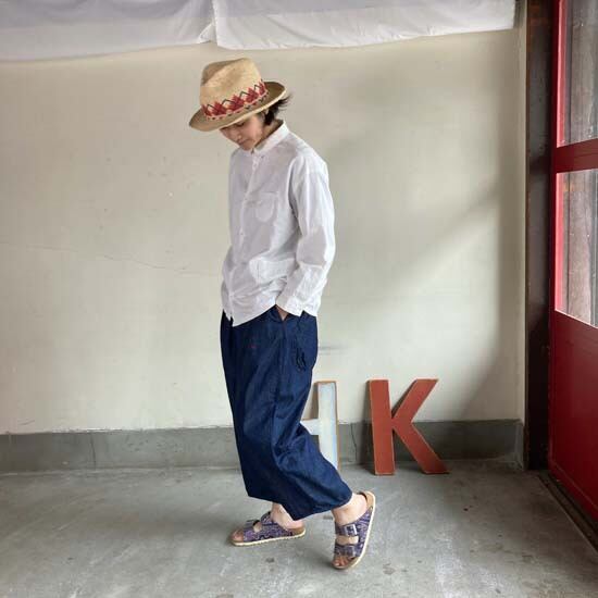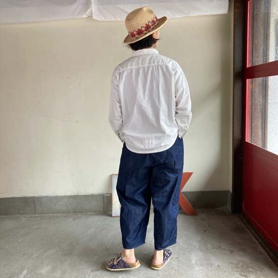 快晴堂さんと言えば、デニムのイメージは強いですが、デニムメーカーが作るようなものに比べて軽やかな作品が多く、こちらもオリジナルで作っているセルビッチデニムではあるもののコットンにリネンを20%入れることでデニムのコシはあるのにとても軽くて柔らかい生地に仕上がっています。新品の状態でもごわごわしなく、ずっと着ているかのような馴染みのある着心地を実現しています。
