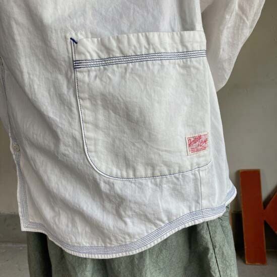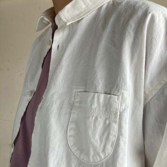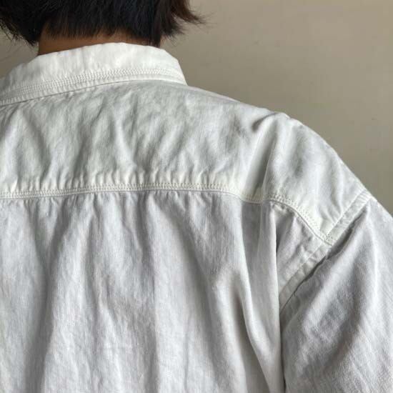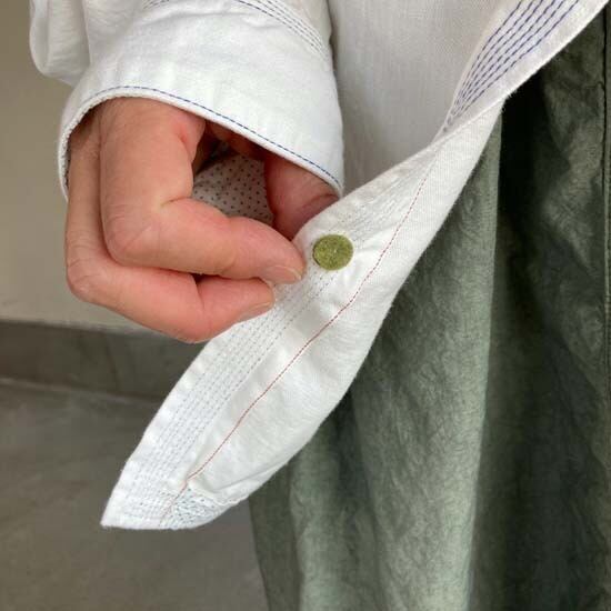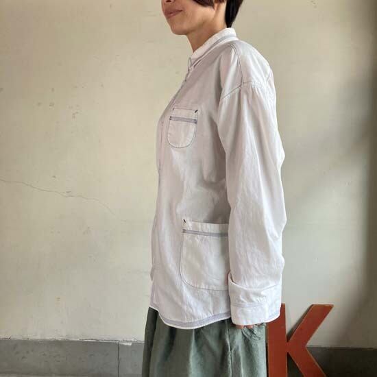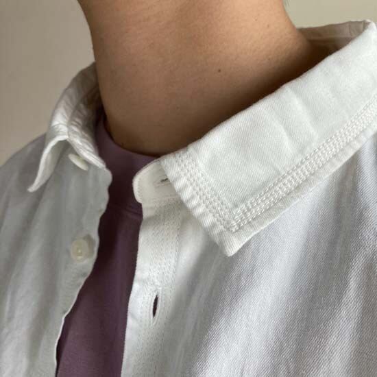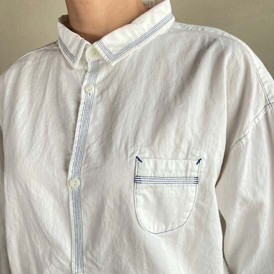 こちらのステッチ沢山ゆったり長袖シャツは要所要所にステッチをあしらうことで生地の立体感を演出しています。一見、メンズのワーク系のジャケットのようなしっかりとしたステッチですが、ゆとりのあるシルエットと上記の通りの生地の馴染みの良さが快適な着心地と軽やかさを実現しています。白なのでマリンコーデも良いですし、ナチュラルにもカジュアルにも合わせやすい万能な作品かと思いセレクトしました。