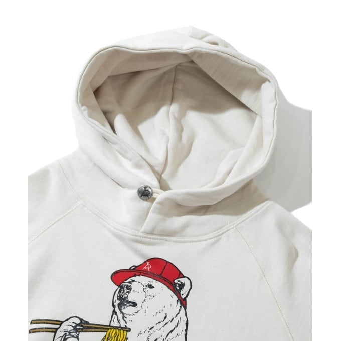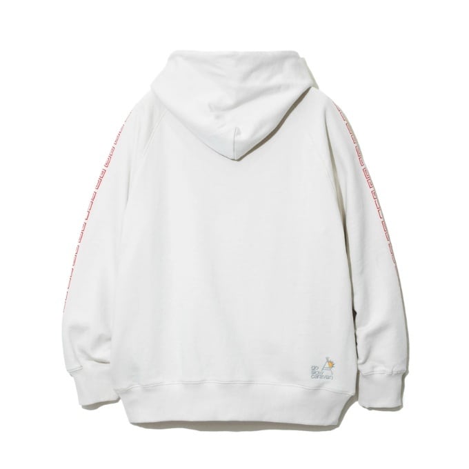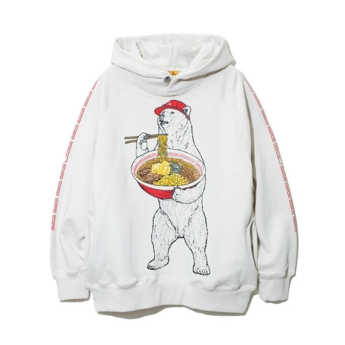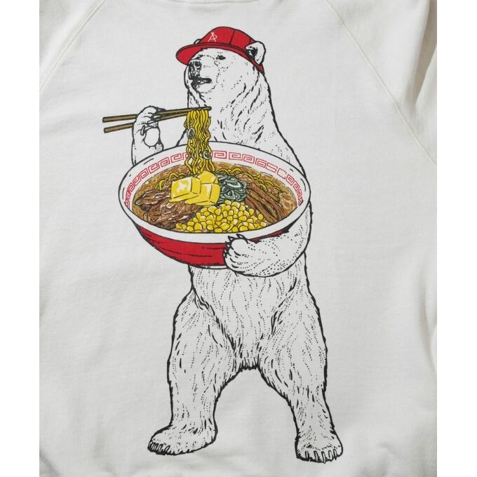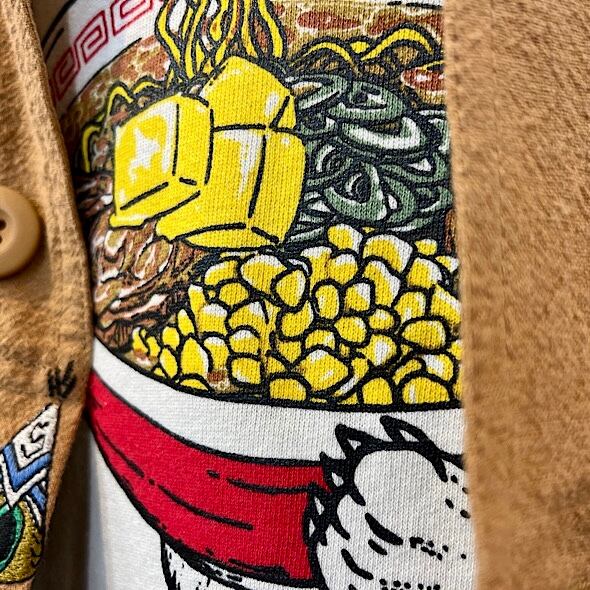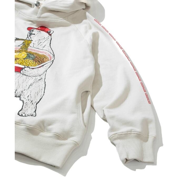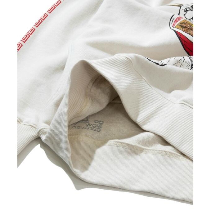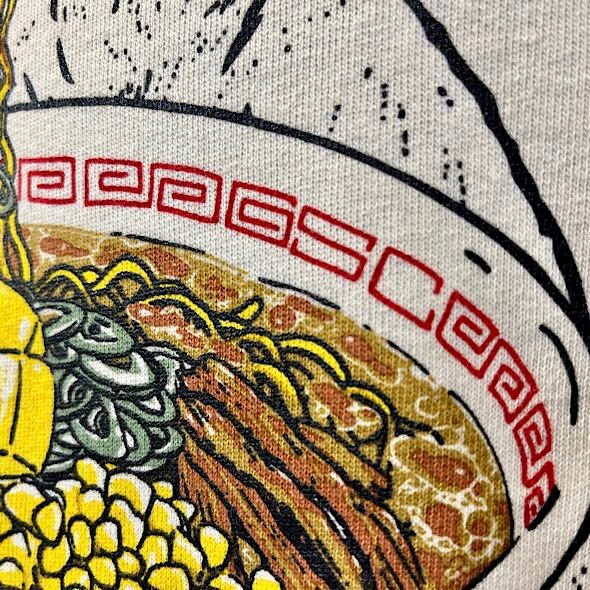 袖にはラーメン丼でお馴染みの雷文のラインプリント。バックサイドにはロゴ刺繍入り。