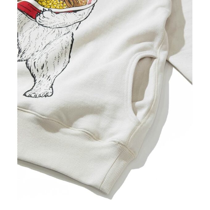 綿100%ヘビーウェイトの裏毛生地。表は空紡糸らしいガシッとした肌触りでありながら、裏のパイル面には太い裏糸を使用しているので空気を多く含みフワッと柔らかい着心地を実現。使い込むほどに風合いの増す生地。クラシック感のある長めのリブや3本針で丈夫な縫製などこだわりのディテールも取り入れた長くご愛用いただけるアイテム達です。